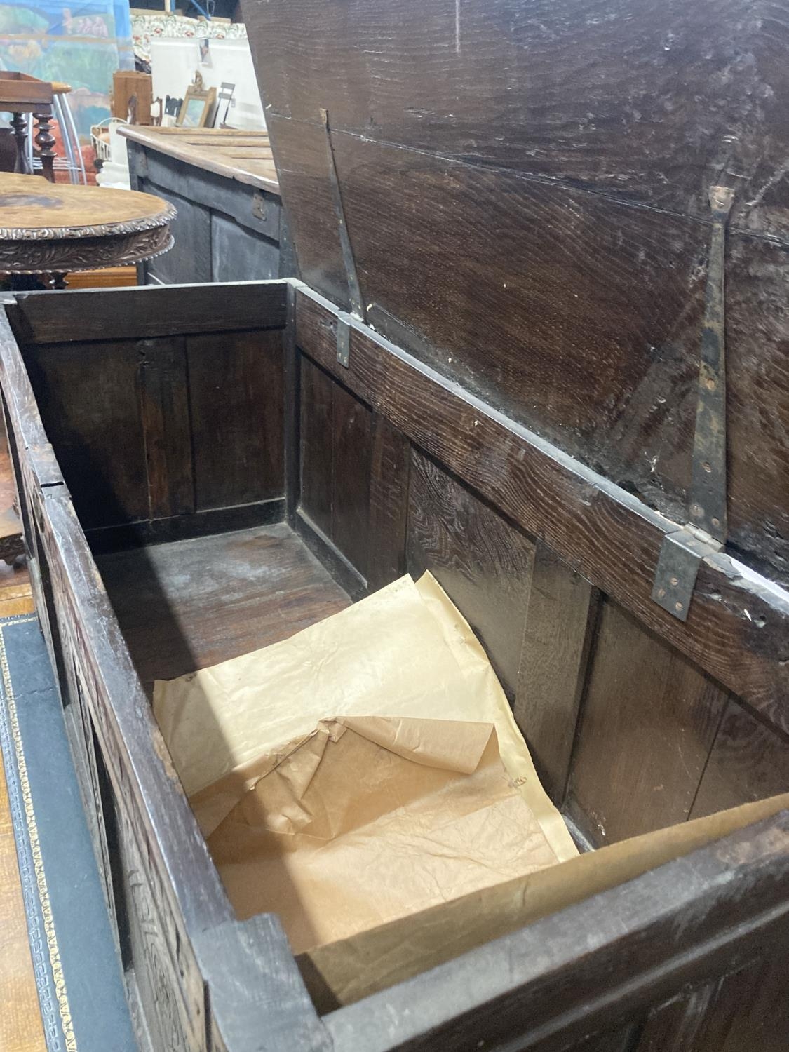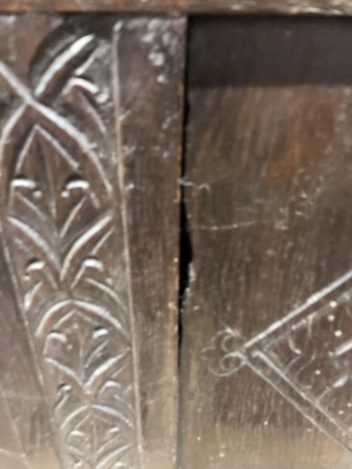 An early 18th century panelled oak coffer, length 134cm, depth 54cm, height 63cm