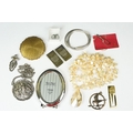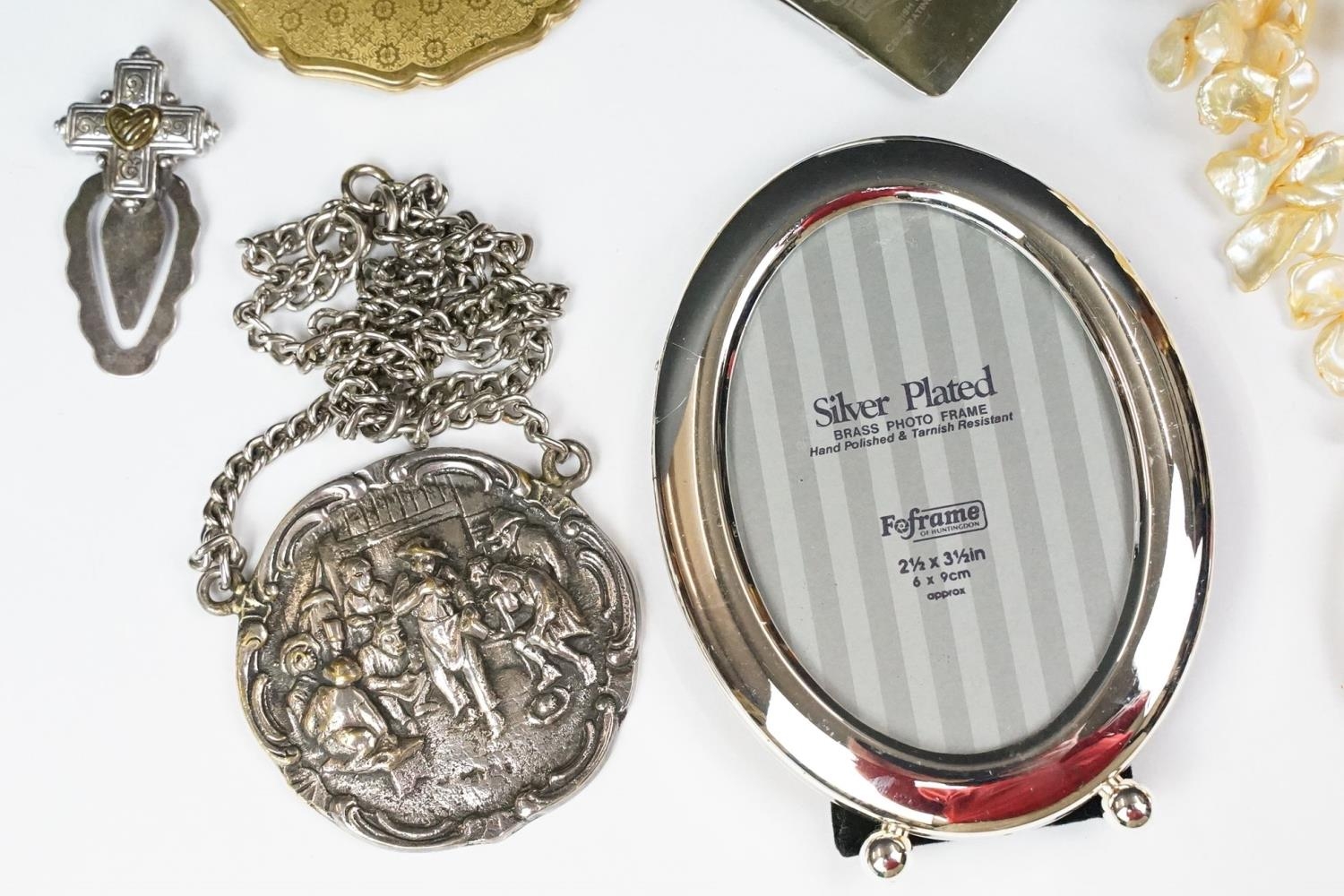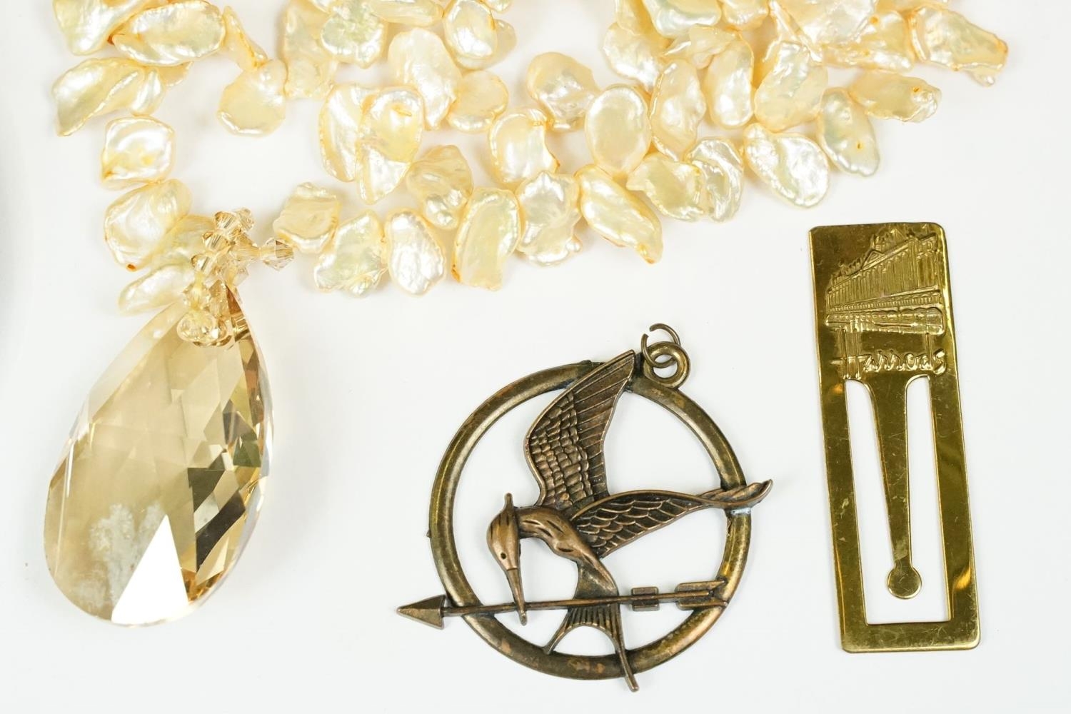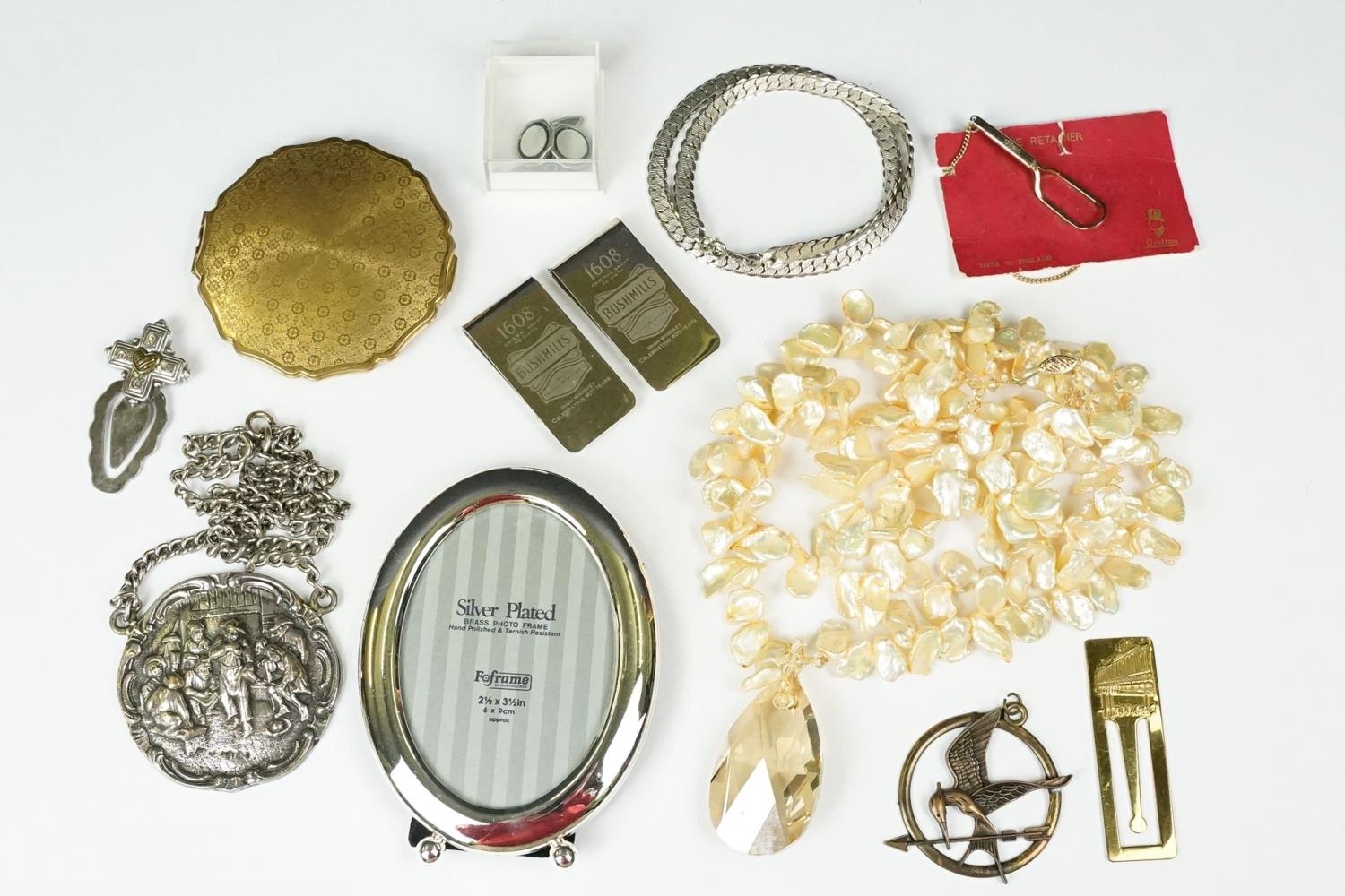 A small group of mixed collectables to include costume jewellery, cultured pearl necklace with 14ct gold clasp and faceted crystal drop pendant, photograph frame, money clip, Harrods bookmark...etc.
