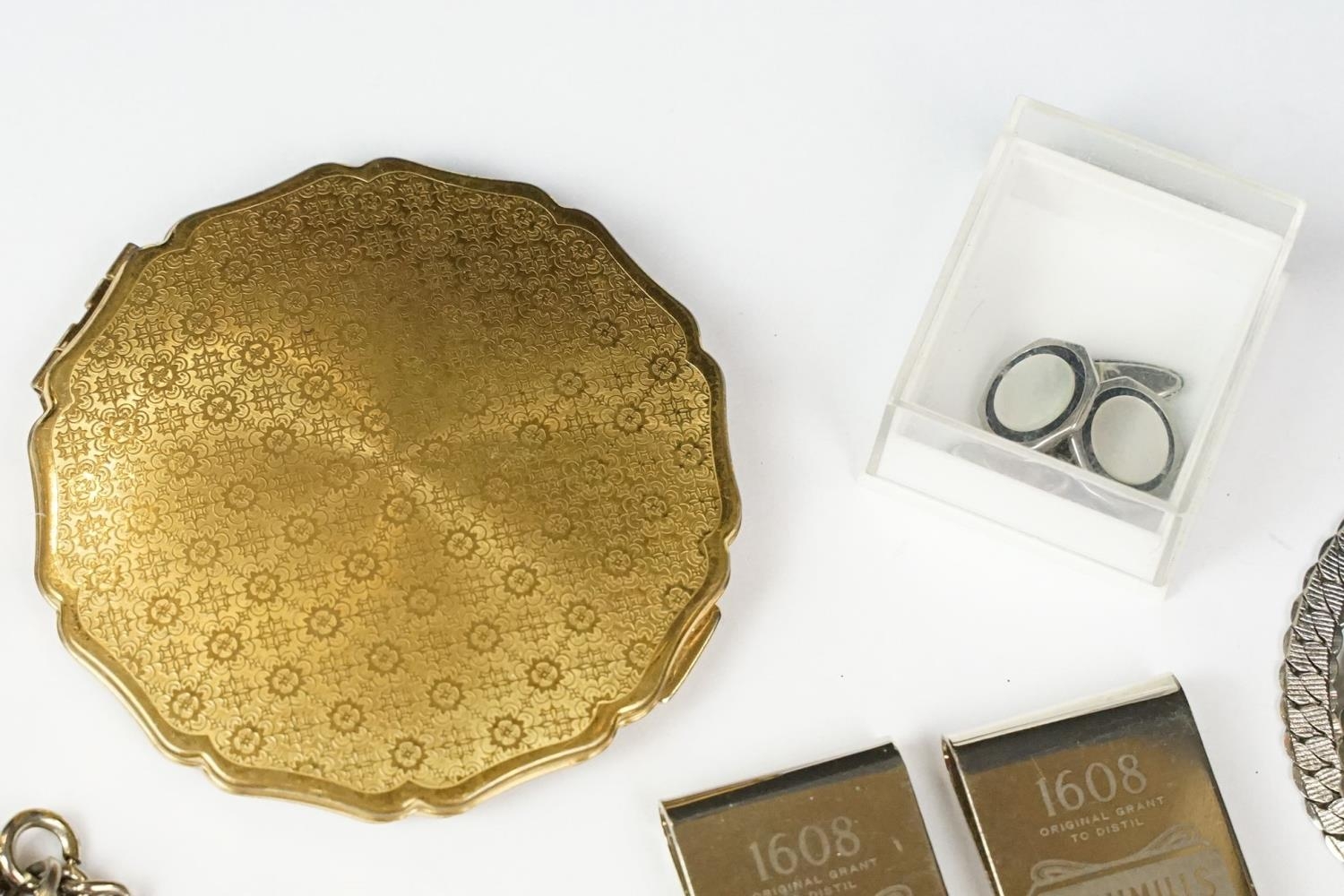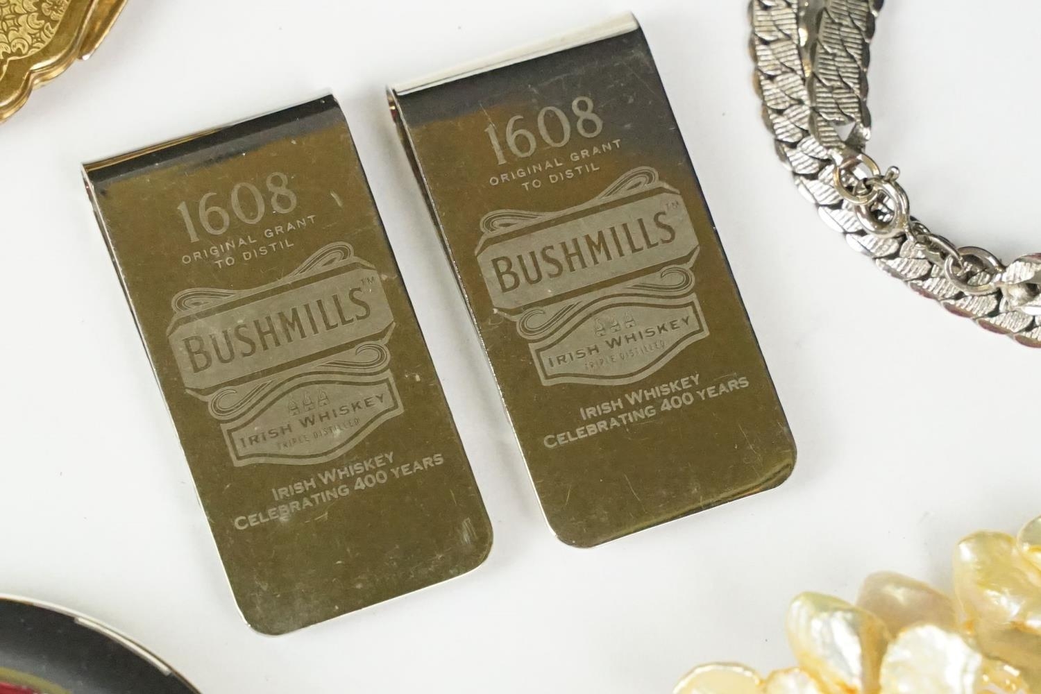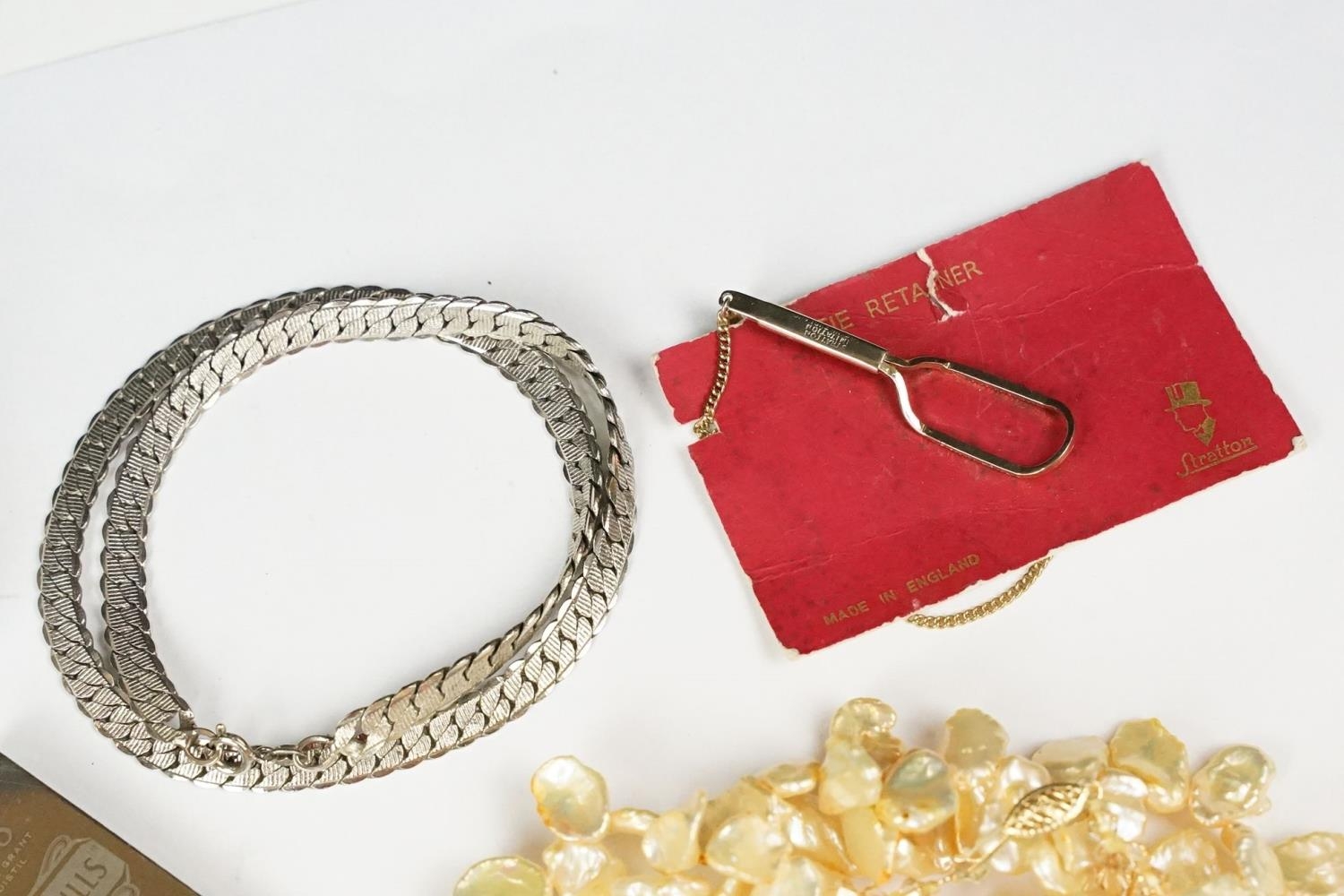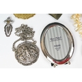 A small group of mixed collectables to include costume jewellery, cultured pearl necklace with 14ct gold clasp and faceted crystal drop pendant, photograph frame, money clip, Harrods bookmark...etc.
