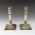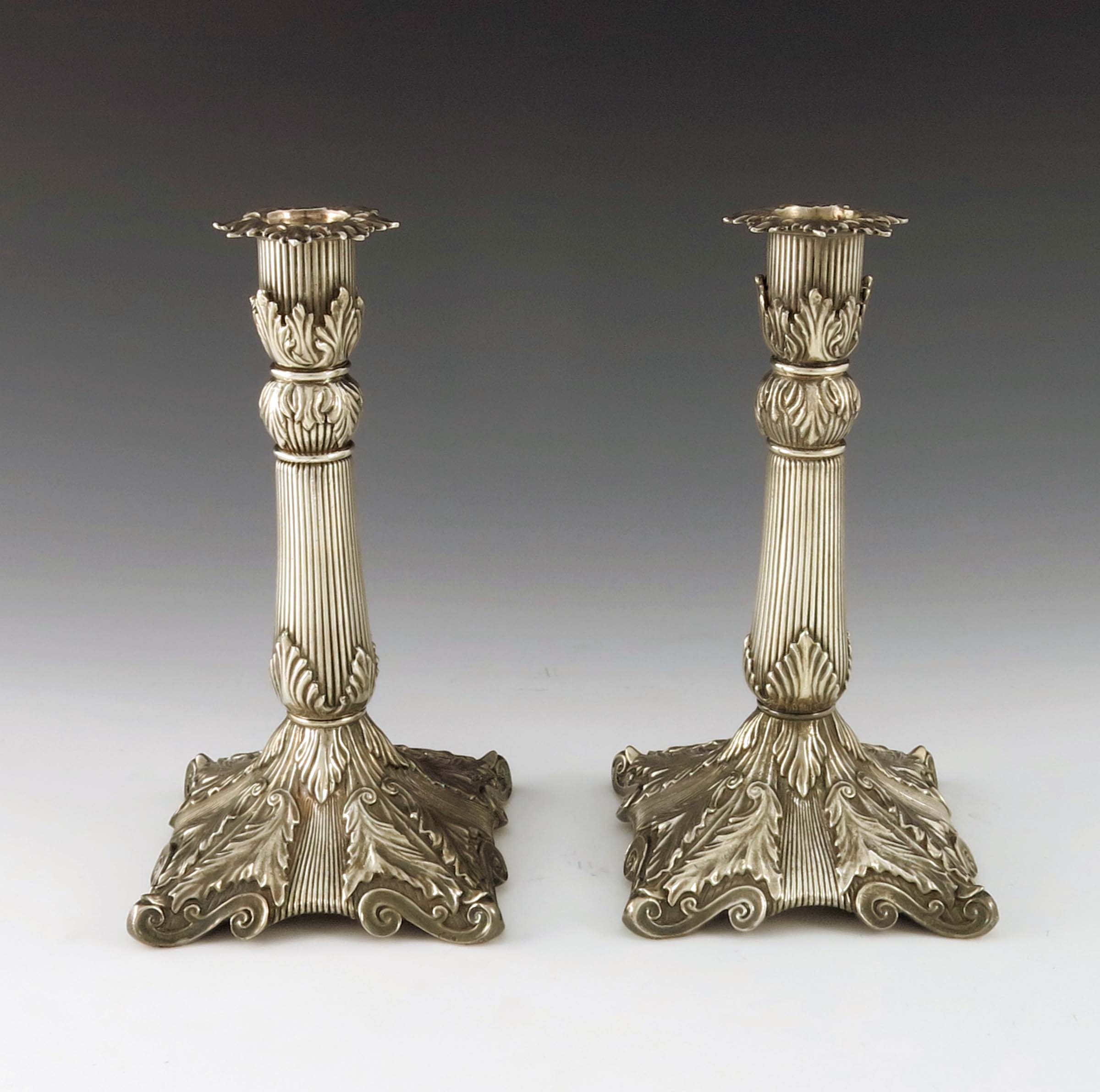 Christofle, a pair of silver plated candlesticks, Paris circa 1980, reeded column form on square scroll and acanthus bases, the knopped stems with foliate lappets, 20cm high (2)