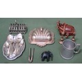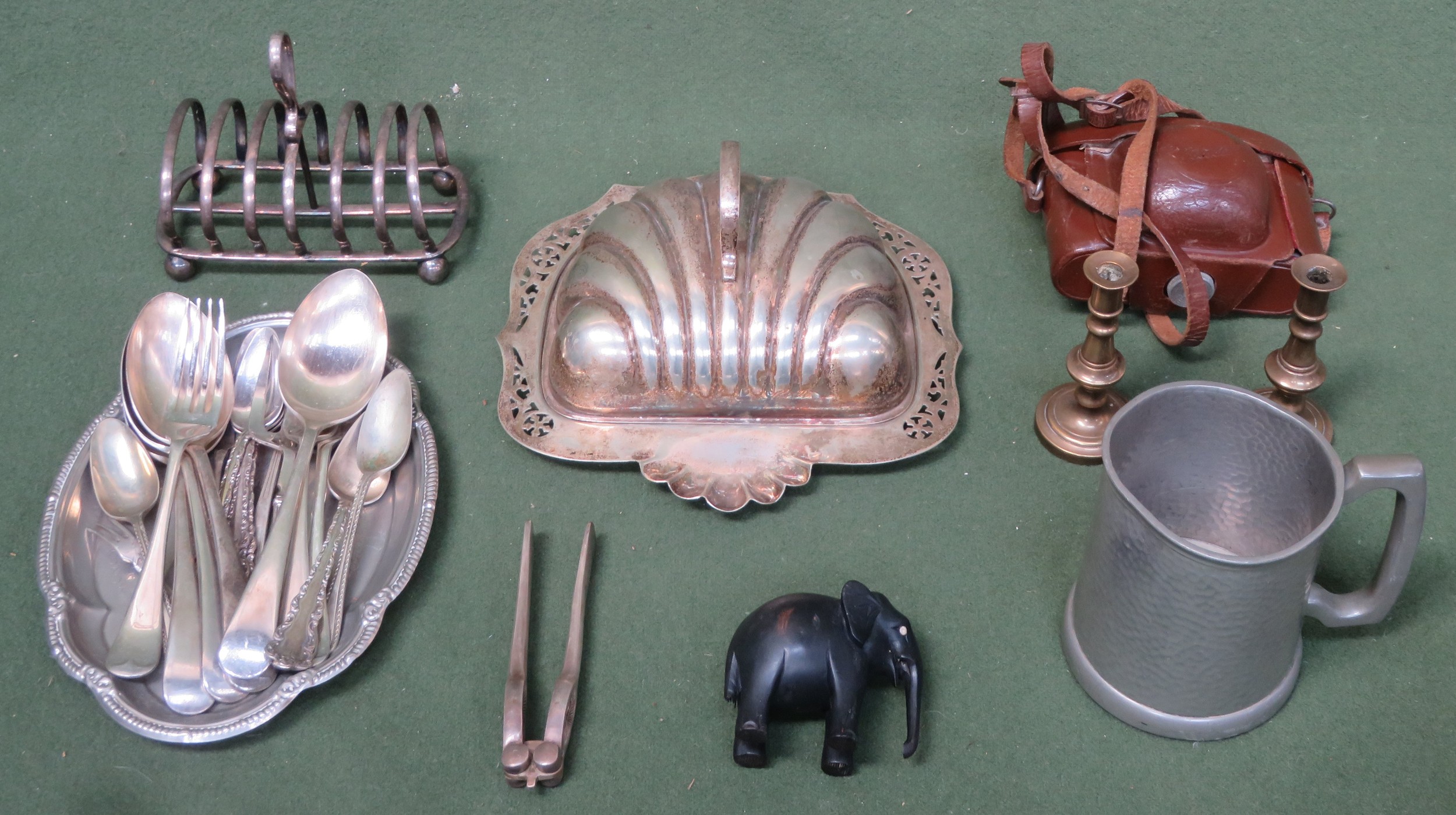 Sundry lot including various silver plated ware, flatware, pewter, carved Elephant, plus cased camera