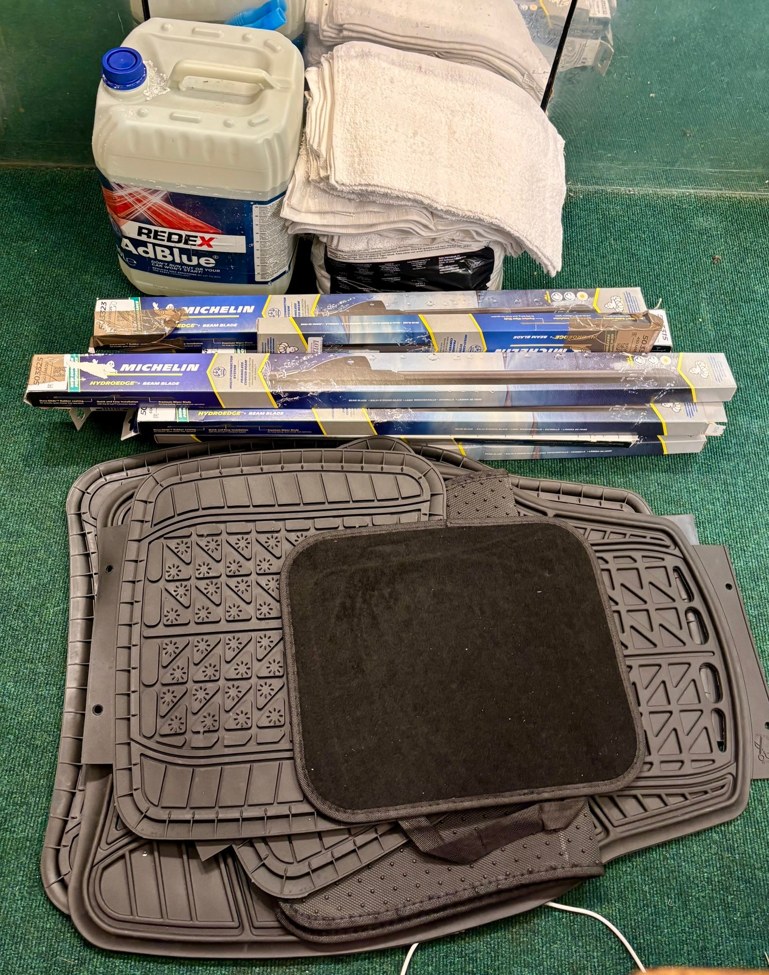 MIXED CAR LOT INCL VARIOUS MICHELIN WIPER BLADES, MICHELIN RUBBER CAR MATS, A QTY OF COTTON CLOTHS AND A 4LTR REDEX ADBLUE