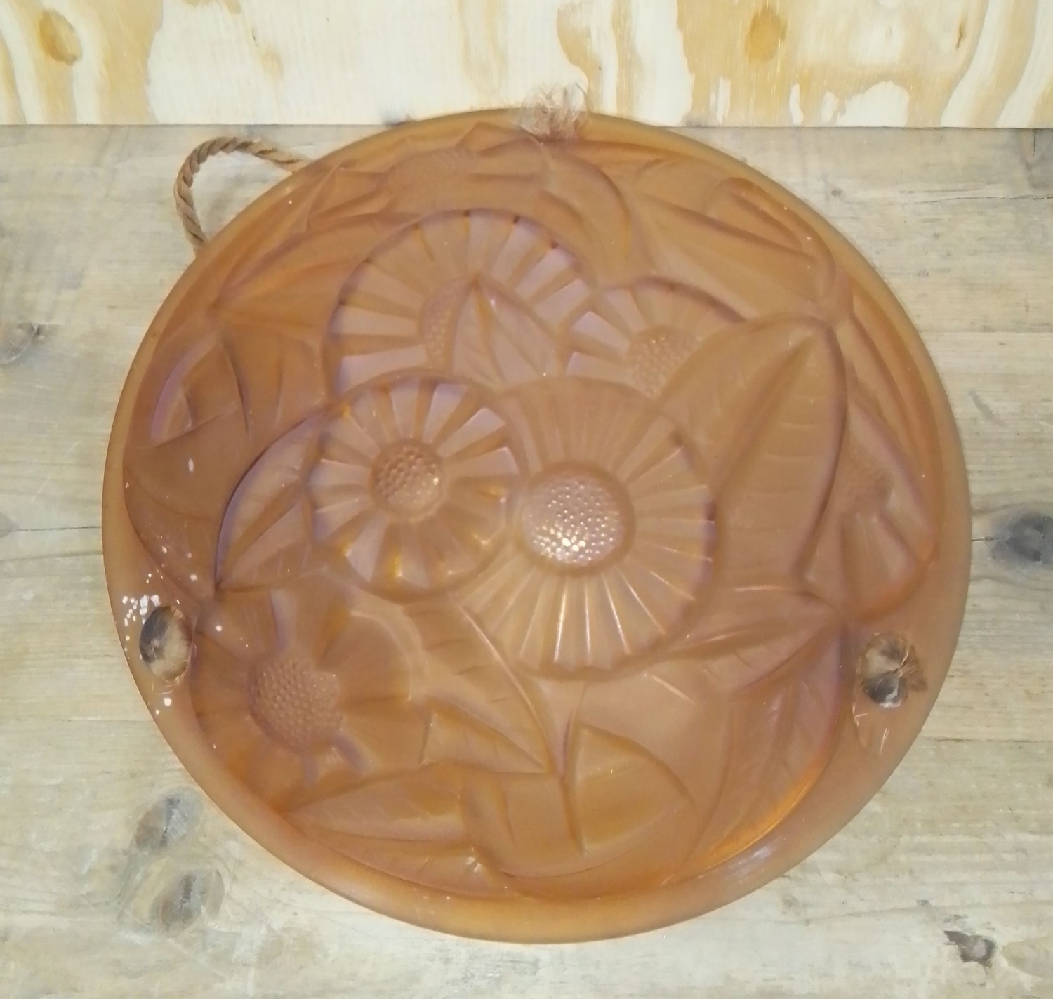 A French Art Deco plaffonier pressed glass ceiling light fitting by Degue, diam. 34.5cm.