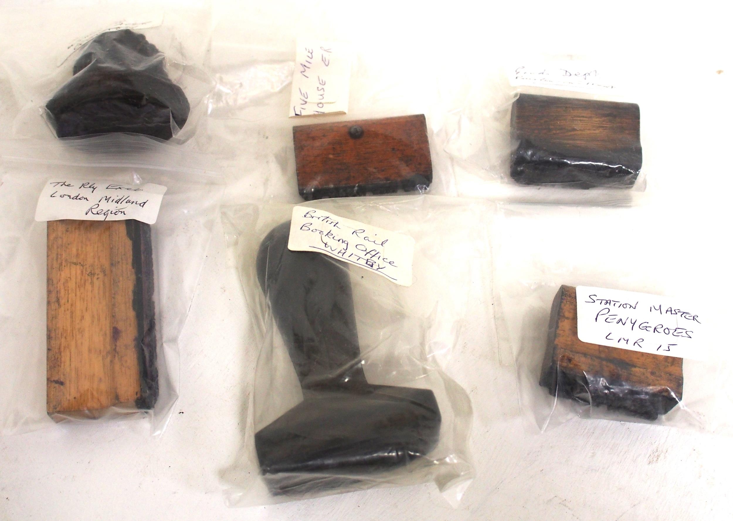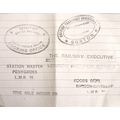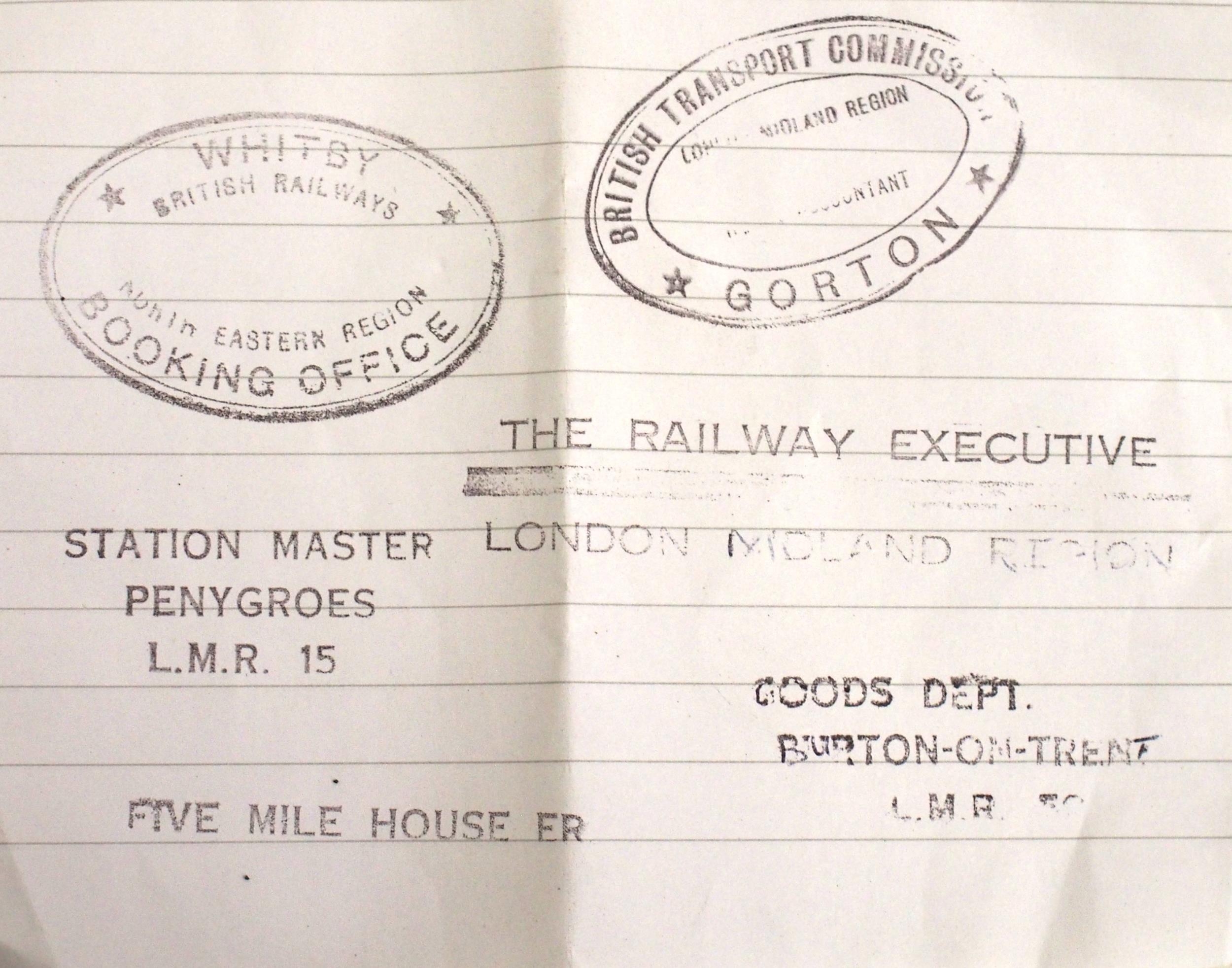 Station ink stamps - "B.T.C. LMR WORKS ACCT GORTON", (Very Unusual handle) "GOODS DEPT BURTON ON TRENT", "STATION MASTER PENYGROES LMR 15", "BRITISH RAILWAYS NORTH EASTERN REGION BOOKING OFFICE WHITBY", "FIVE MILE HOUSE E.R.", "THE RLY EXECUTIVE LONDON MIDLAND REGION" (6) (D3) (Dispatch by Mailboxes/Collect from Banbury Depot)
