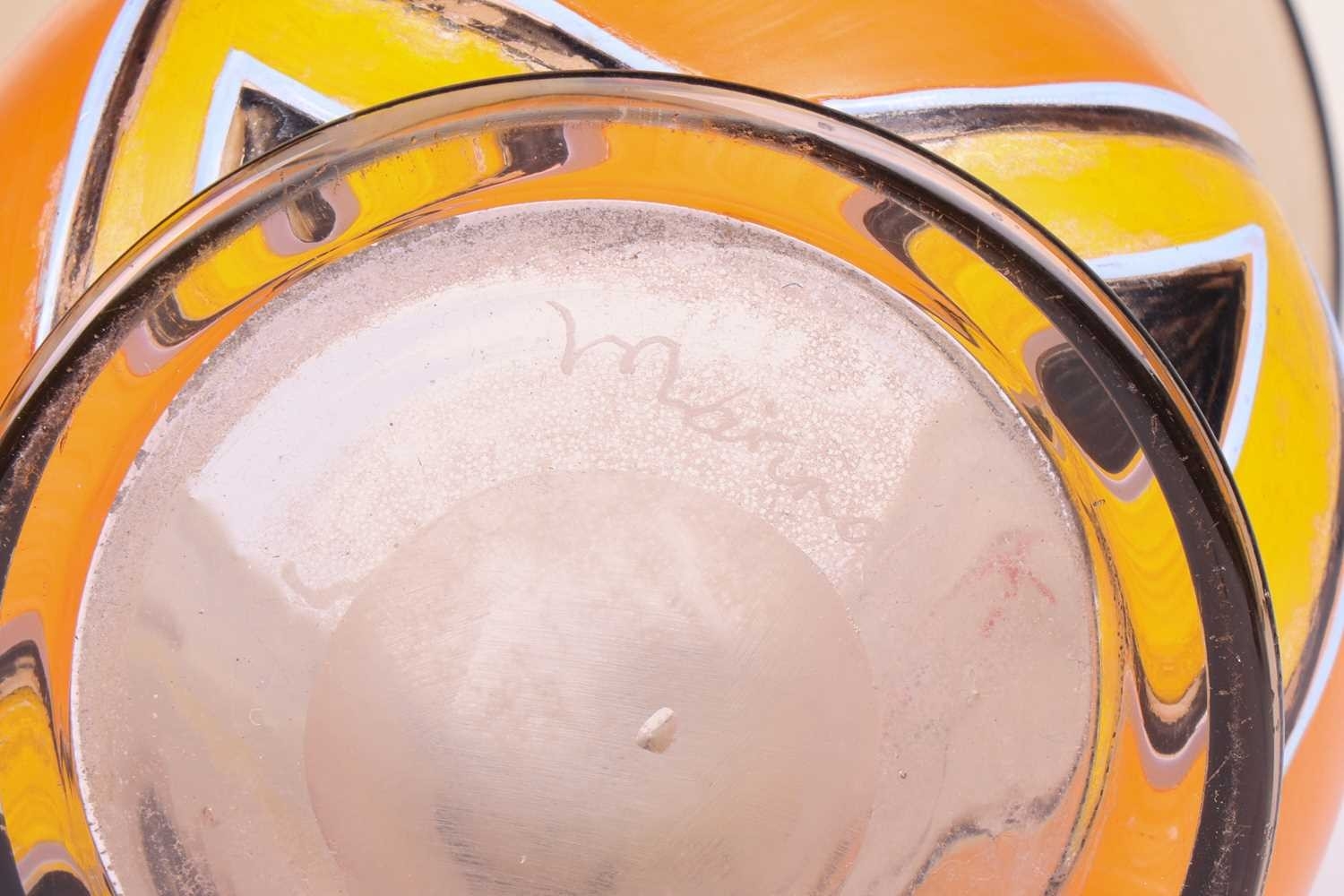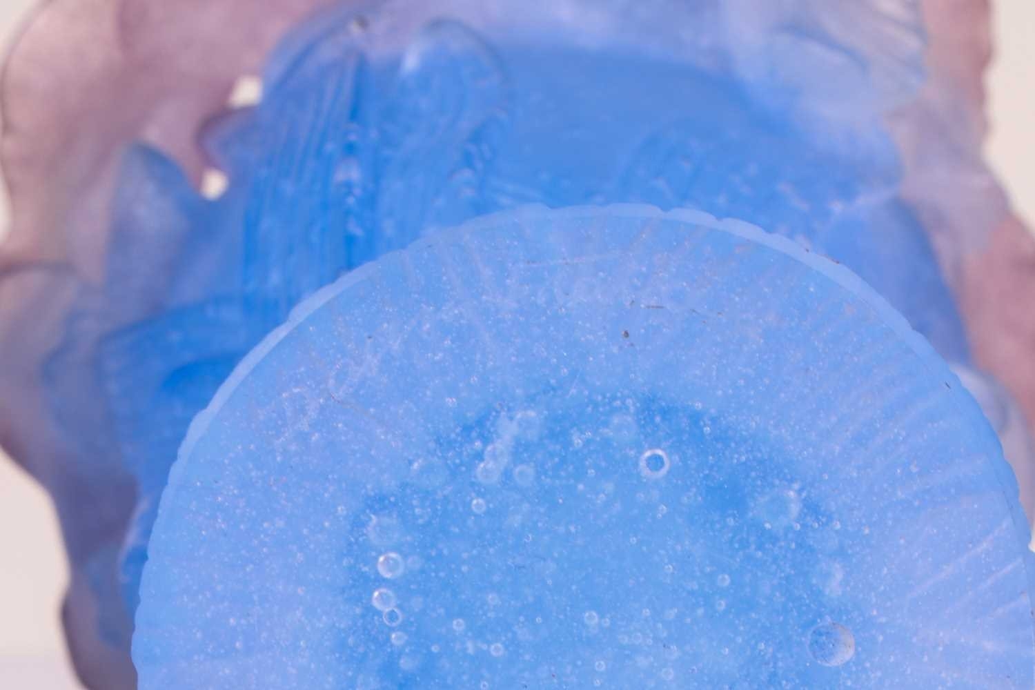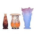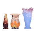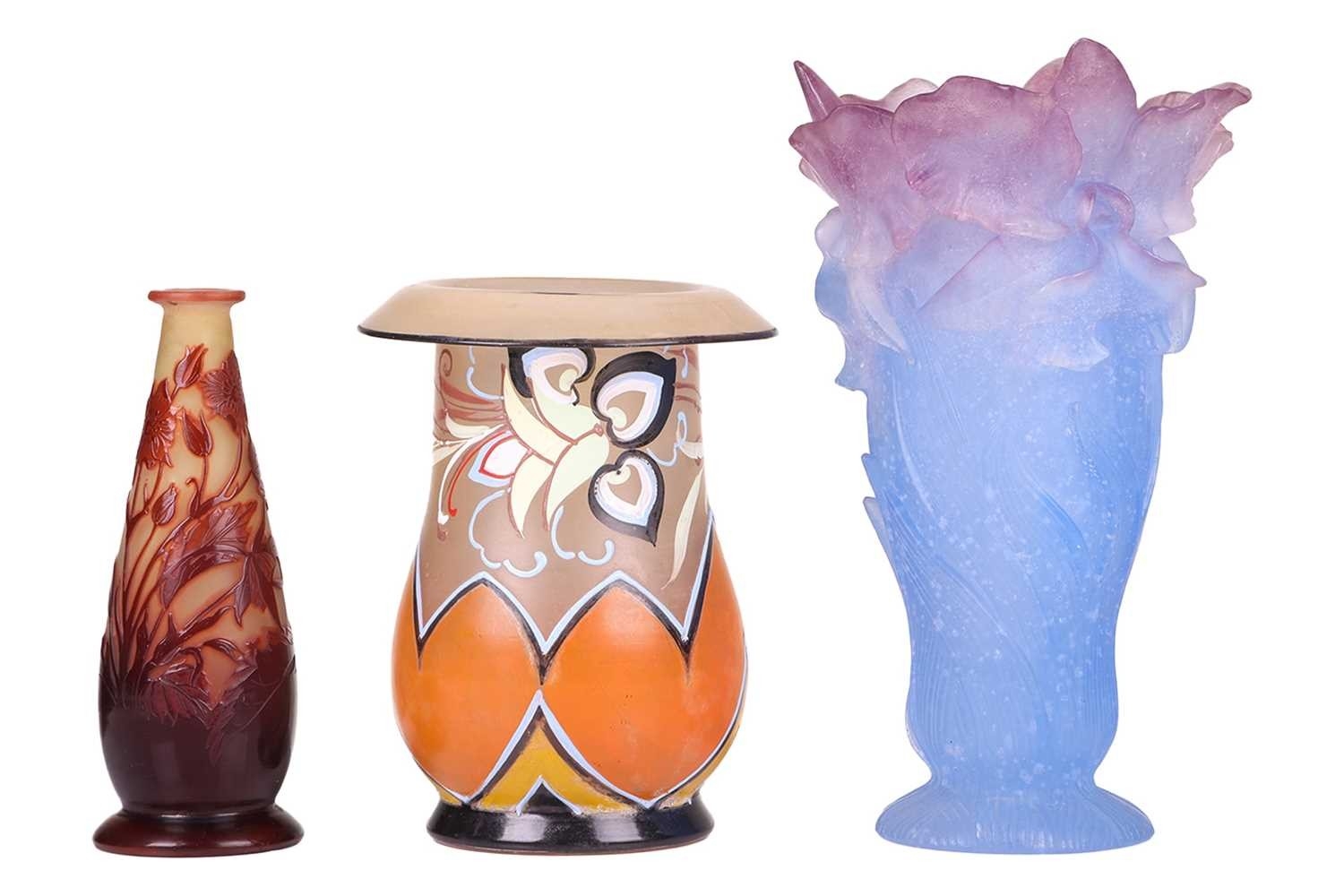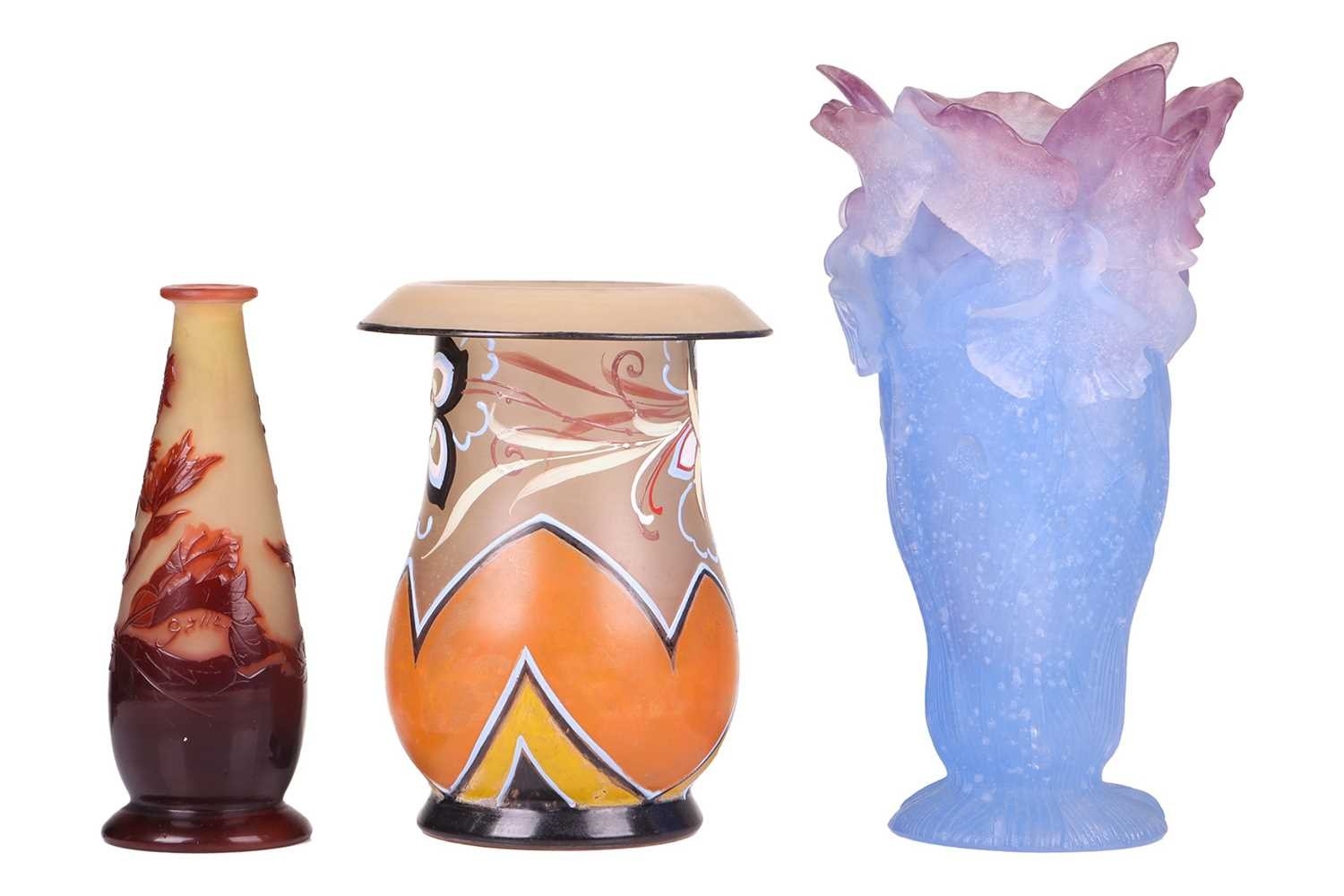 An Art Deco painted opaline glass vase, with everted rim, signed 'Marinot' to the base, 17.7 cm high, together with a Daum blue and pink vase, formed of irises, 20 cm high, and a cameo glass vase, 14.5 cm. Qty: (3)