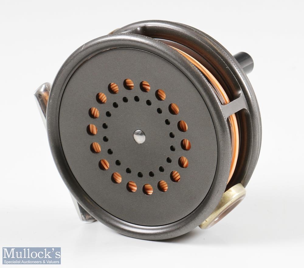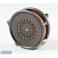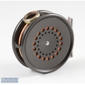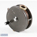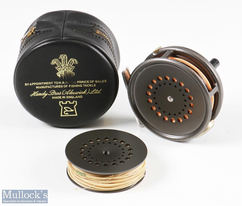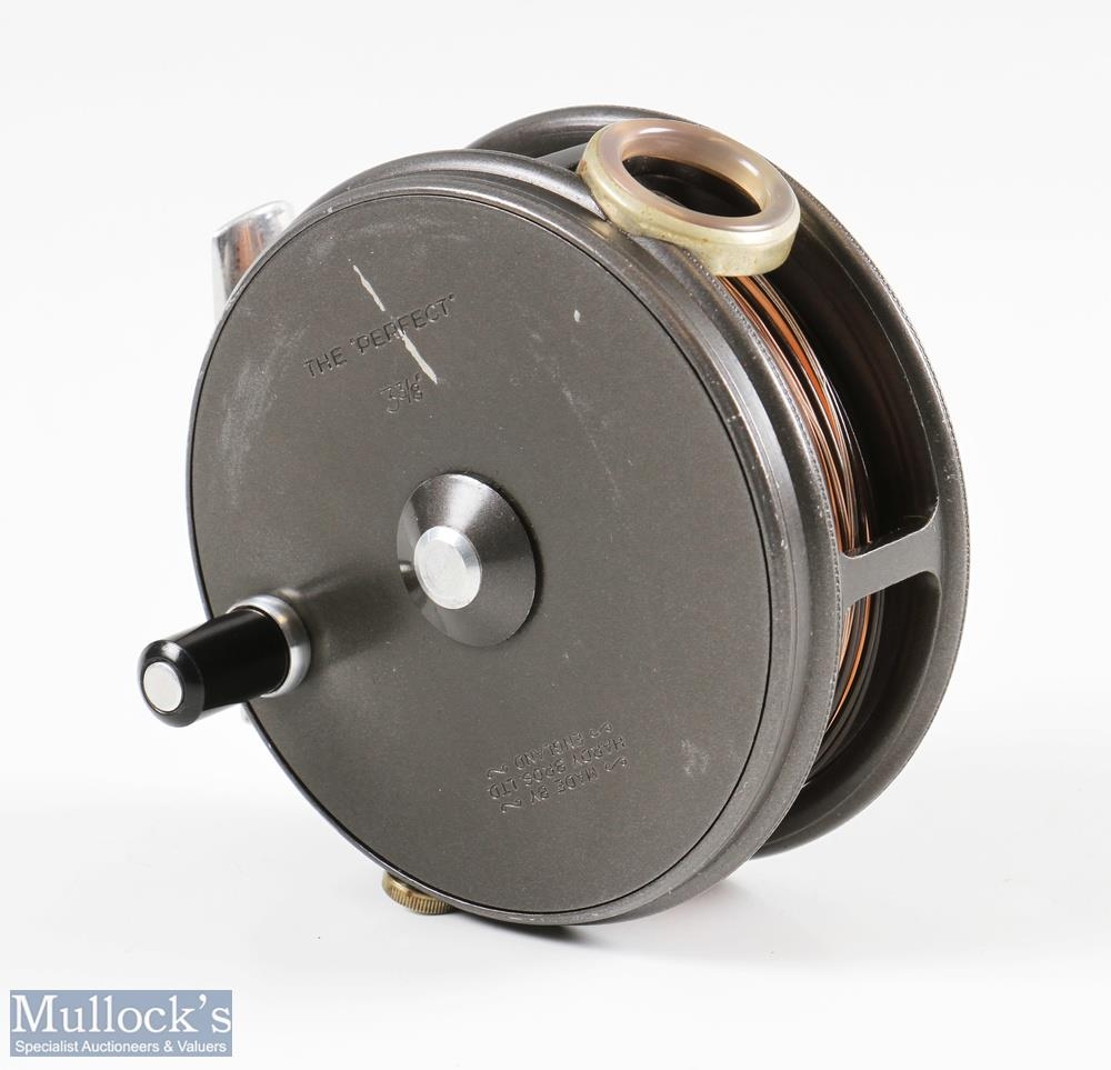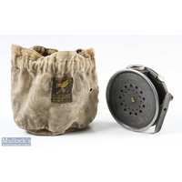 Hardy Bros Perfect 3 3/8" alloy fly reel with agate line guide, rim line tensioner, chrome foot, with maker black pouch plus spare spool, runs smooth