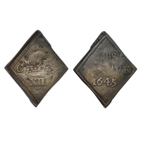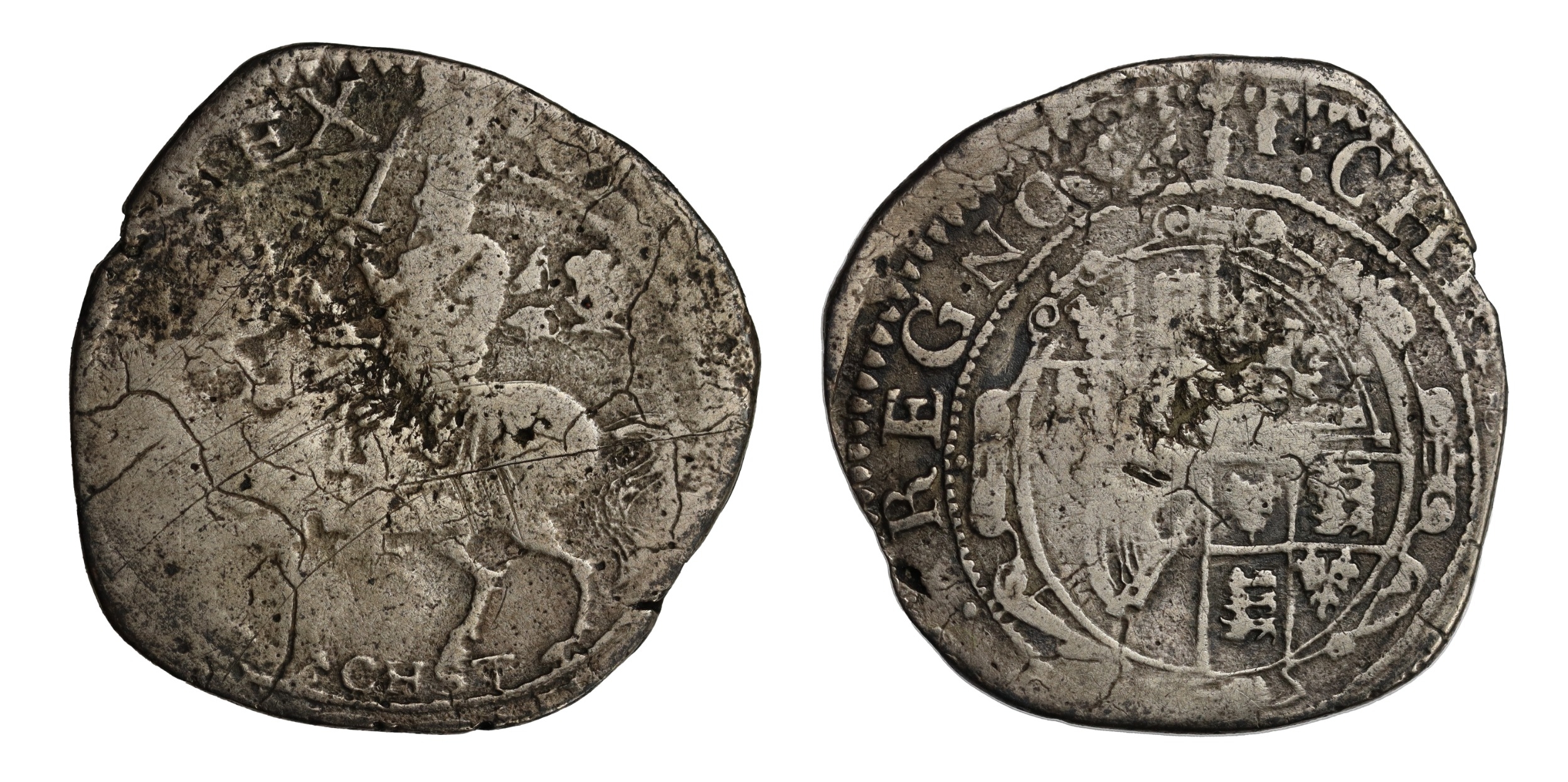 † Charles I (1625-49), silver Halfcrown, Chester Mint, Lord Byron's emergency issue 31st January 1645 to 3rd February 1646, armoured King on horseback left, with upright sword and flowing sash, plumes in field, CHST below hooves, beaded borders with abbreviated Latin legend surrounding, initial mark three gerbs both sides, CAROLVS D: G: MAG: BRI: FRA: ET HIR: REX, rev. oval quartered shield of arms, beaded borders with abbreviated Latin legend surrounding, :CHRISTO. AVSPICE. REGNO., 11.71g (Bull 575 (47-2); Brooker 1111; Lyall B-2; N.2627; S.3130). Struck on a misshapen flan with flaws and wear, the identifying elements of mint mark and CHST clear, fair to fine and very rare.