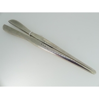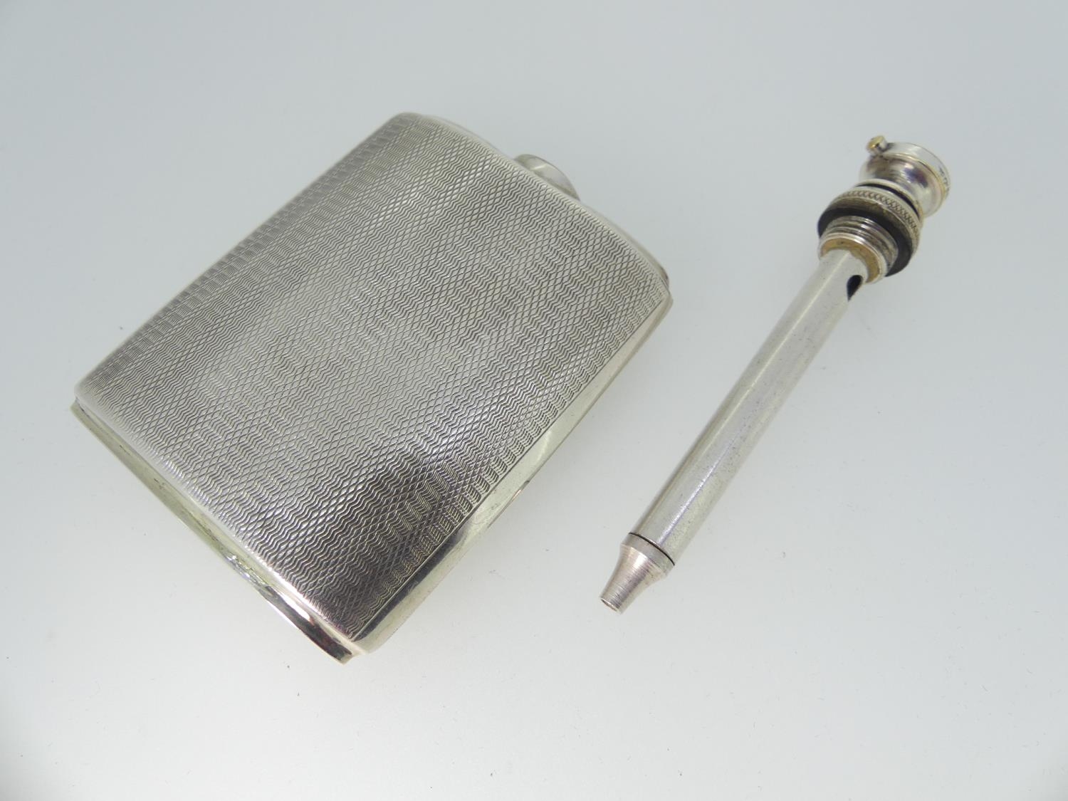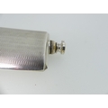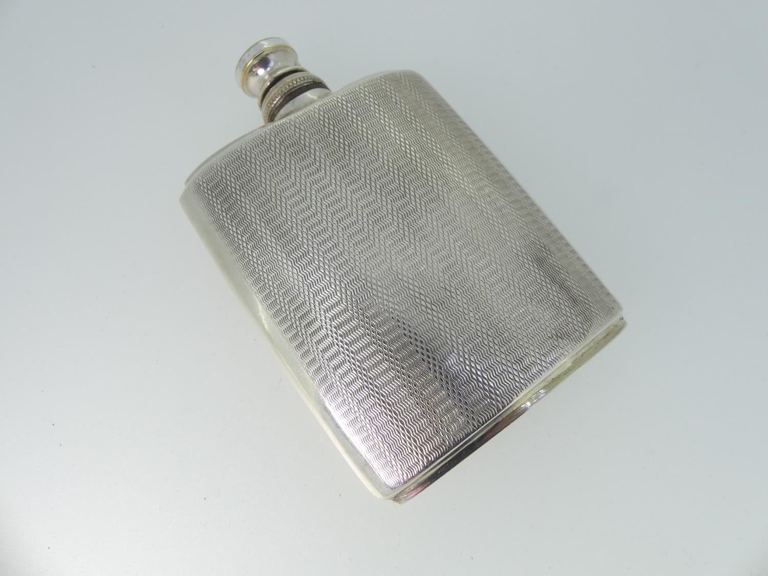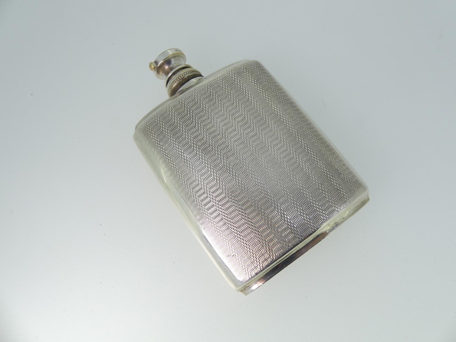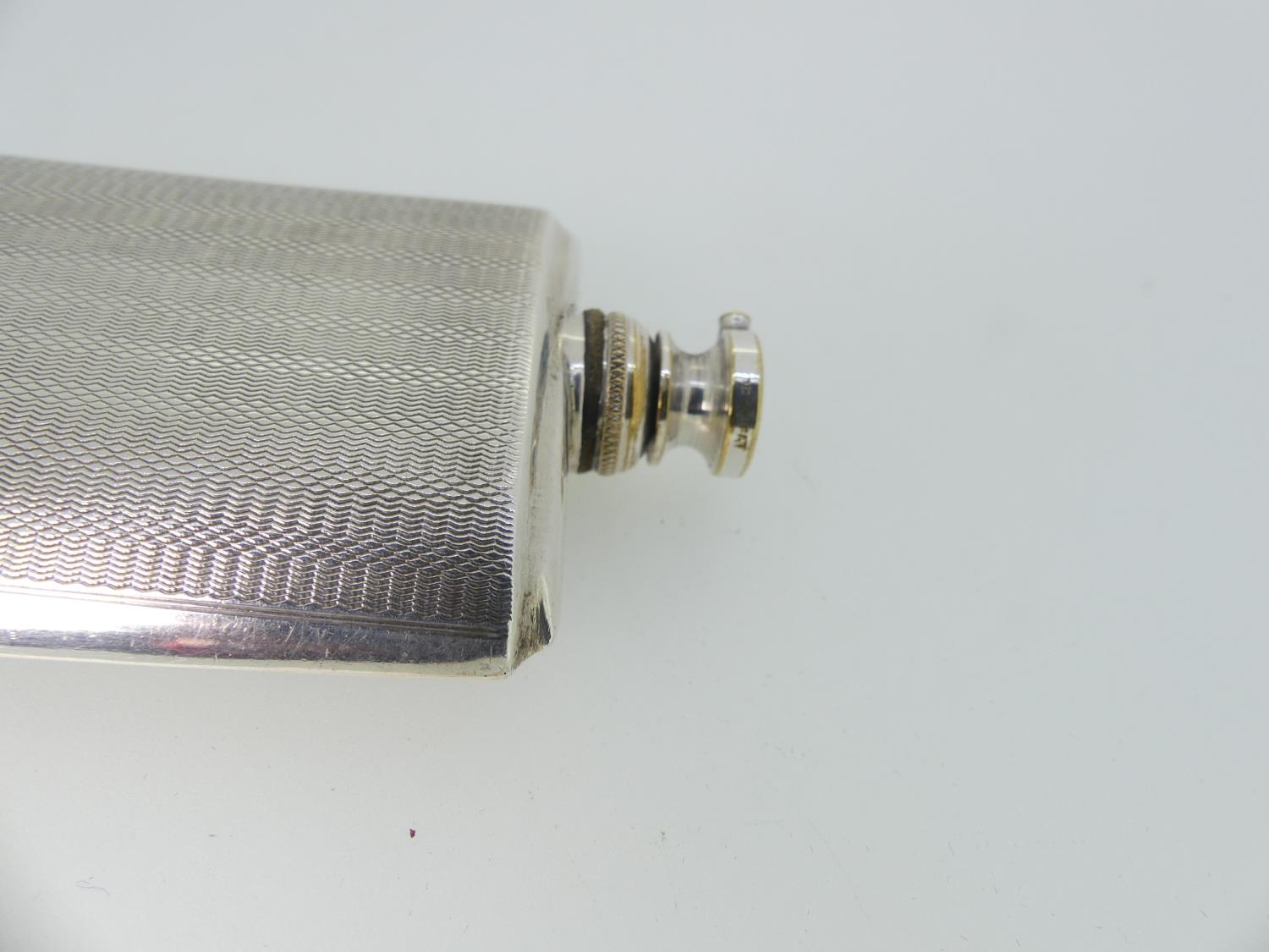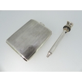 A George V silver Scent Bottle, hallmarked Birmingham, 1928, of shaped rectangular form with engine turned decoration,the sprung dropper cap silver plated, 2in (5cm) wide.