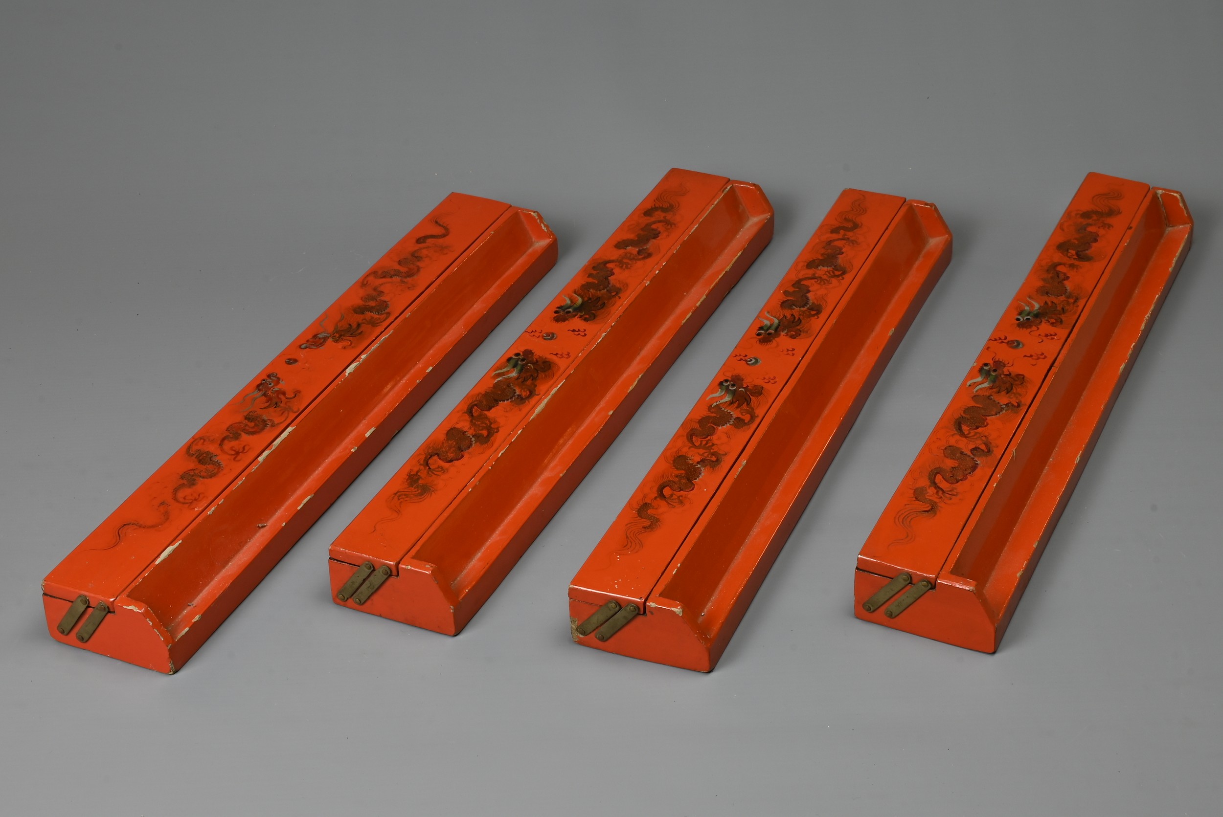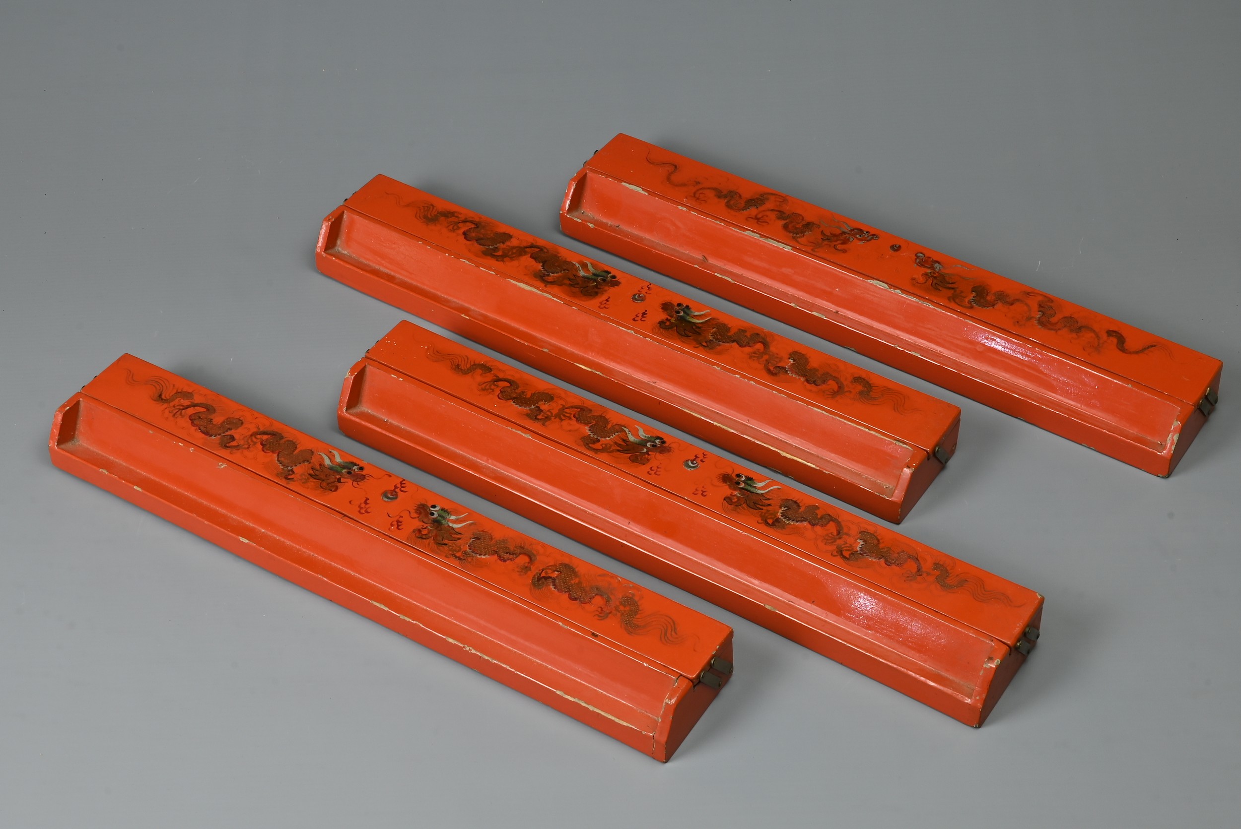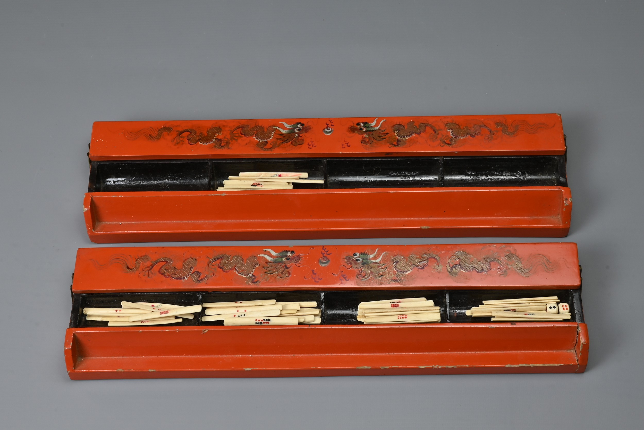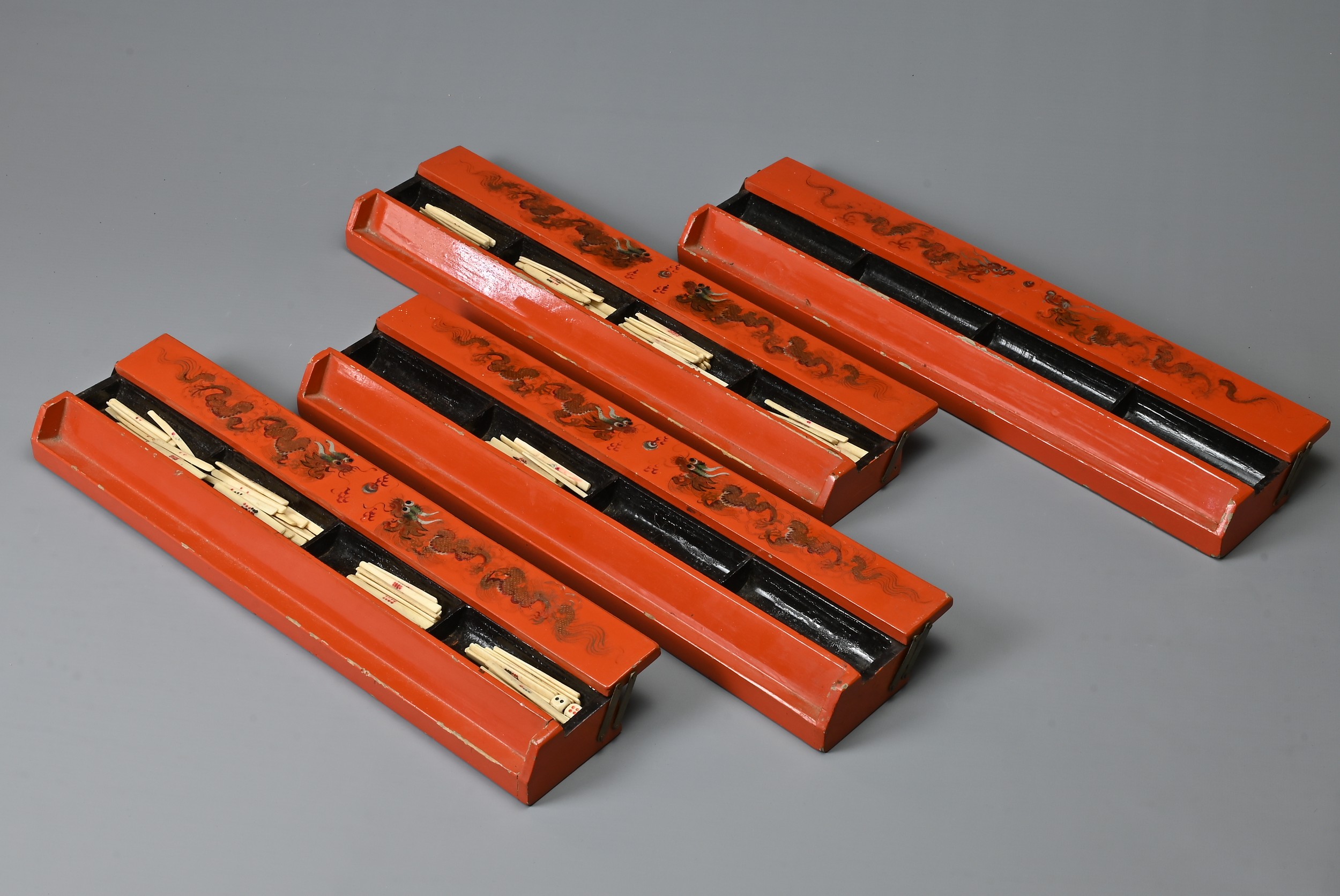 A SET OF CHINESE RED LACQUER MAHJONG RACKS, EARLY 20TH CENTURY. Each painted with two dragons and flaming pearl. The interior black lacquered with four compartments; Together with a quantity of bone counters. 41cm length. (4)