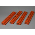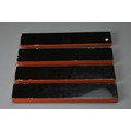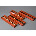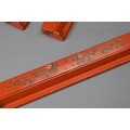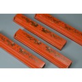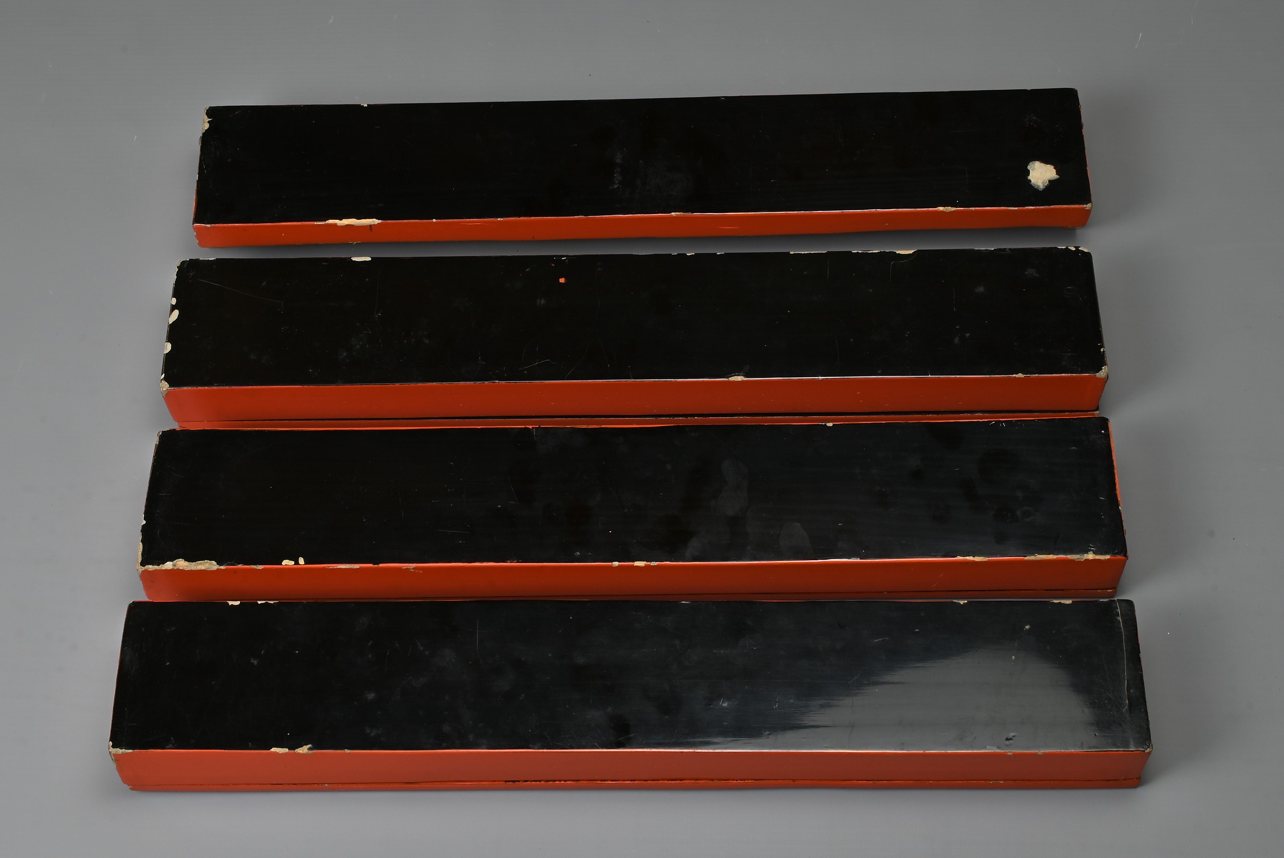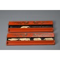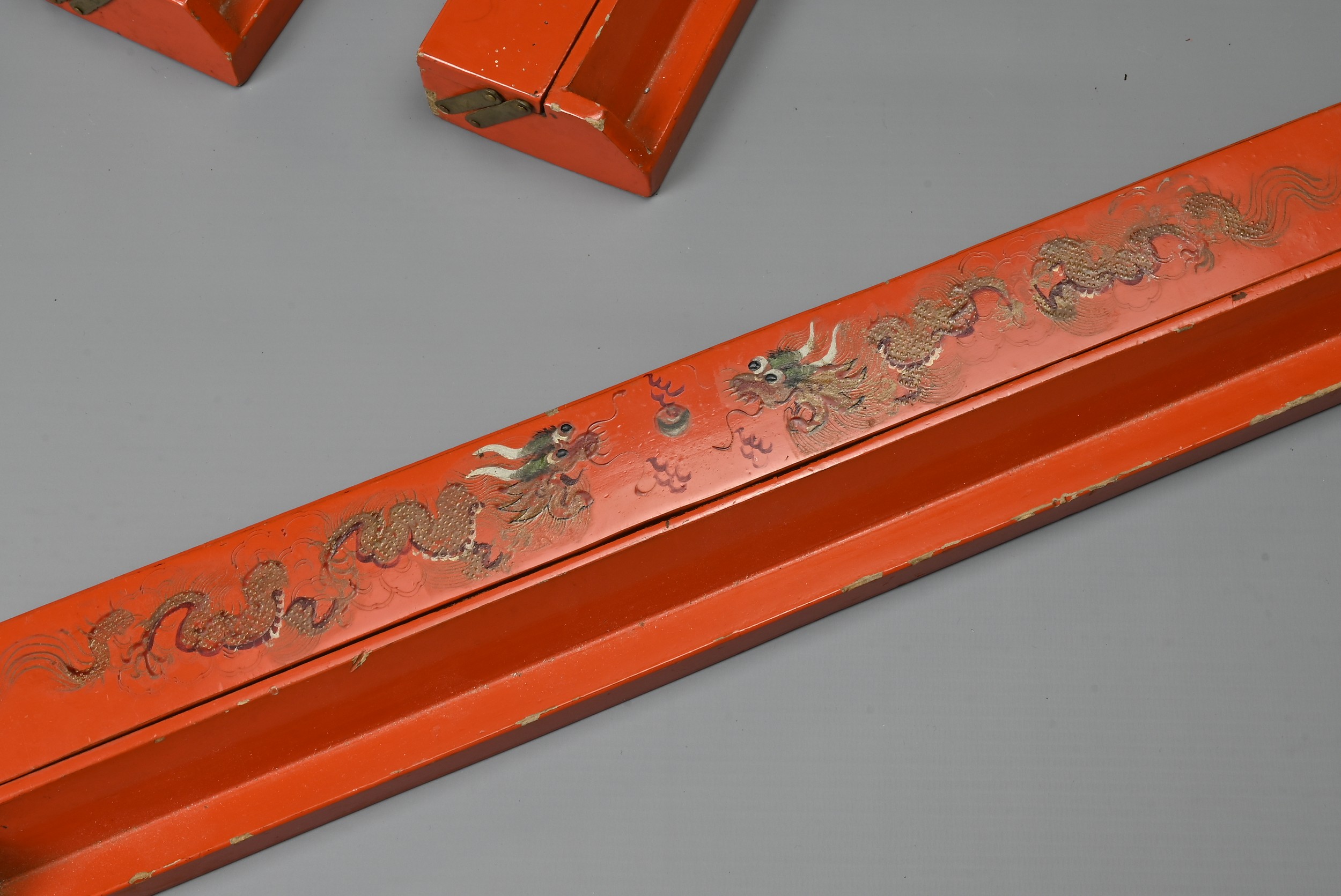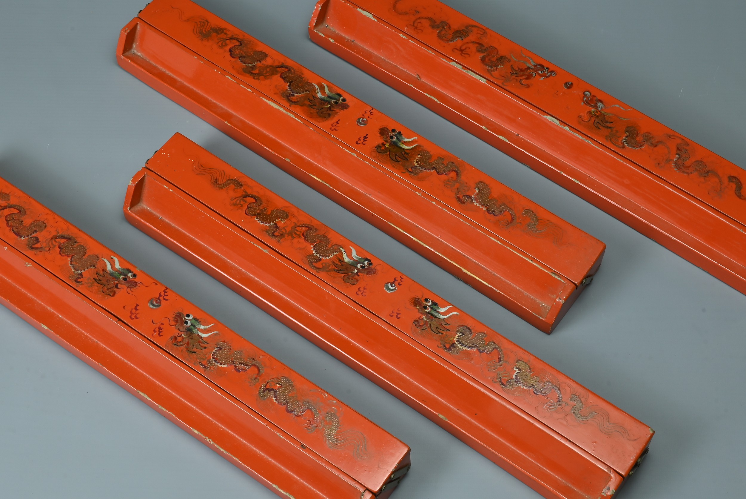 A SET OF CHINESE RED LACQUER MAHJONG RACKS, EARLY 20TH CENTURY. Each painted with two dragons and flaming pearl. The interior black lacquered with four compartments; Together with a quantity of bone counters. 41cm length. (4)