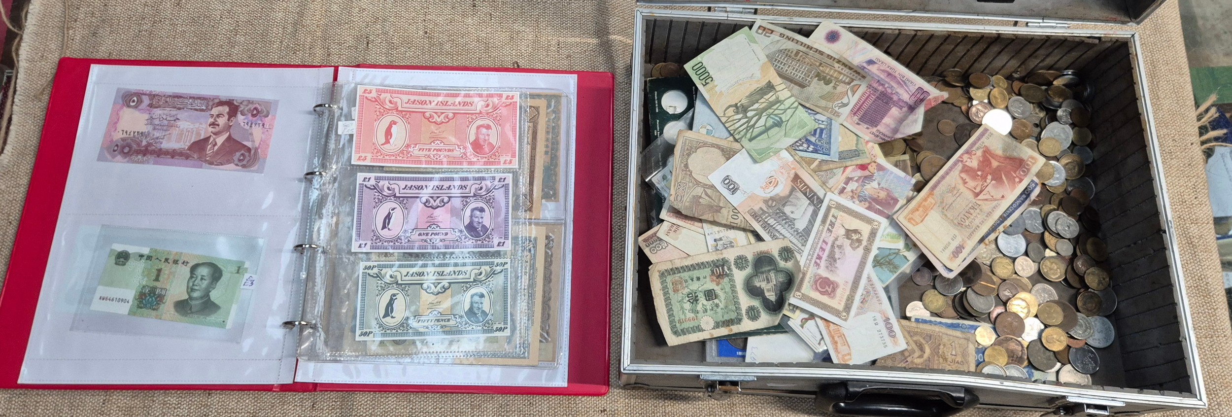 A case of assorted world coins & banknotes.