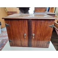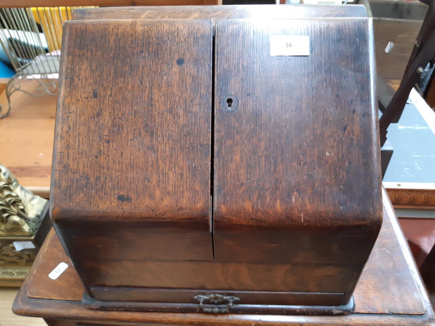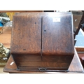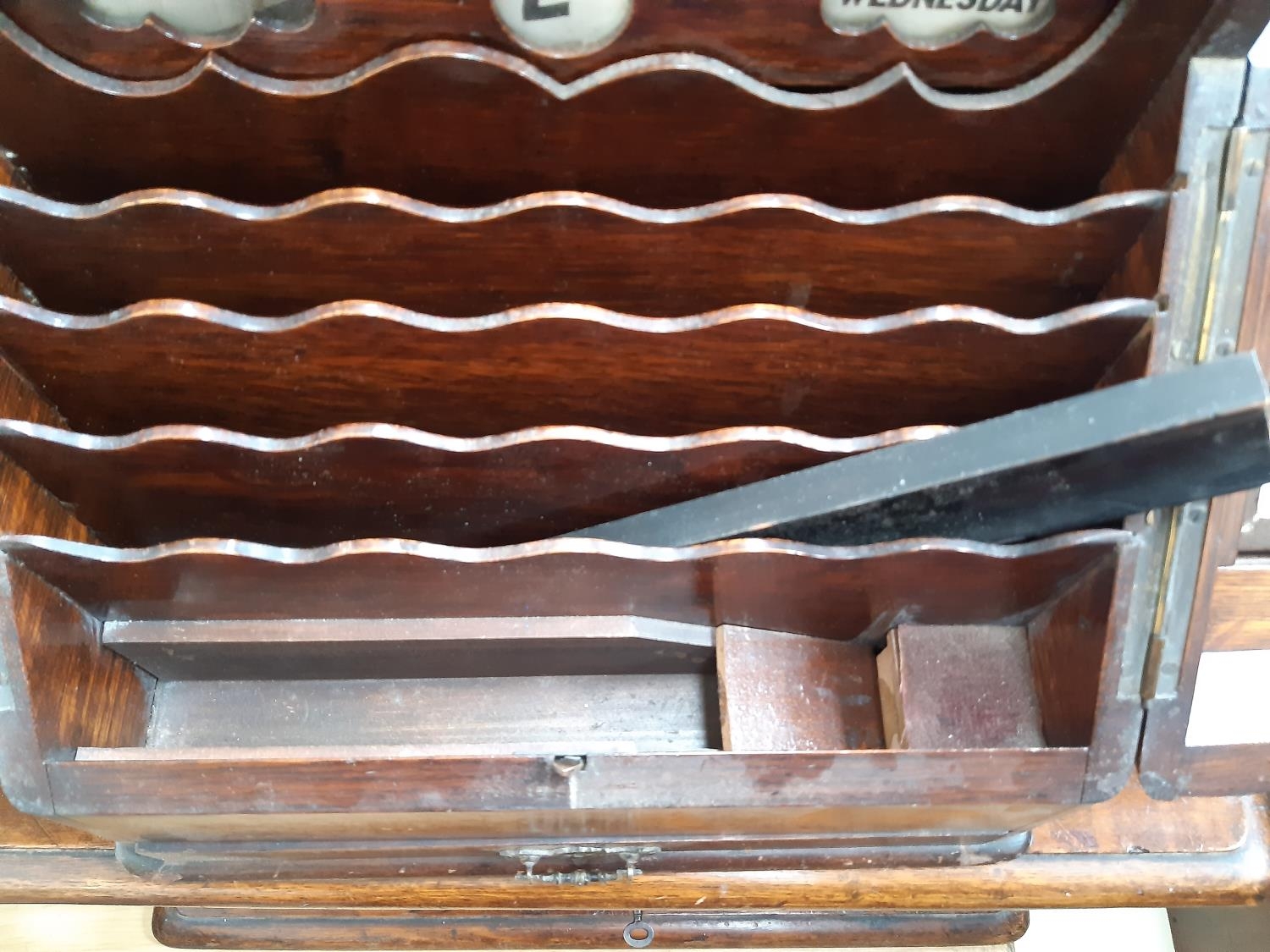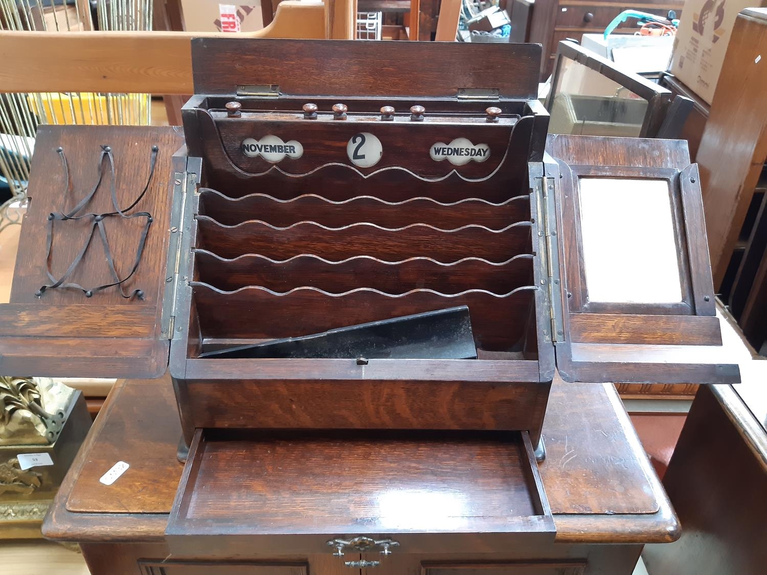 An early 20th century oak stationary box / desk tidy with one lower drawer, pen holder, four section letter rack and upper desk calendar