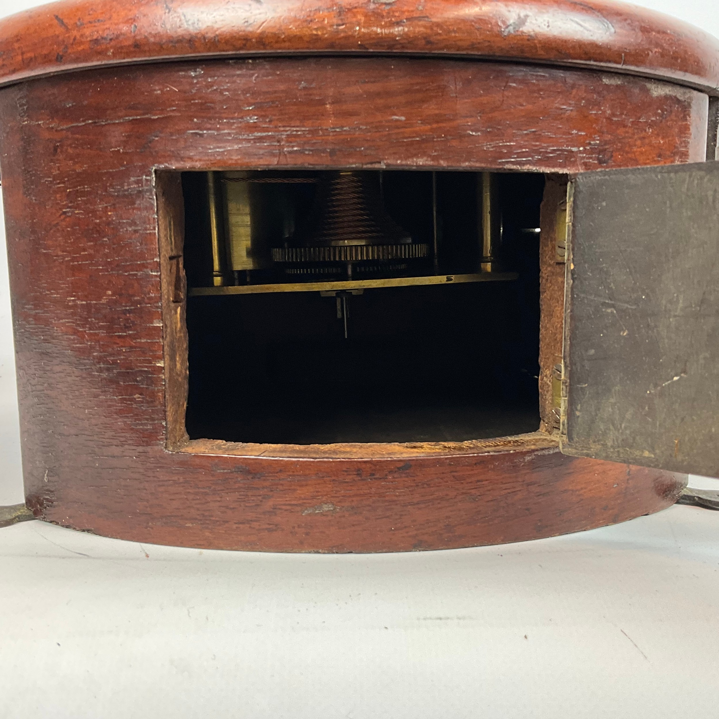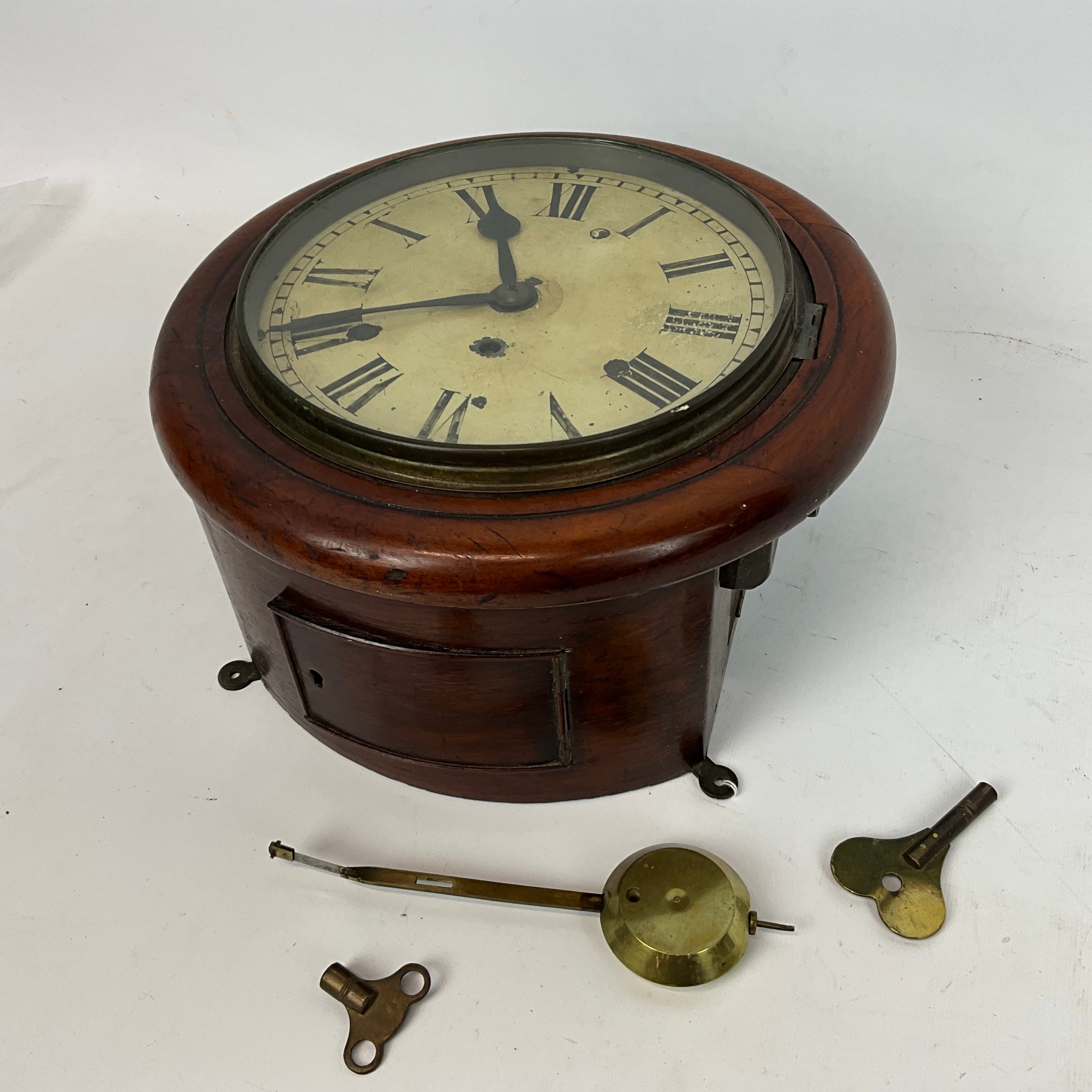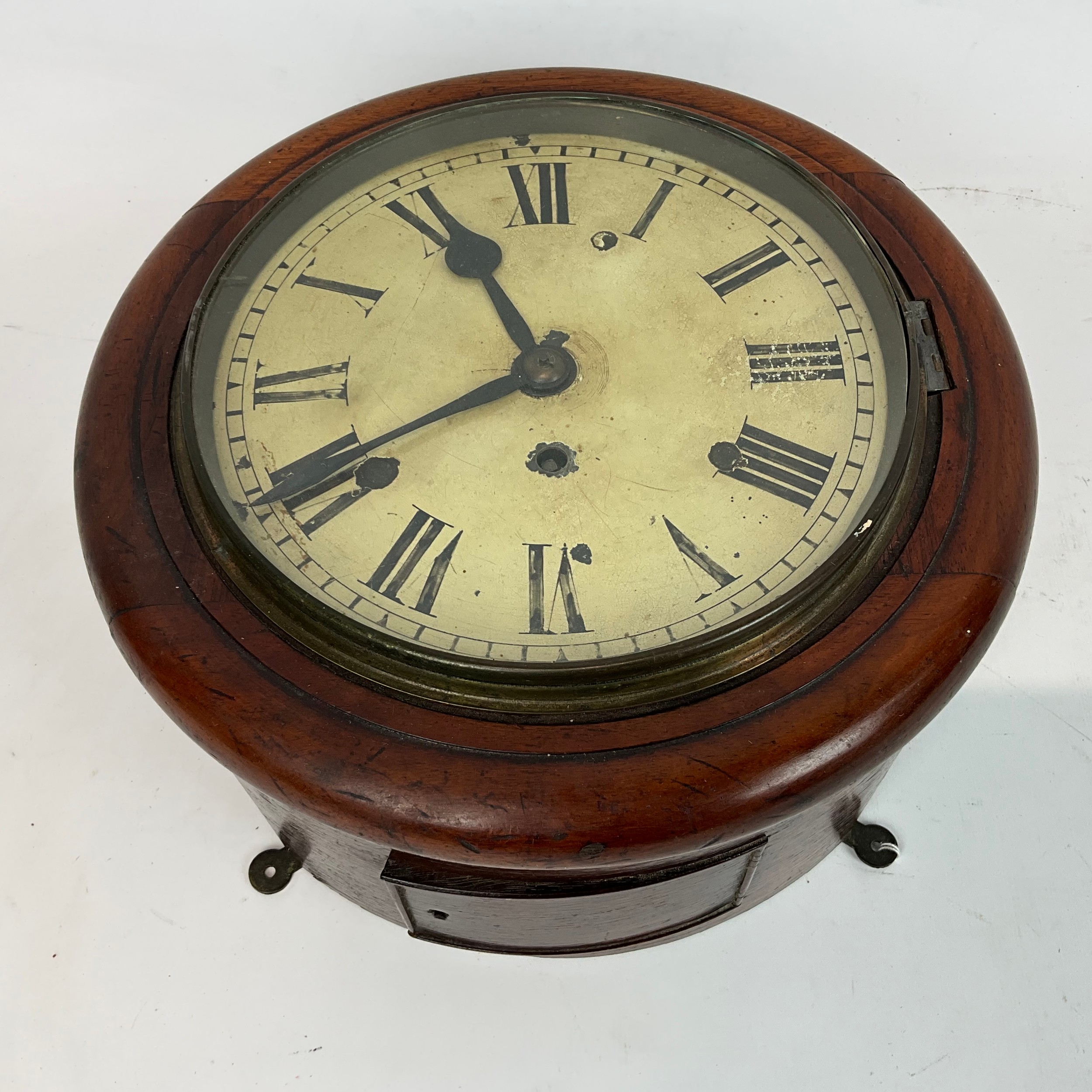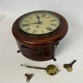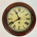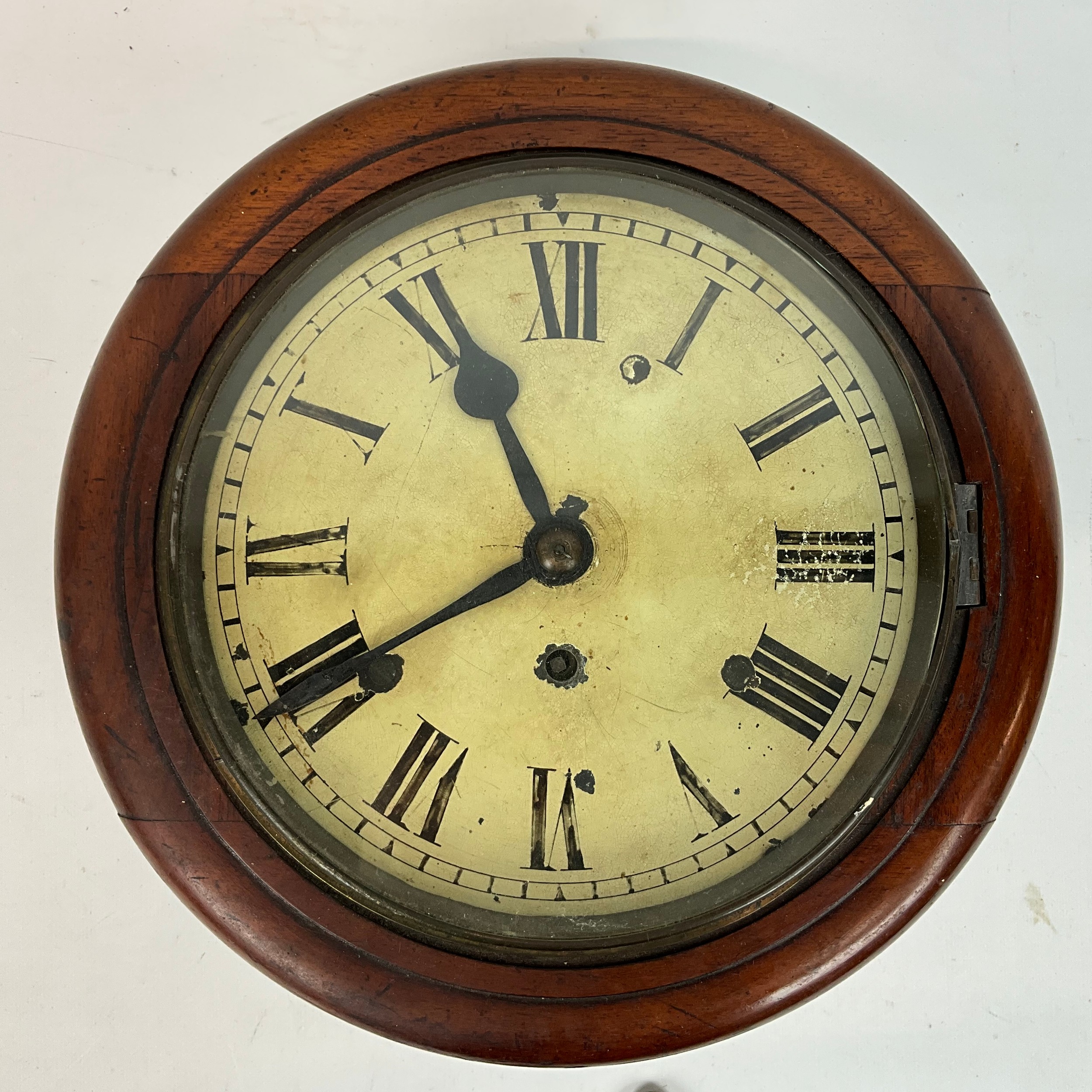 19th-century single fusee wall clock with circular enamelled dial and Roman numeral increments to face. Diameter 20cm.