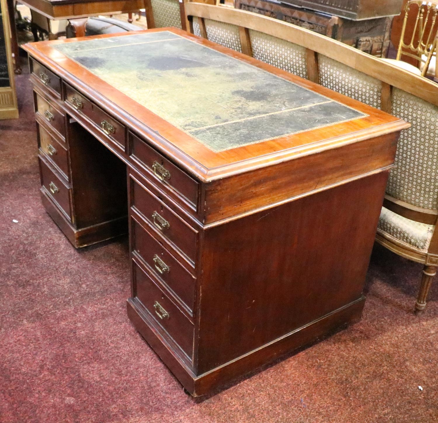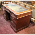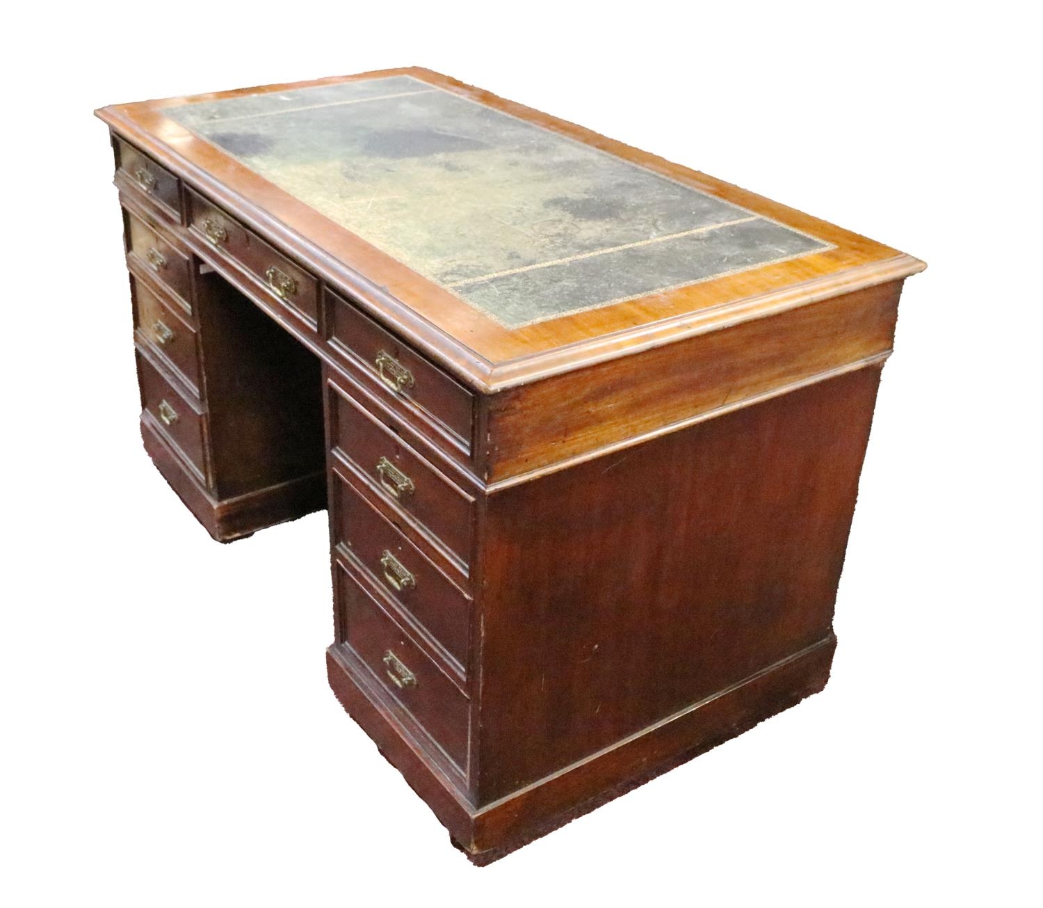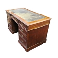 An Edwardian oak kneehole Desk, in the manner of Jas. Shoolbred, the gilt tooled leather inset top above a frieze with three drawers and pedestals with three graduating drawers, all with pierced drop brass handles, 140cms wide x 74cms deep (55" x 29"). (1)