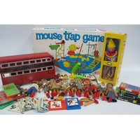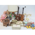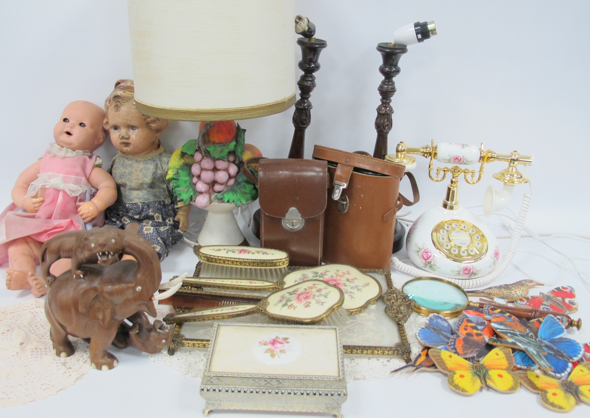 Vintage Dolls, binoculars, telephone, ladies dressing table set.