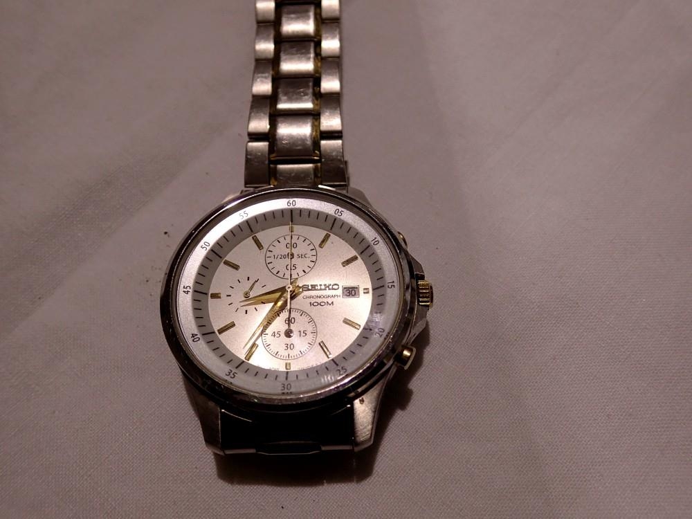 SEIKO: quartz chronograph wristwatch white dial with bi tone bracelet, requires battery. UK P&P Group 1 (£16+VAT for the first lot and £2+VAT for subsequent lots)