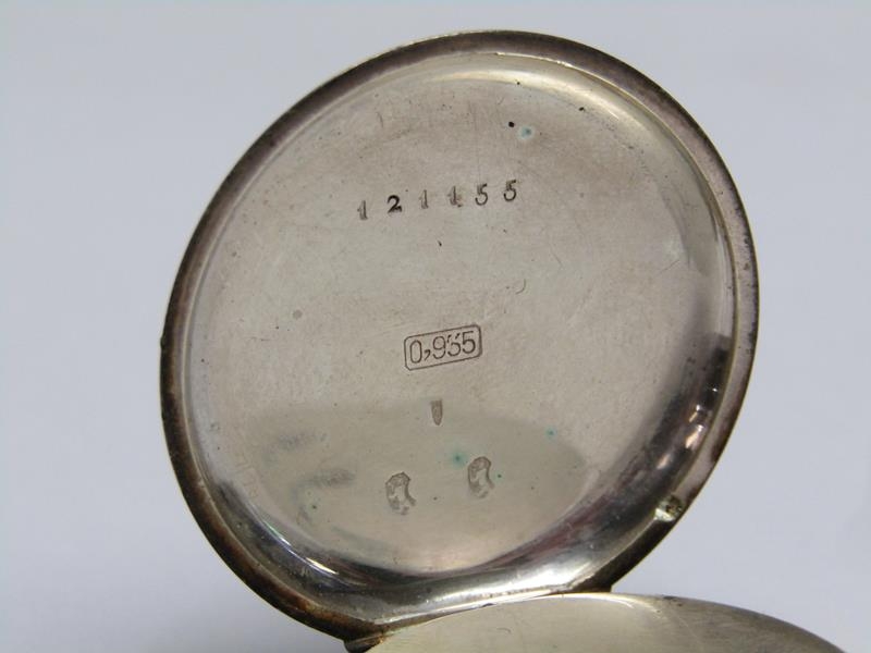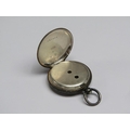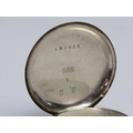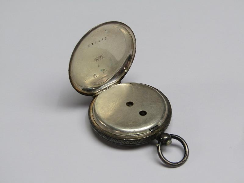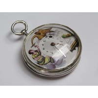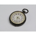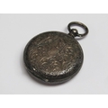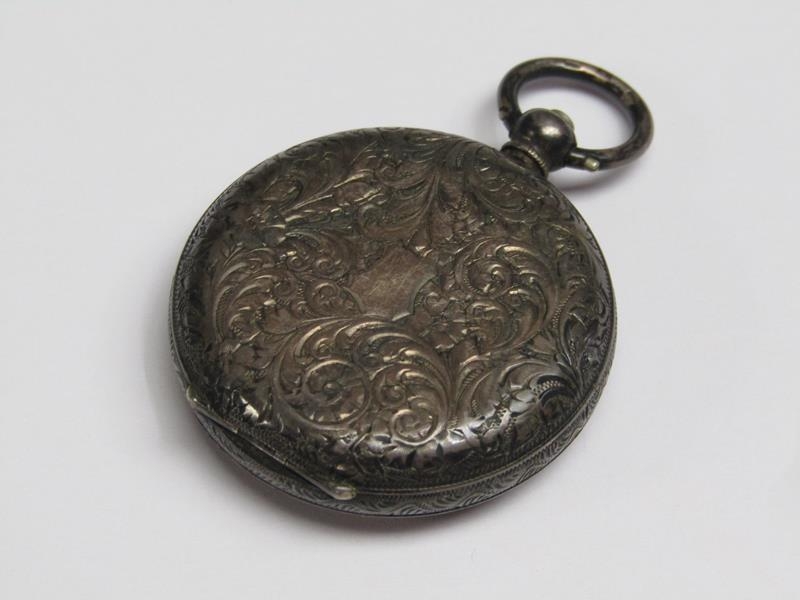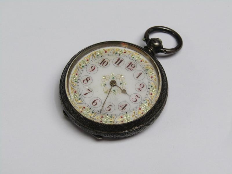 A late 19c Swiss lady's keywind fob watch in Continental silver case with engraved back and saides. The Swiss bar movement has a cylinder escapement with flat balance and the white enamel dial has arabic numerals and gold floral decoration around the dial edge an in its centre. The watch is 3.5cm diam.