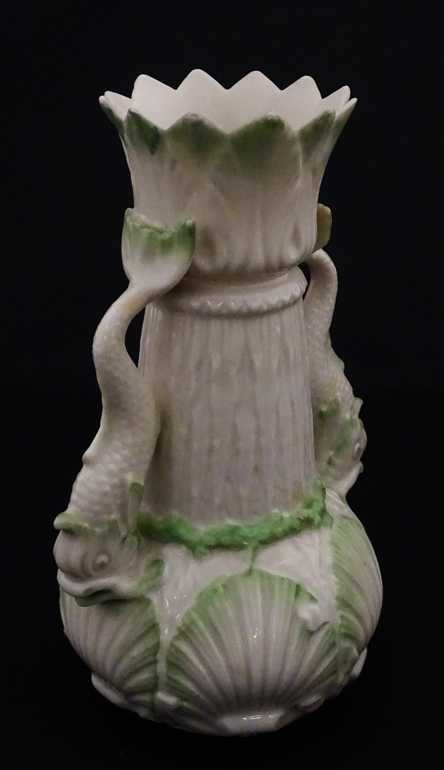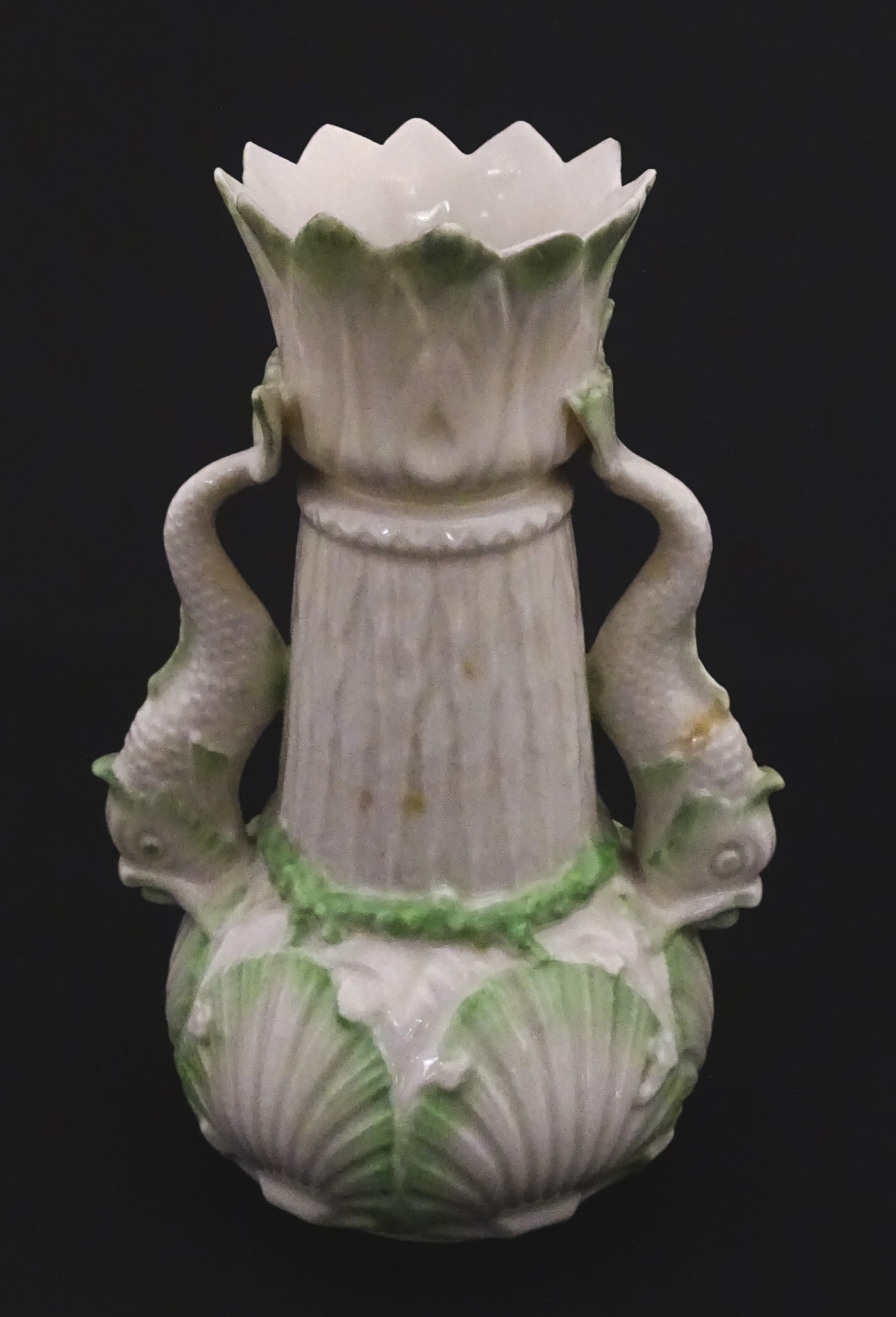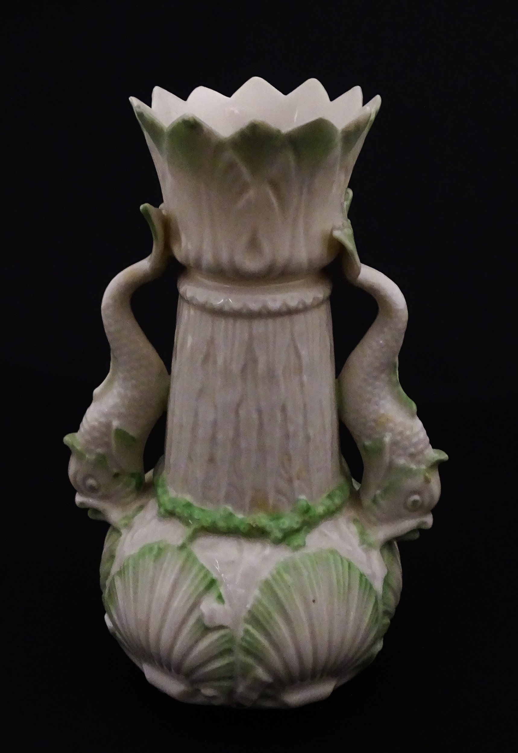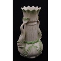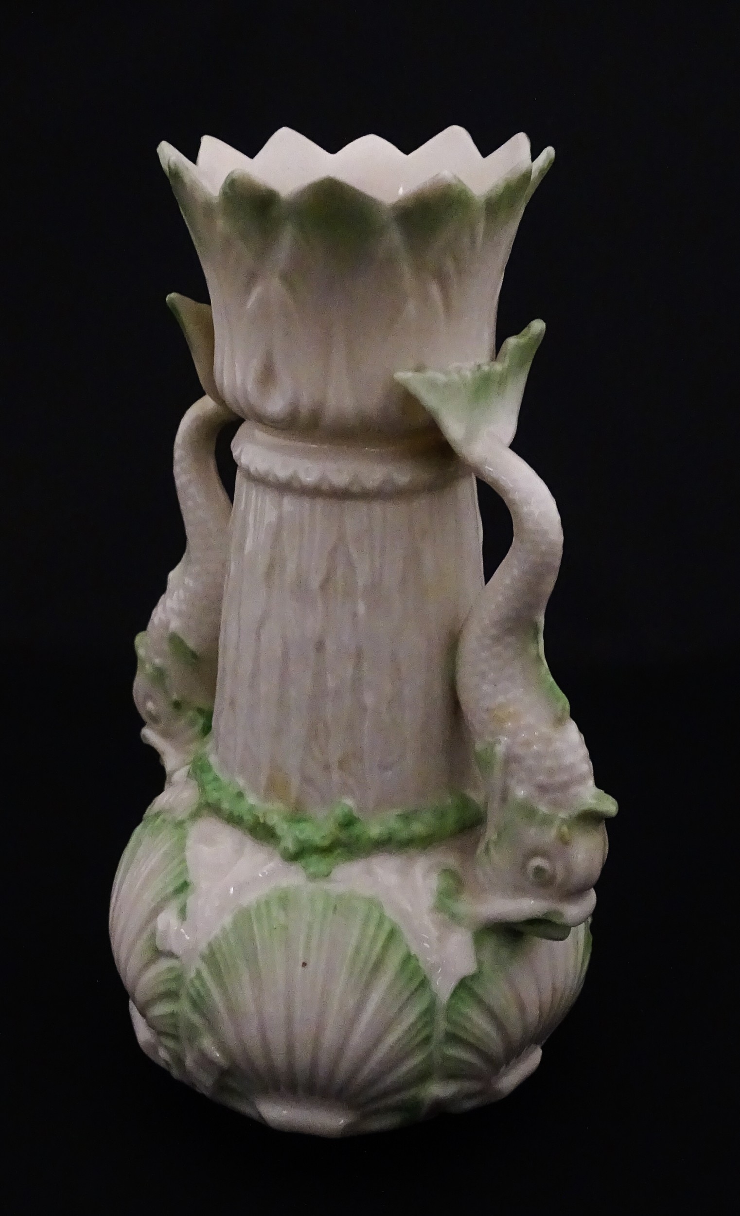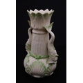 A Belleek dolphin spill vase with twin fish handles and shell detail to base. Marked with Second Period mark under. Approx. 6" high