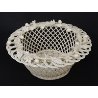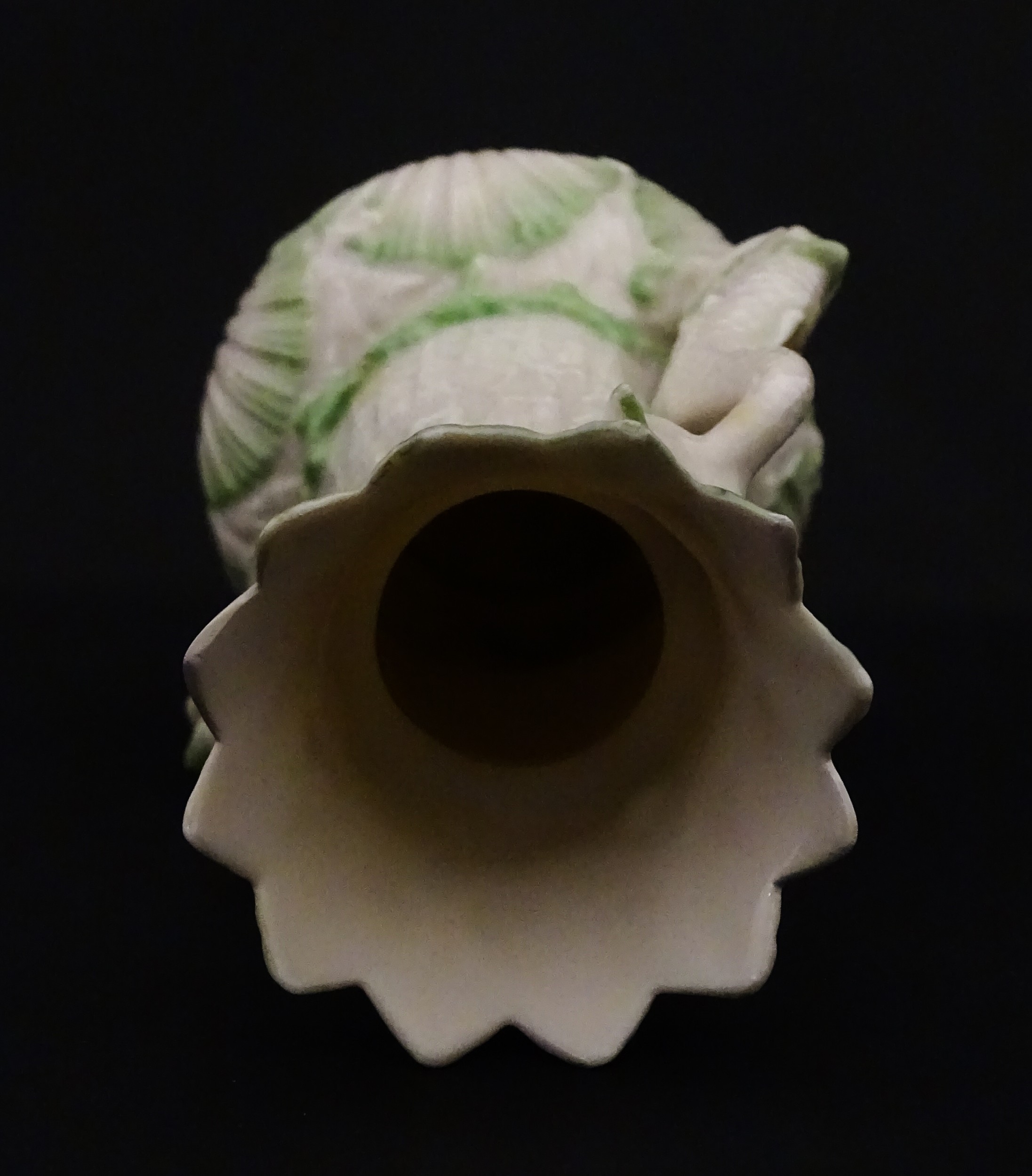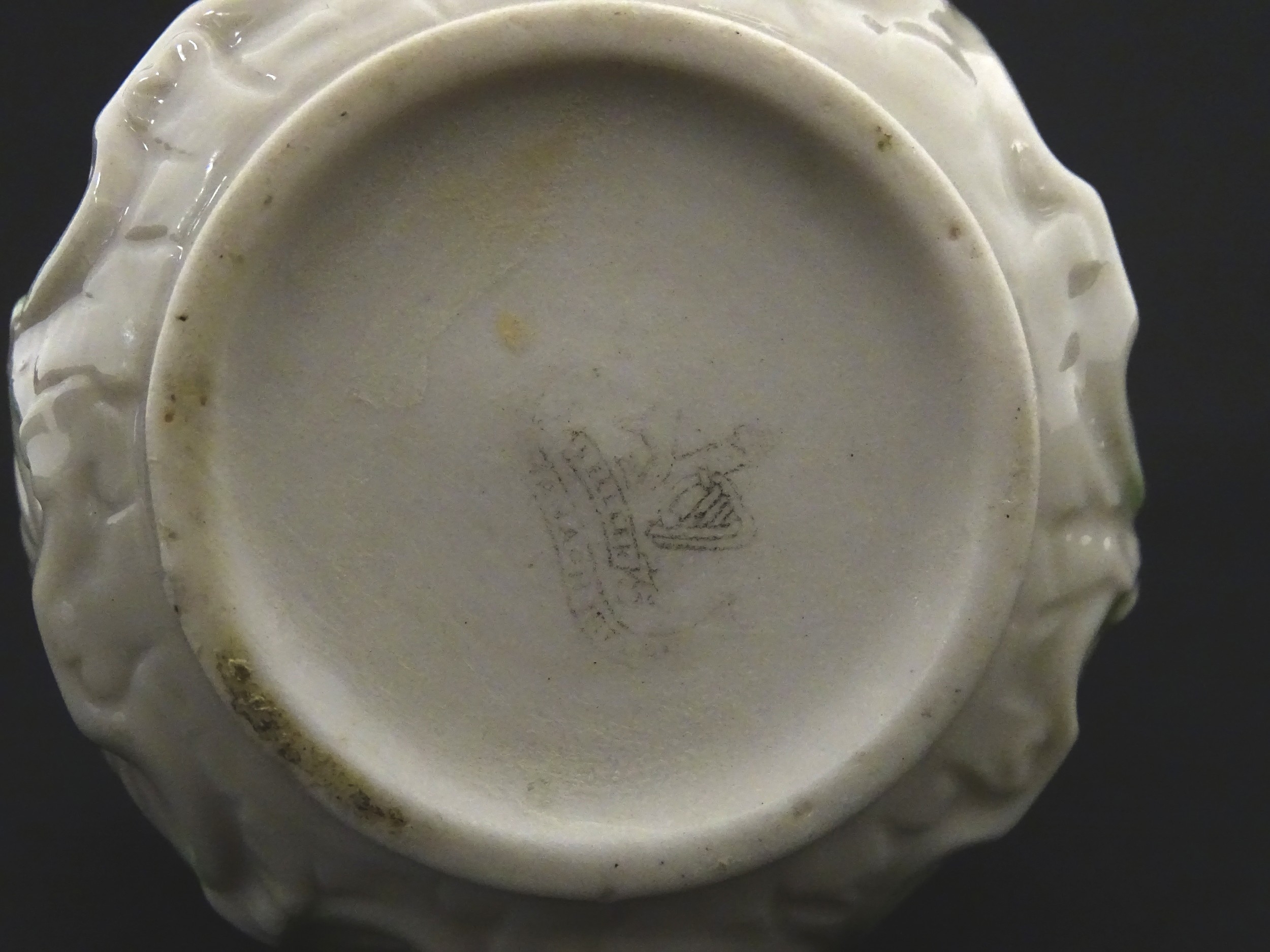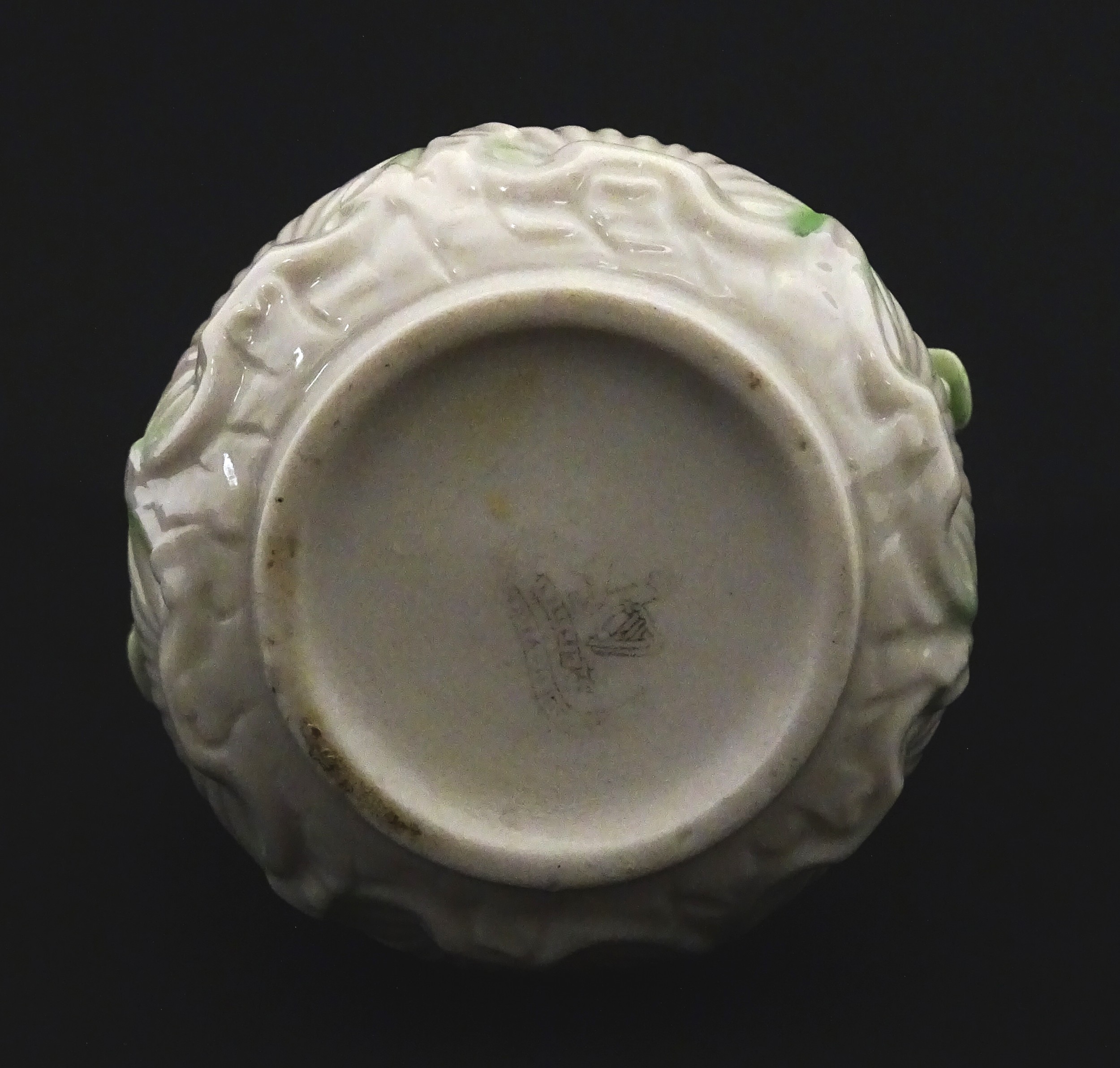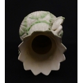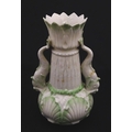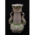 A Belleek dolphin spill vase with twin fish handles and shell detail to base. Marked with Second Period mark under. Approx. 6" high