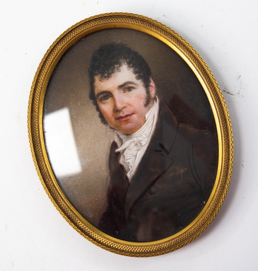 ATTRIBUTED TO HENRY BONE, PORTRAIT MINIATURE OF M T SADLER, 1780, 3 ½” x 2 ¾” (8.9cm x 7cm), attributed verso, in engine turned gilt metal frame