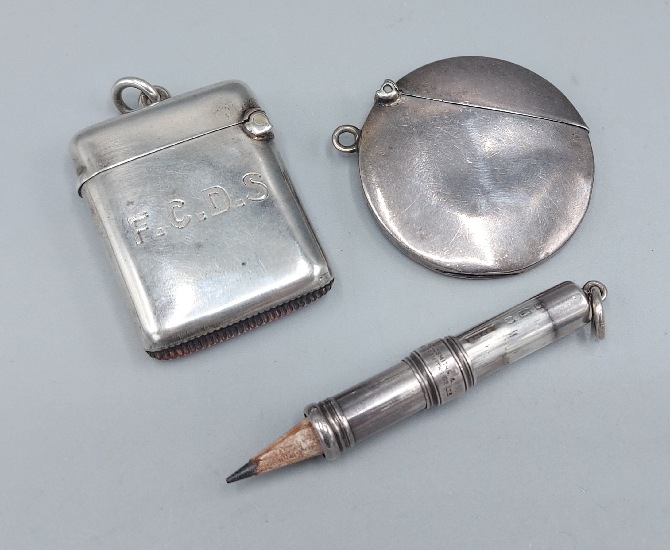 A Birmingham silver vesta case engraved with the initials F.C.D.S for Sir Frederick Charles Doveton Sturdee, together with a London silver circular vesta case and a silver propelling pencil
