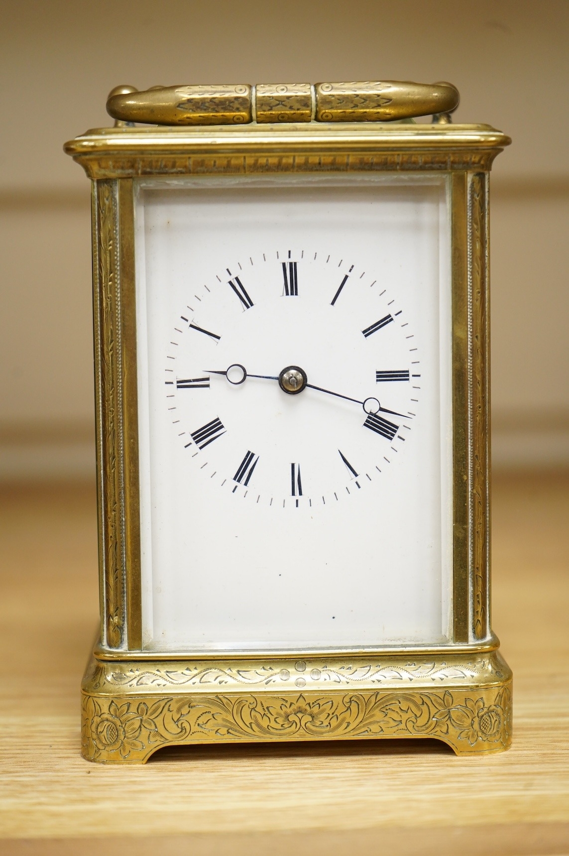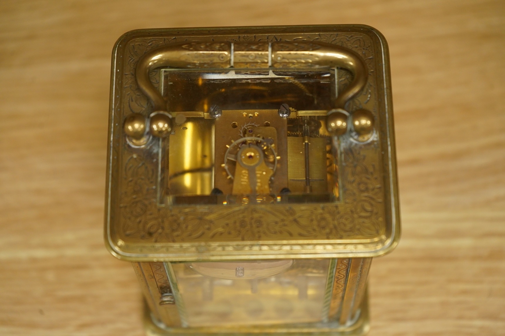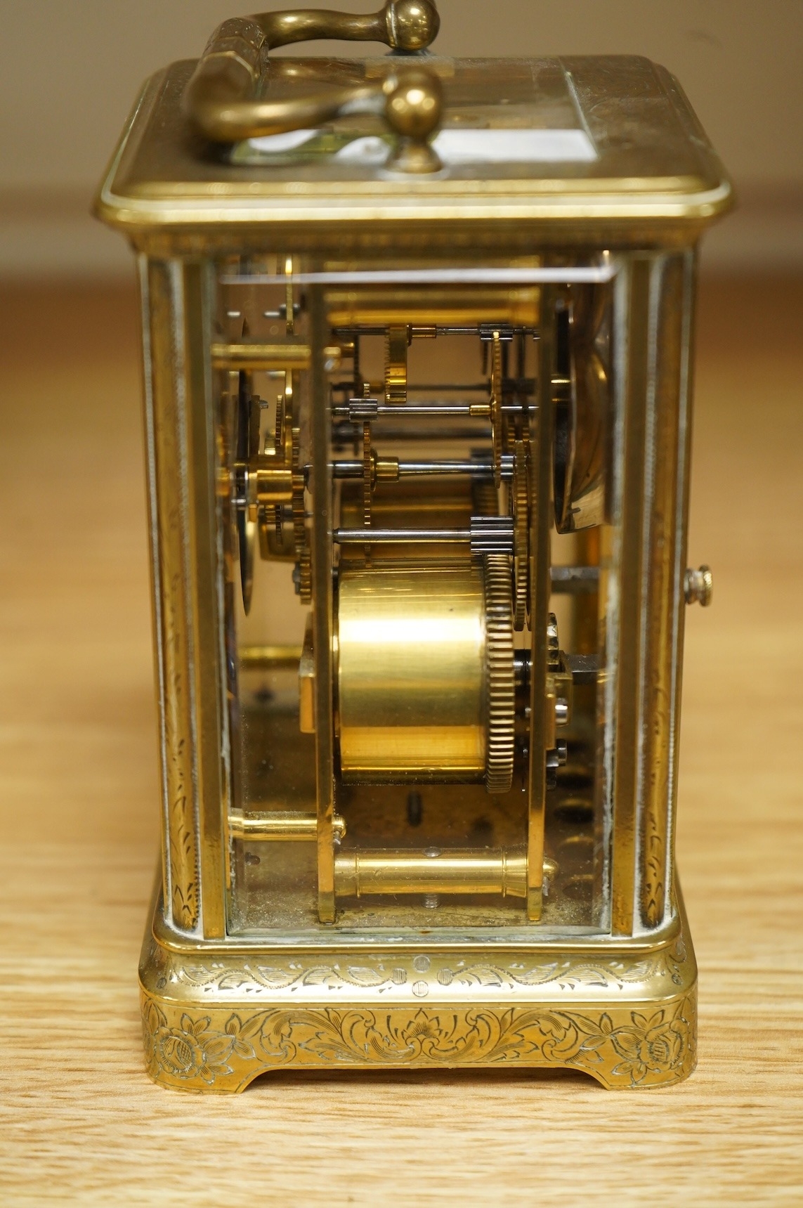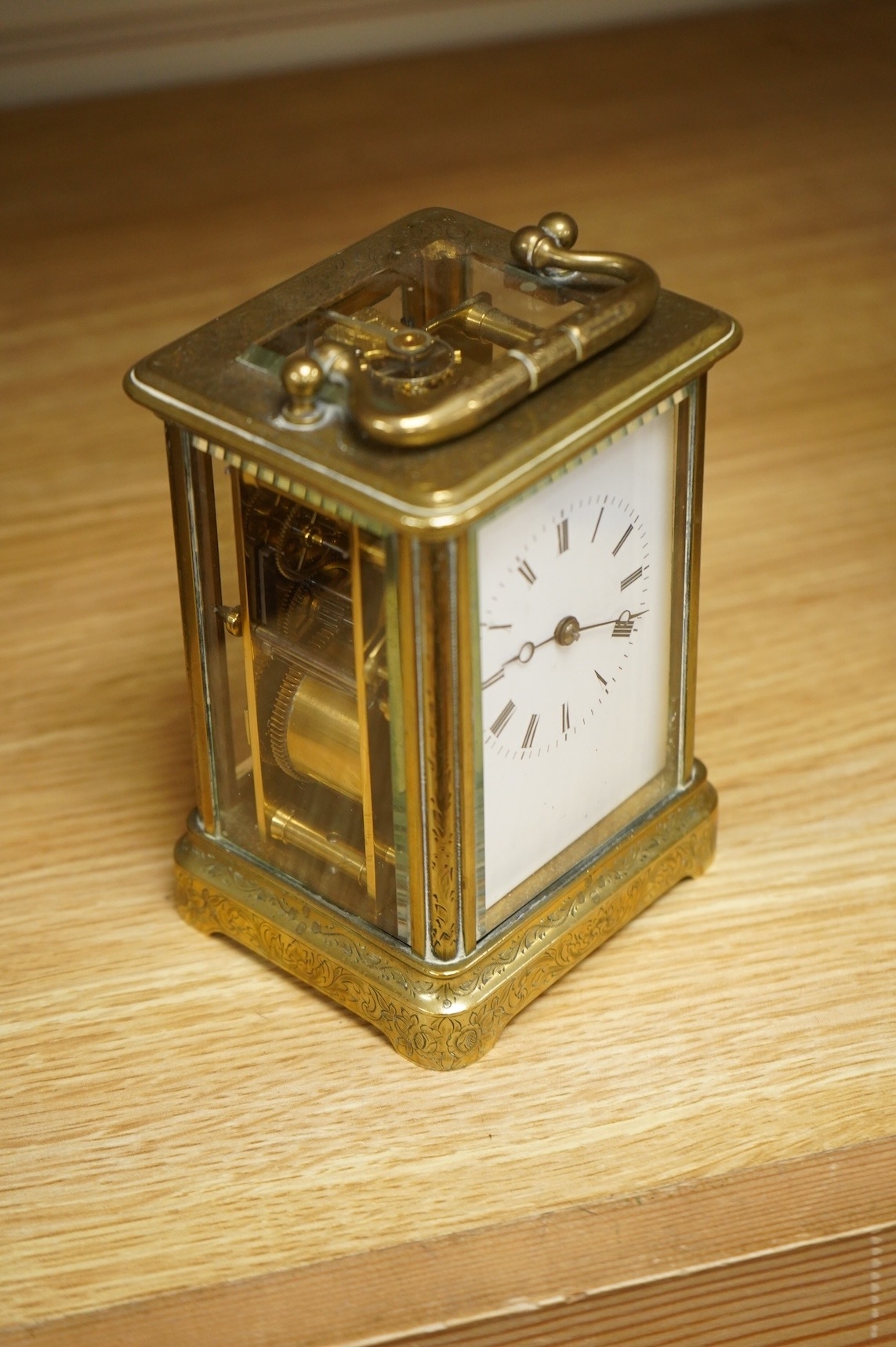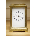 A late 19th century French engraved brass eight-day carriage clock, striking hours and half-hours on a bell - 16 high