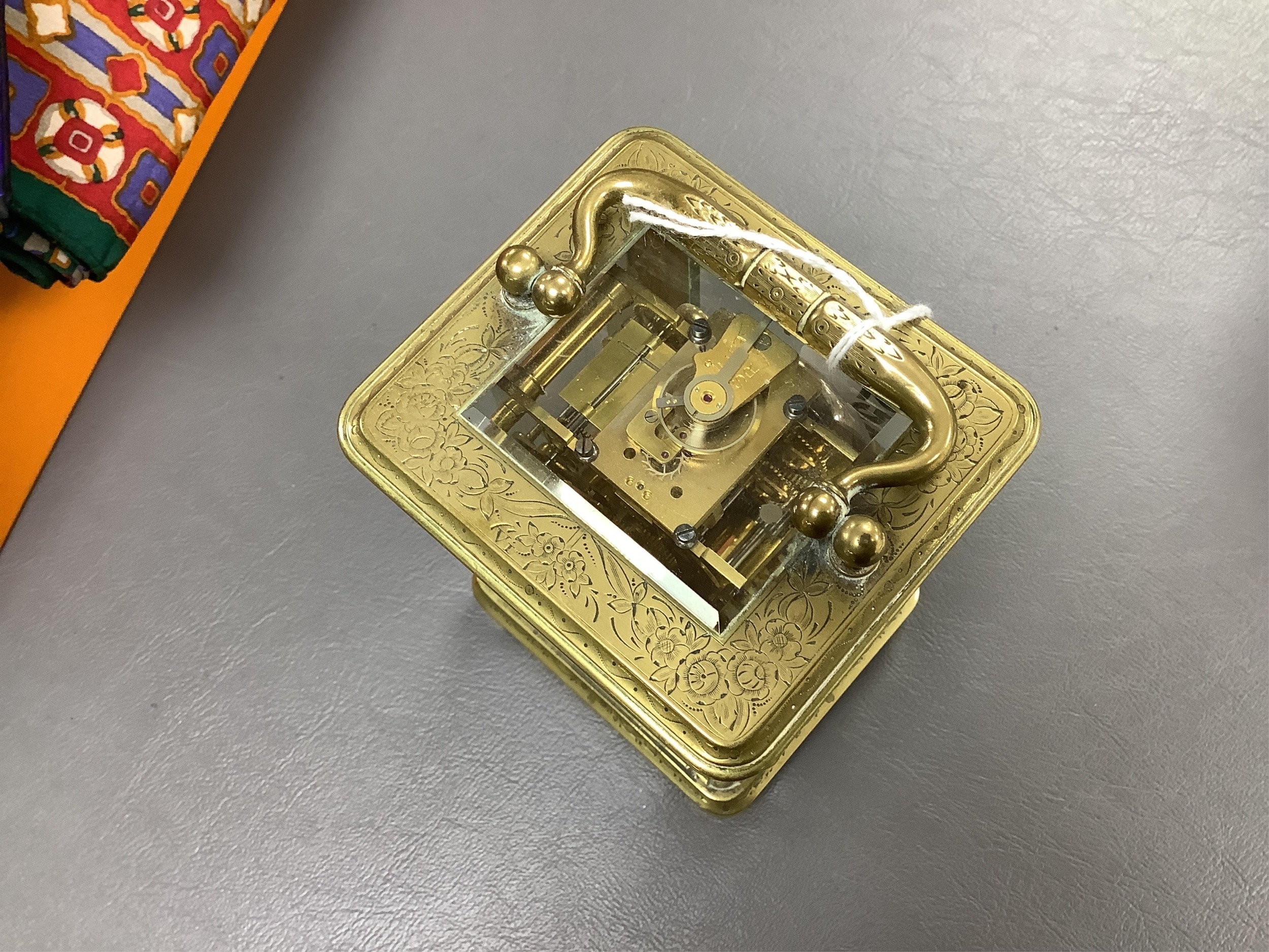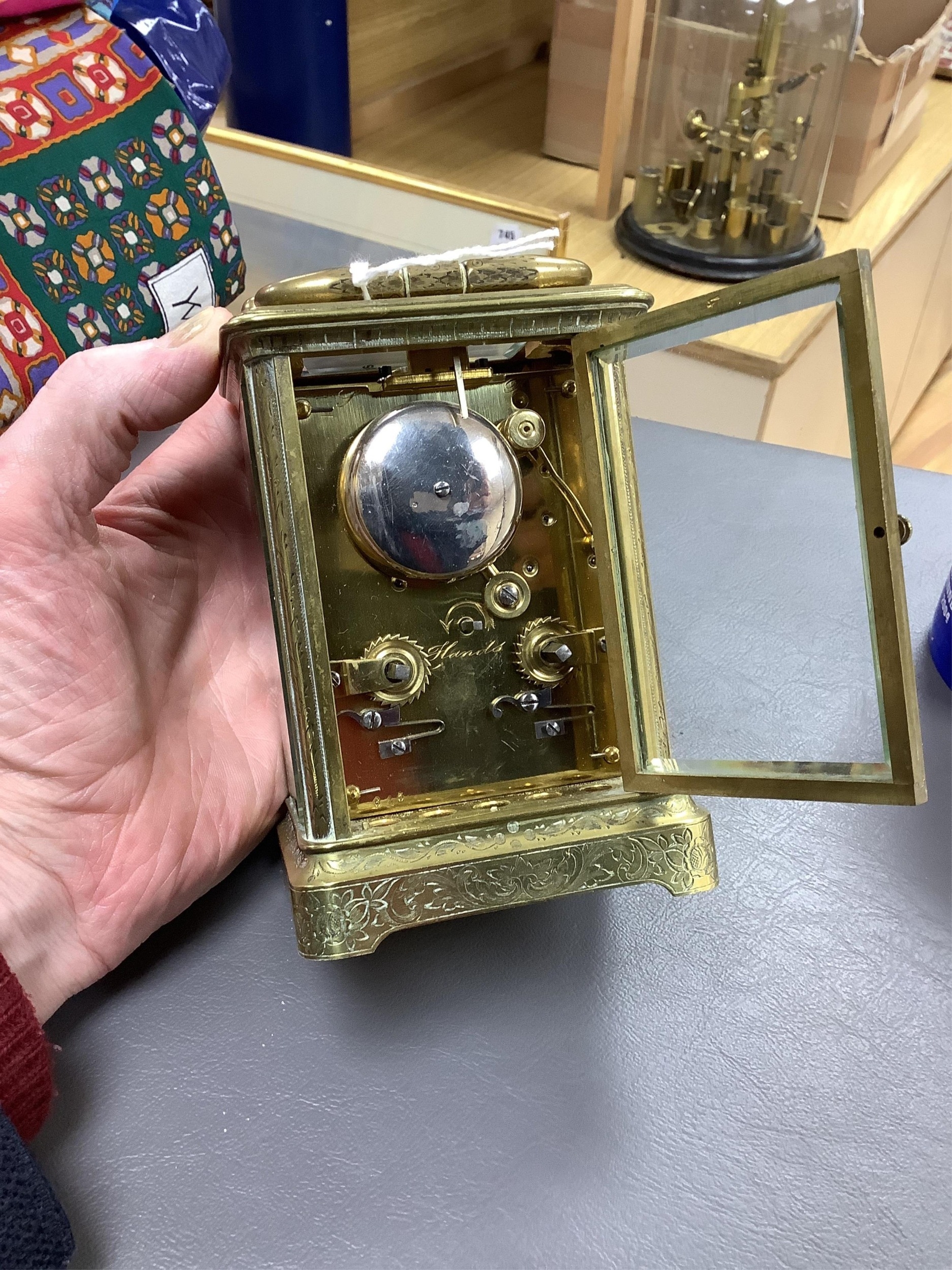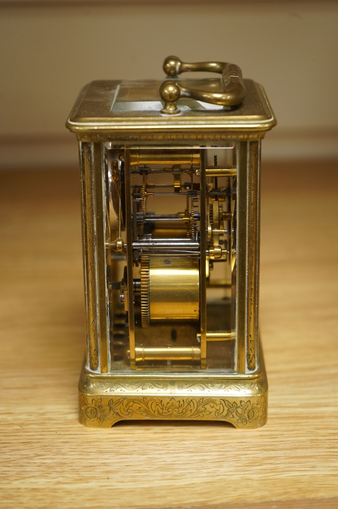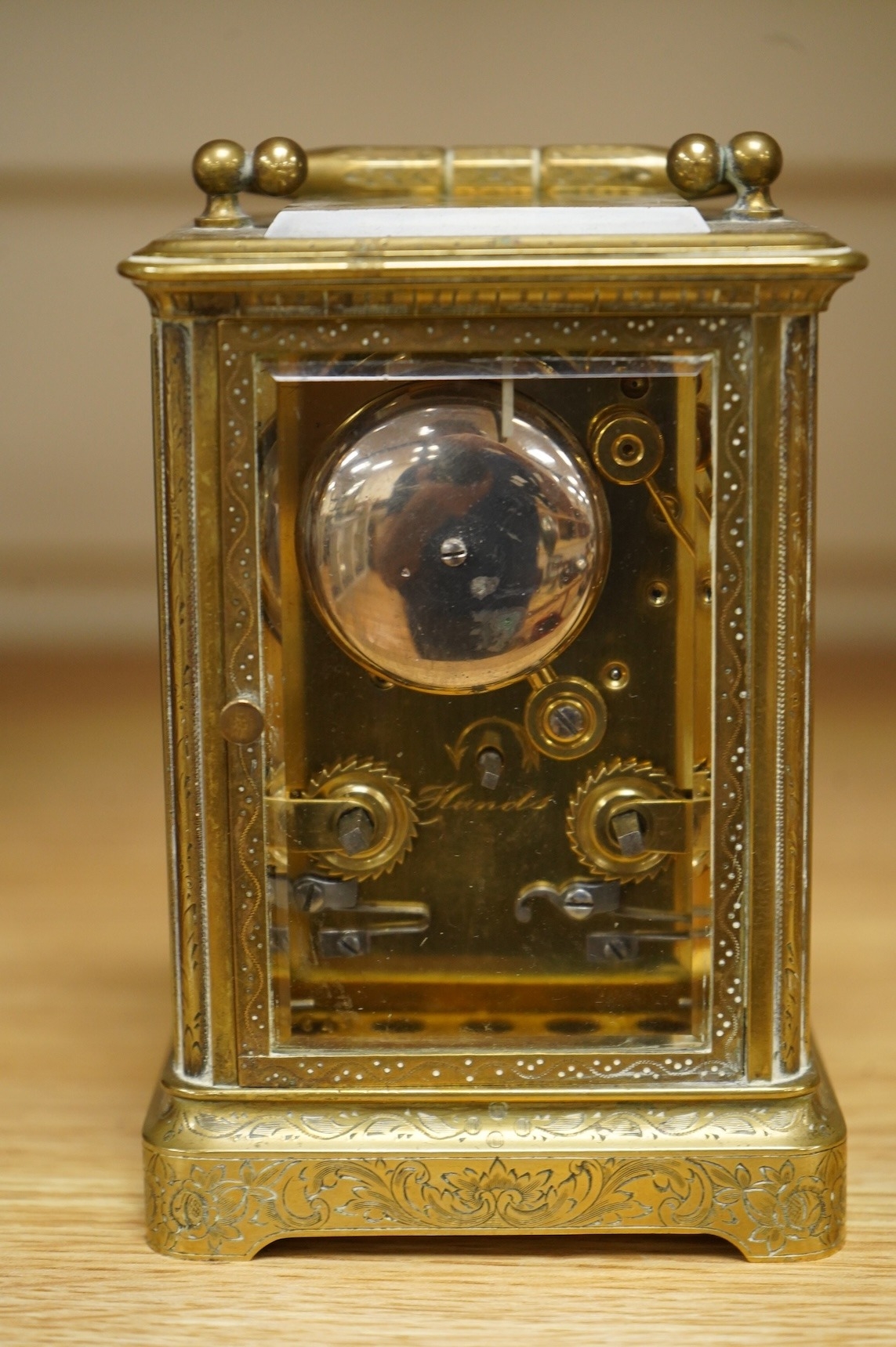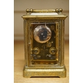 A late 19th century French engraved brass eight-day carriage clock, striking hours and half-hours on a bell - 16 high