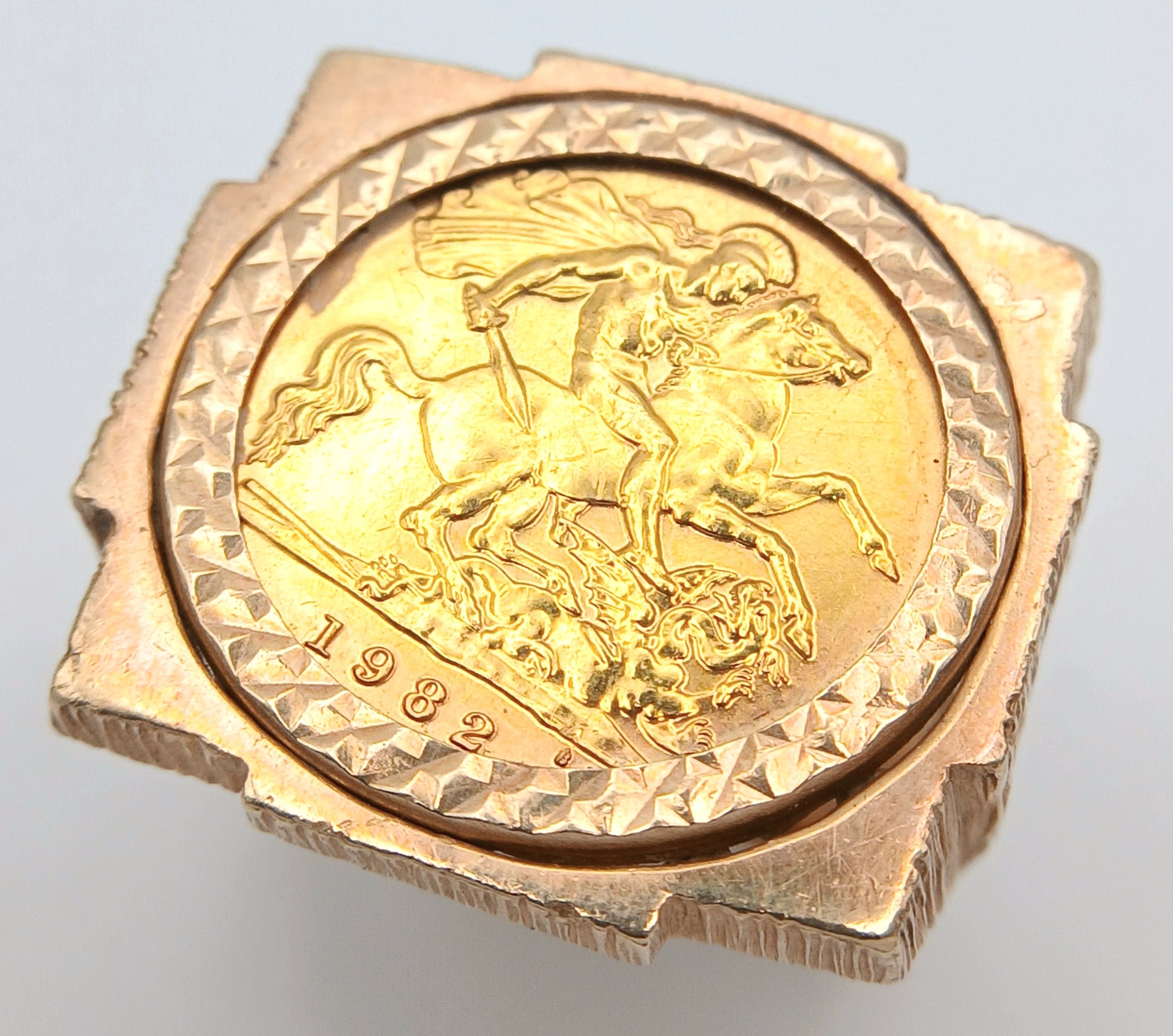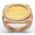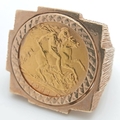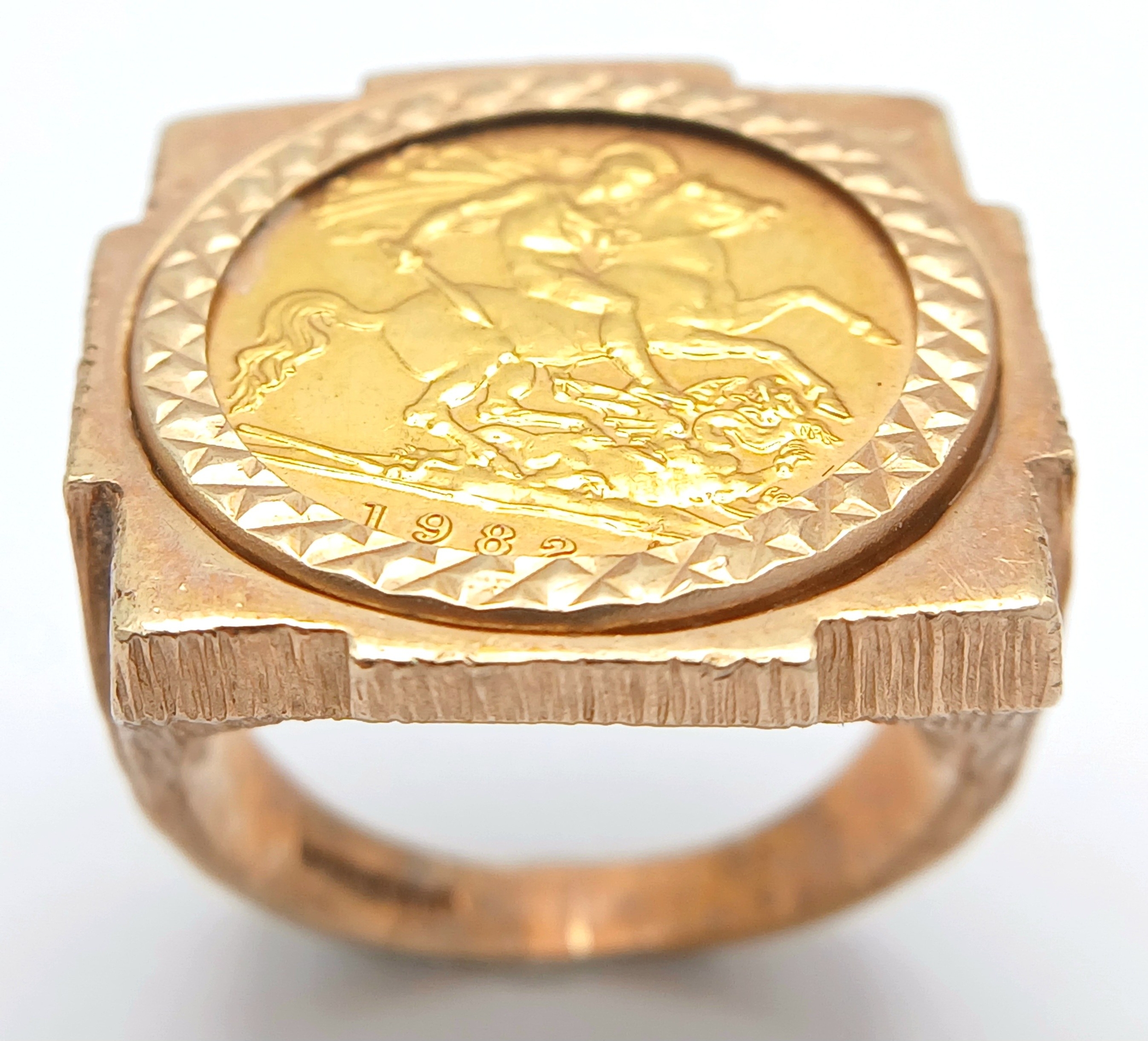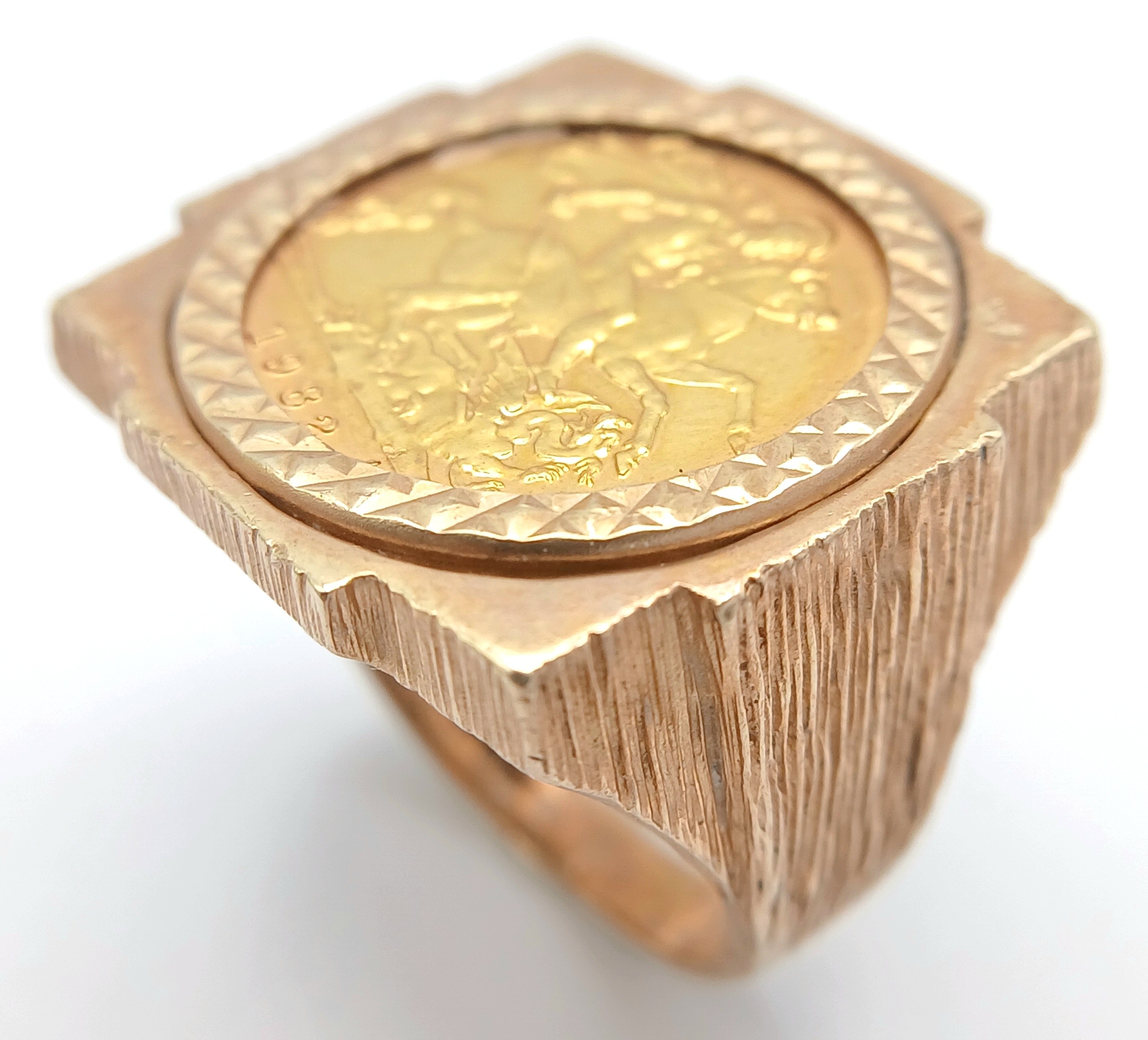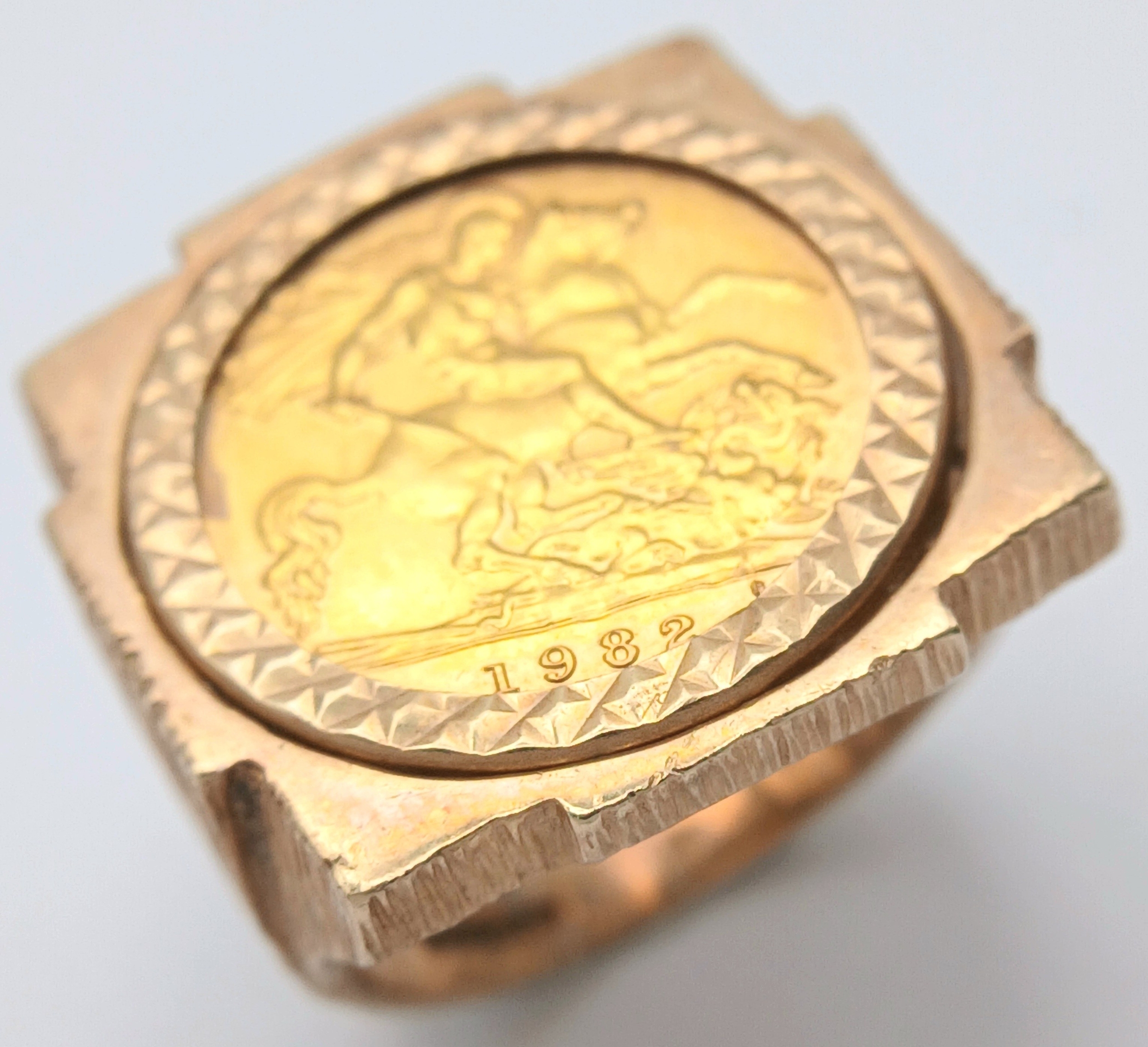 A 1982 HALF SOVEREIGN COIN SET IN A 9K GOLD RING . 13.5gms TOTAL WEIGHT SIZE Q/R