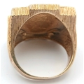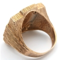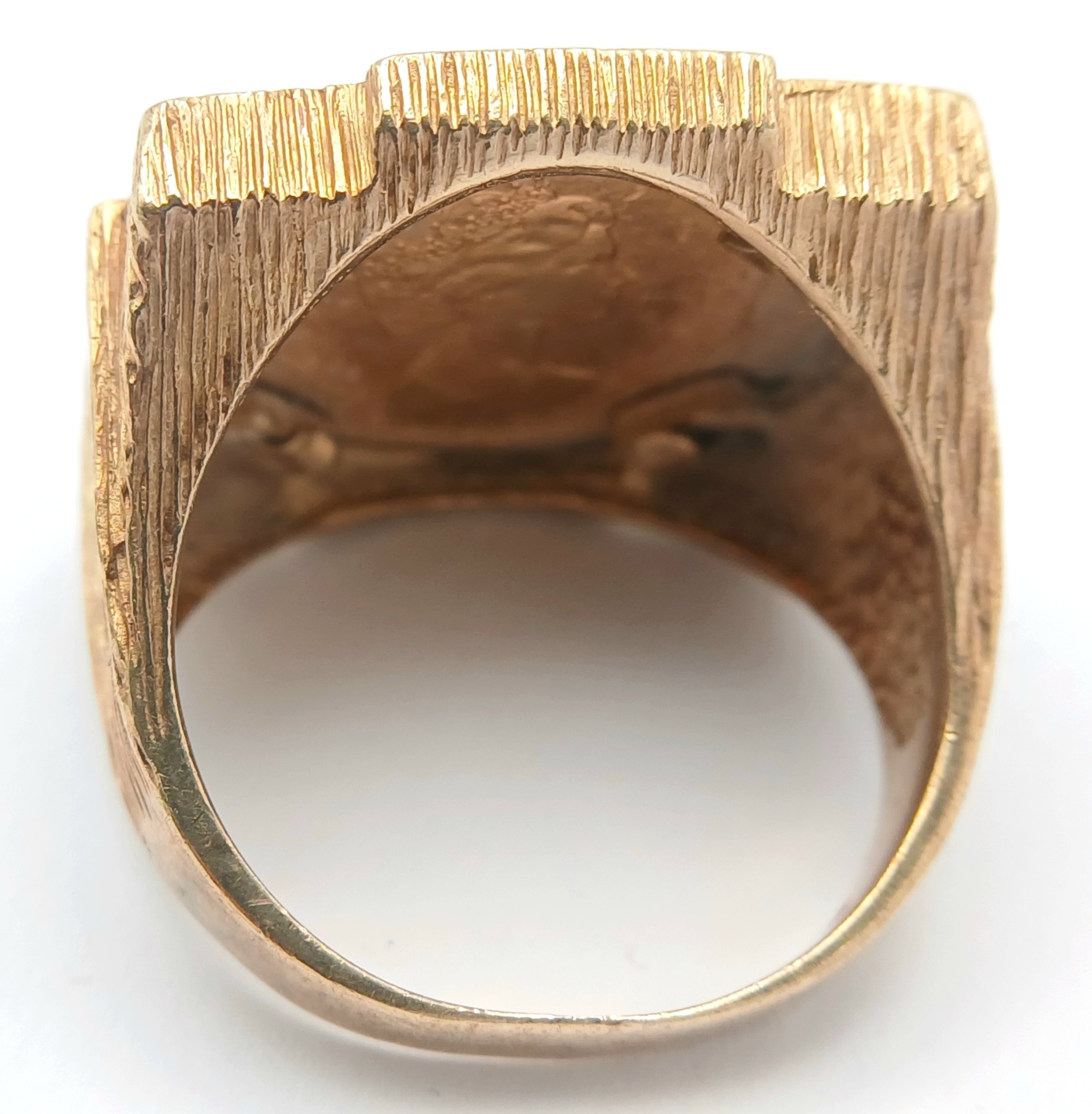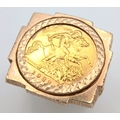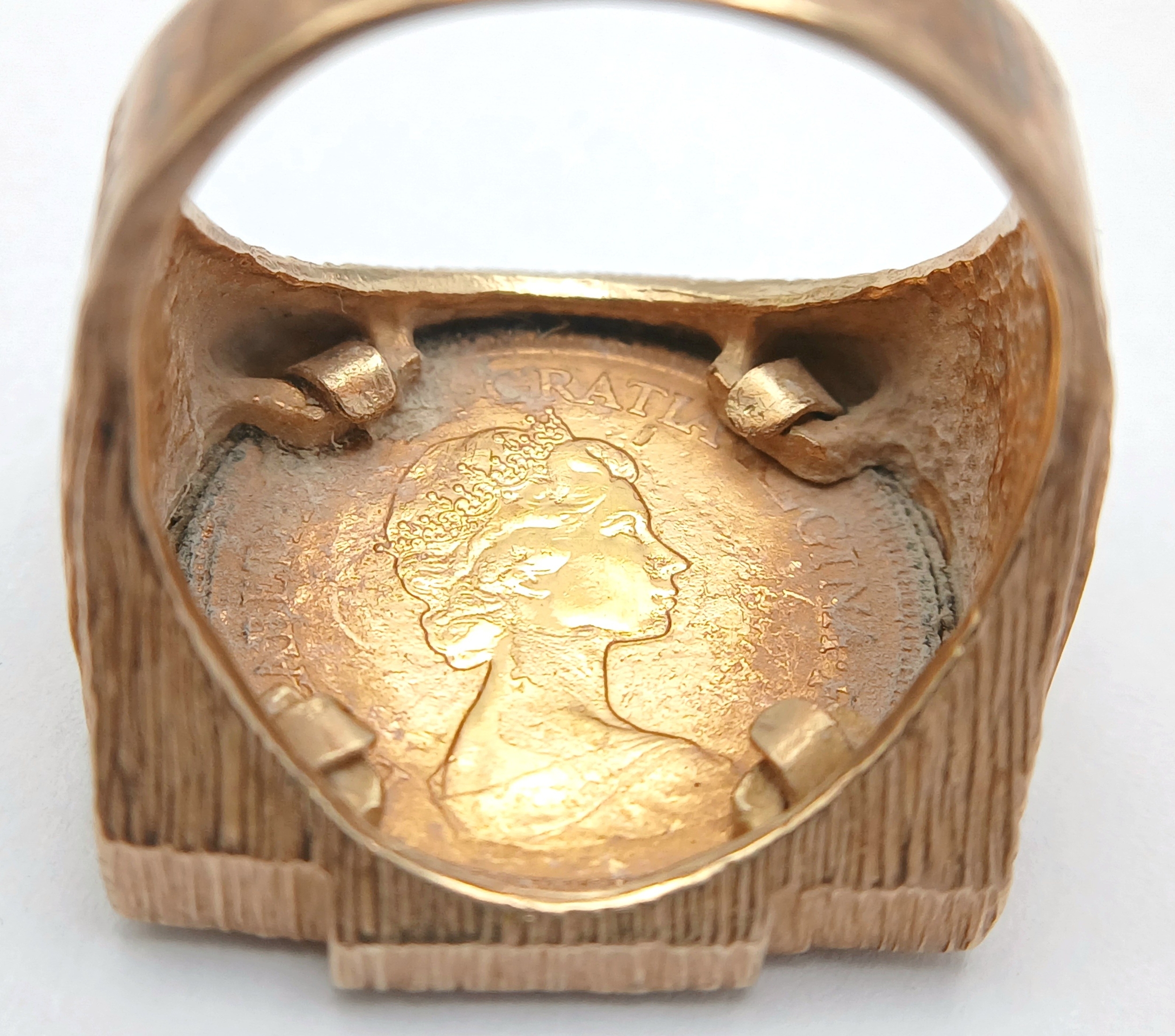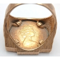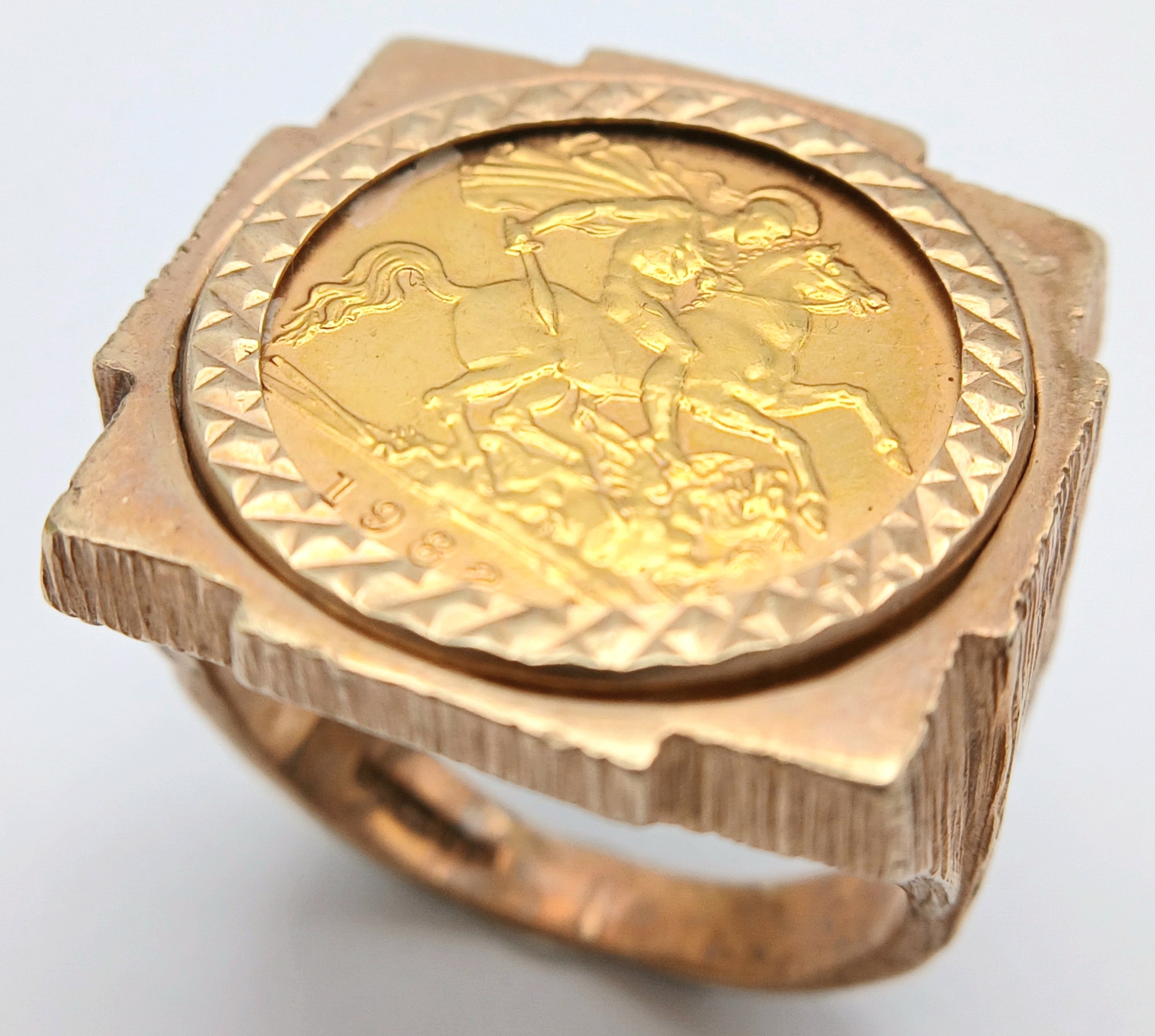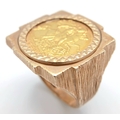 A 1982 HALF SOVEREIGN COIN SET IN A 9K GOLD RING . 13.5gms TOTAL WEIGHT SIZE Q/R