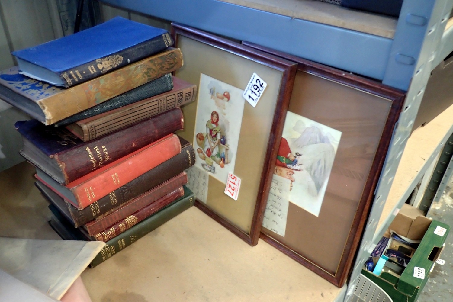 Eleven vintage books including Charles dickens and two pictures. Not available for in-house P&P