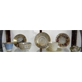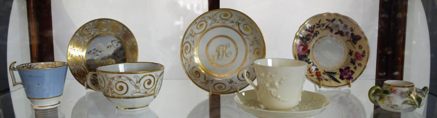 A Royal Worcester Blanc de Chine cabinet cup and saucer, finely press-moulded and applied with blossom, entwined branch handle, the saucer 13cm diam with green printed mark, c. 1880; a Barr, Flight & Barr Worcester Named-View saucer, View in Dove Dale, Derbyshire, titled to verso, gilt anthemion border, 13cm diam, c. 1810; Coalbrookdale-type; Worcester; etc