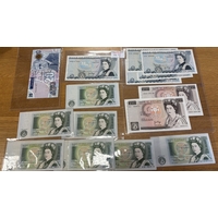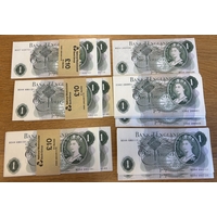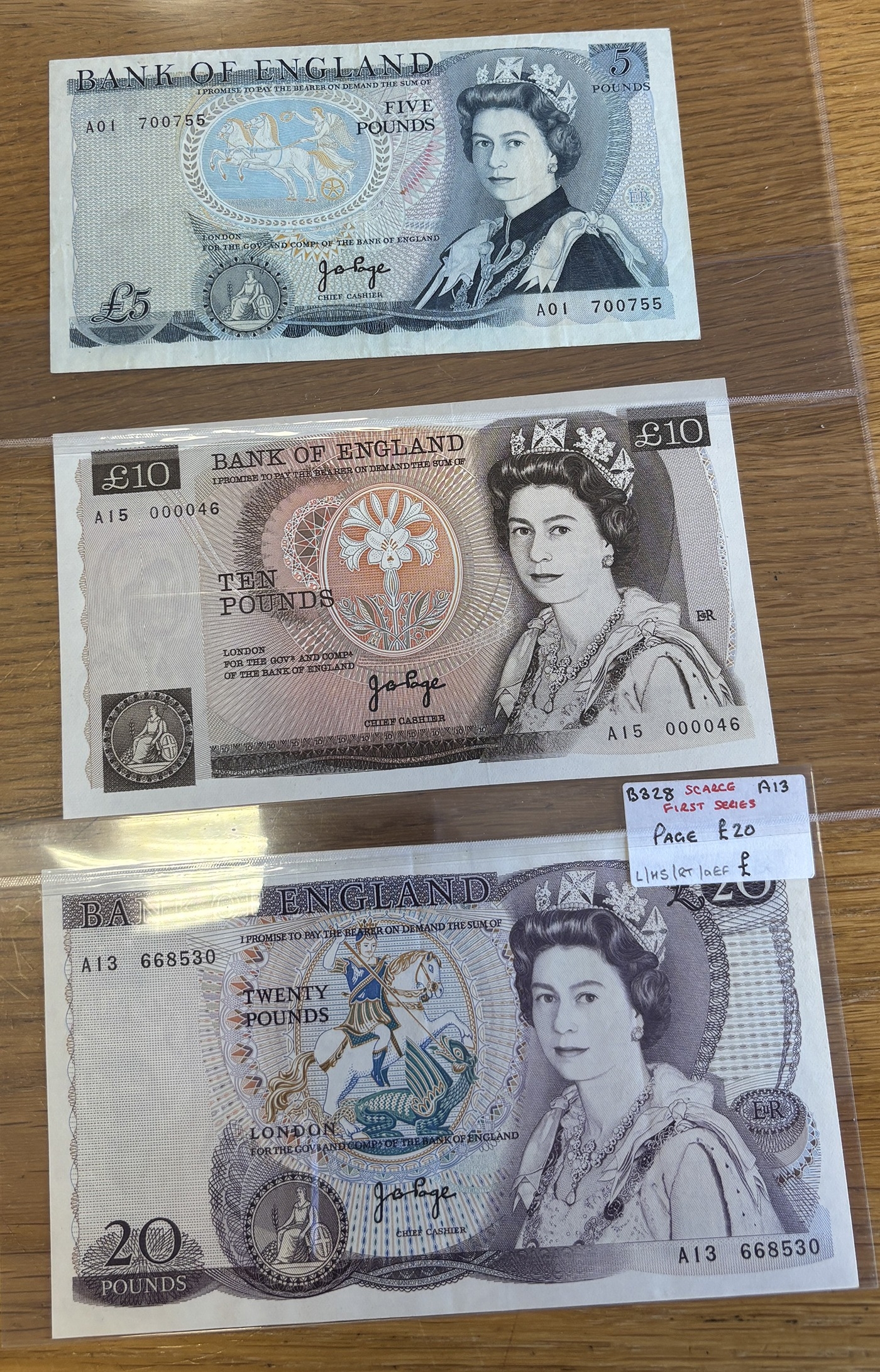 J.B. Page. Range in plastic wallets of uncirculated banknotes, including 1970 £20 A13, 1975 £10 A15 and 1971 £5 A01. Qty 3. (N)