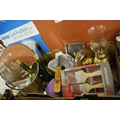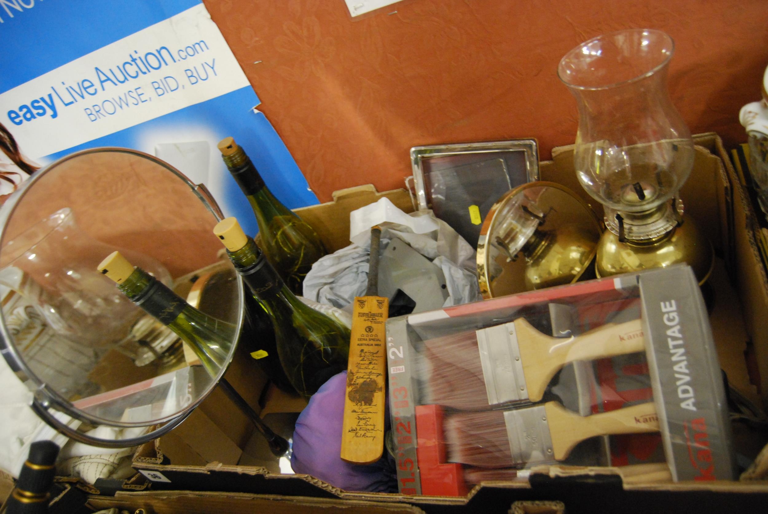 BOX OF MISCELLANEOUS ITEMS INCLUDING MAGNIFYING MIRROR, OIL LAMP, KANA PAINT BRUSH SET, ETC