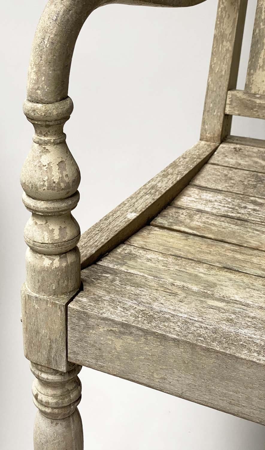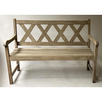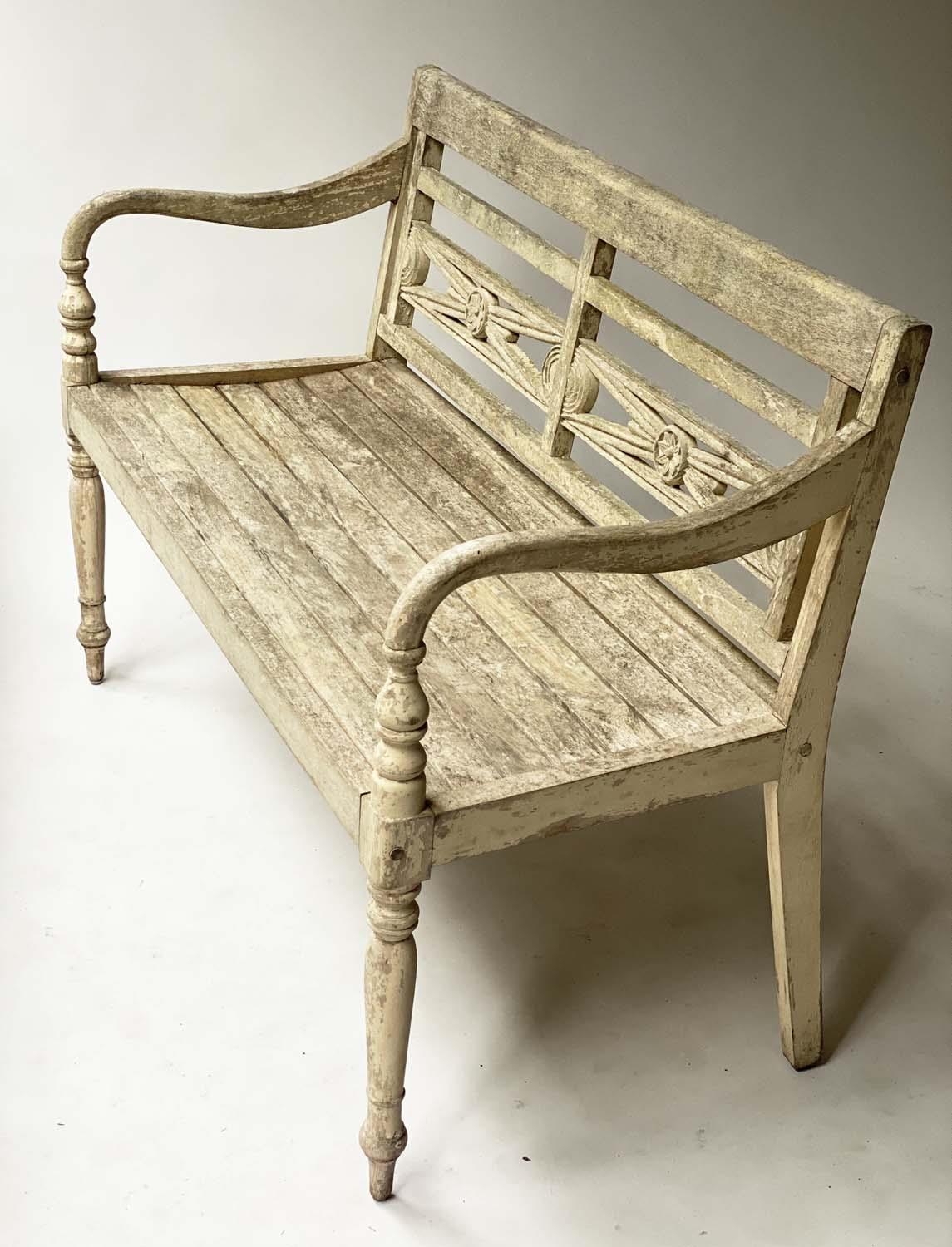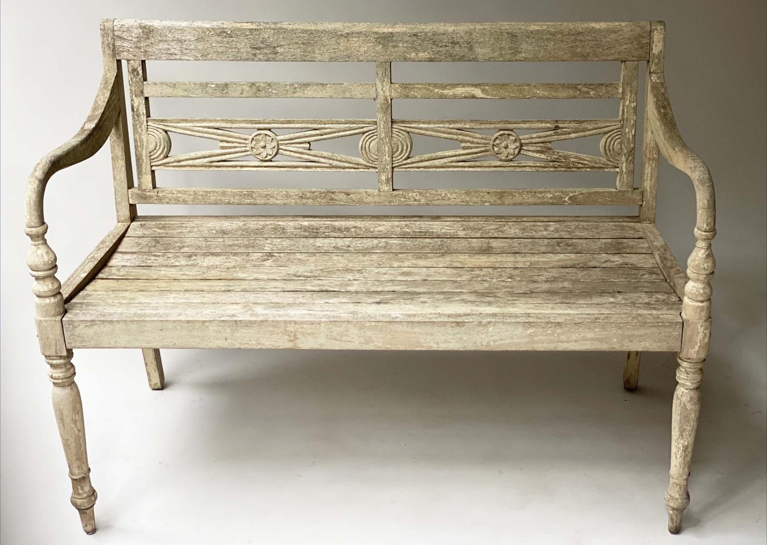 VERANDAH BENCH, silvery weathered teak Anglo-Indian with carved pierced backs and slatted seats, 115cm W.