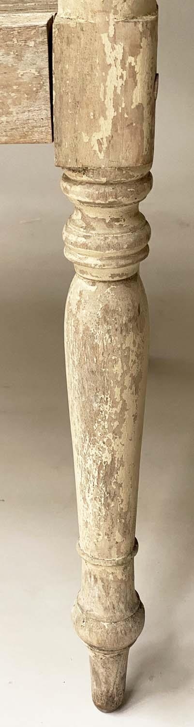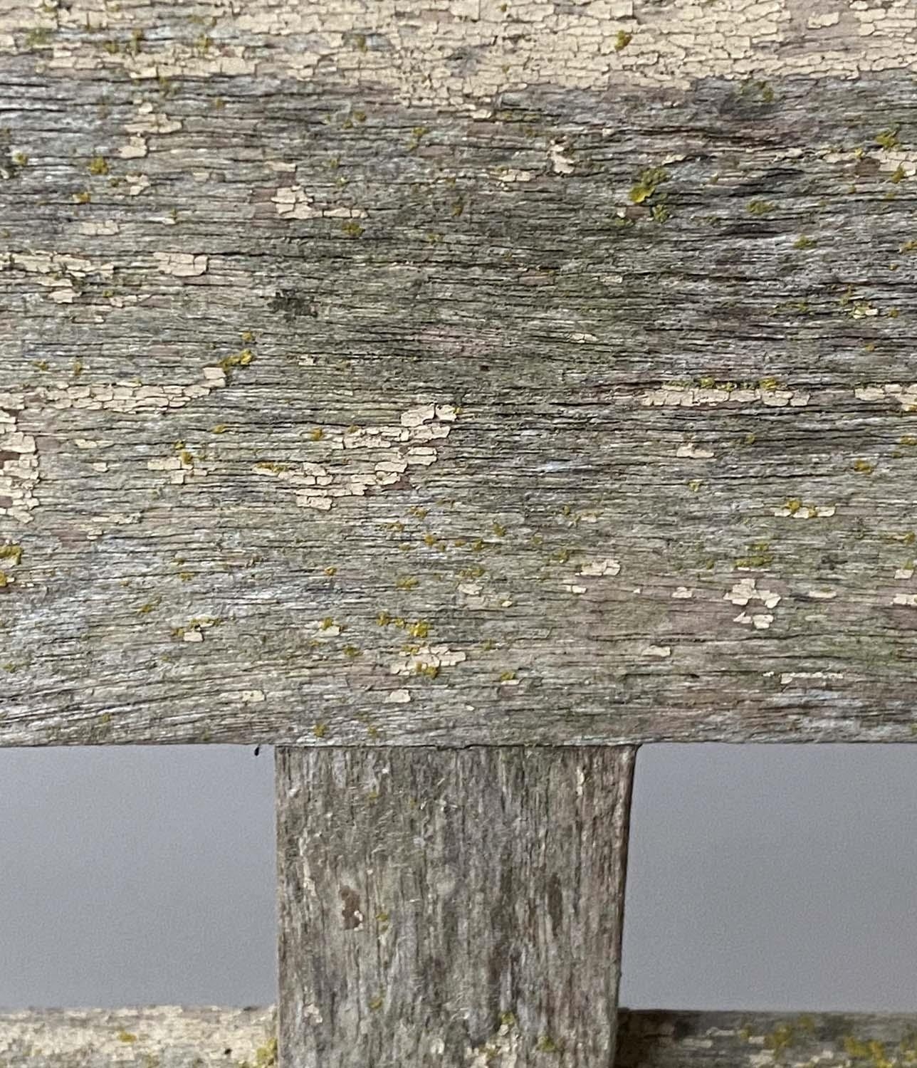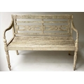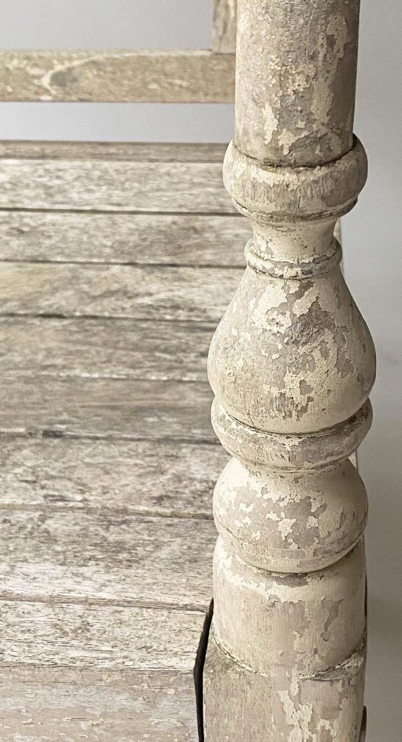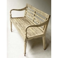 VERANDAH BENCH, silvery weathered teak Anglo-Indian with carved pierced backs and slatted seats, 115cm W.