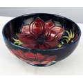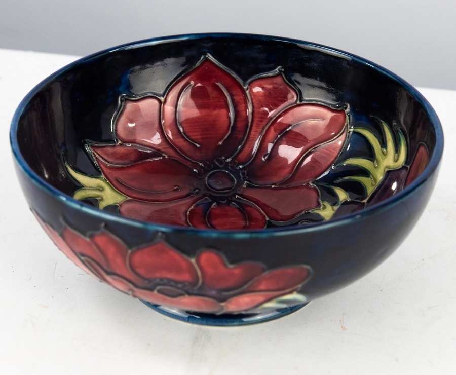 SECOND QUALITY WALTER MOORCROFT ANEMONE PATTERN TUBE LINED POTTERY BOWL, of steep sided, footed form, decorated in tones of red, blue and green, on an inky blue ground, 2 ¾” (7cm) high, 6 ¼” (15.9cm) diameter, impressed and painted marks, silver lined C/R- small glaze fault to the exterior ad light scratching, otherwise good