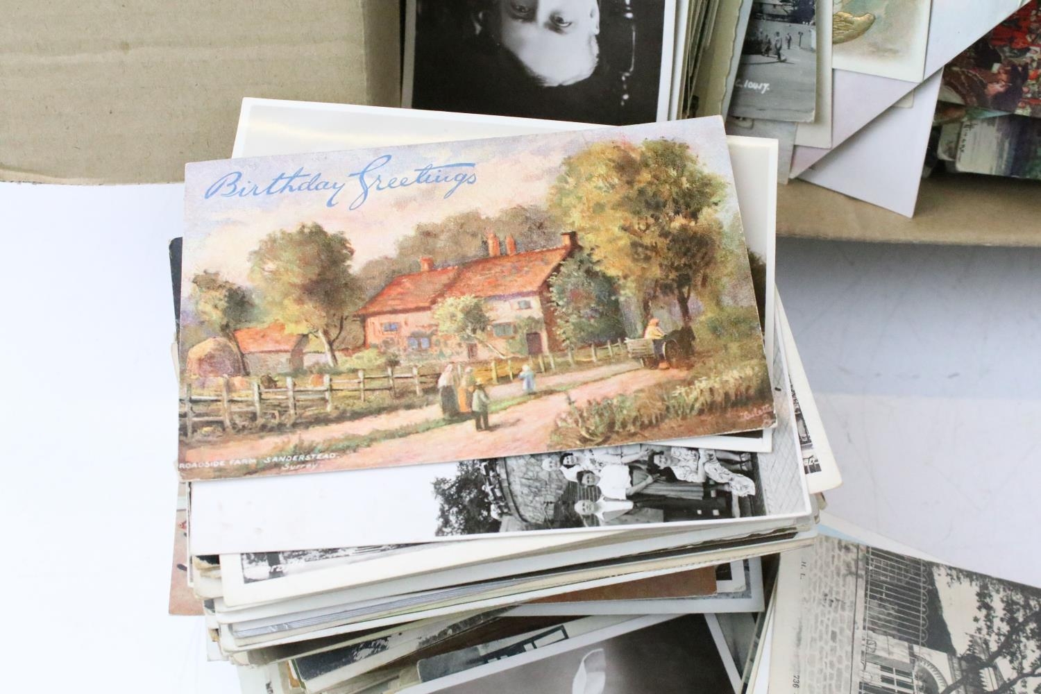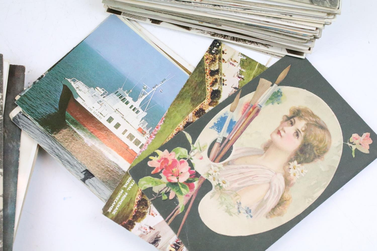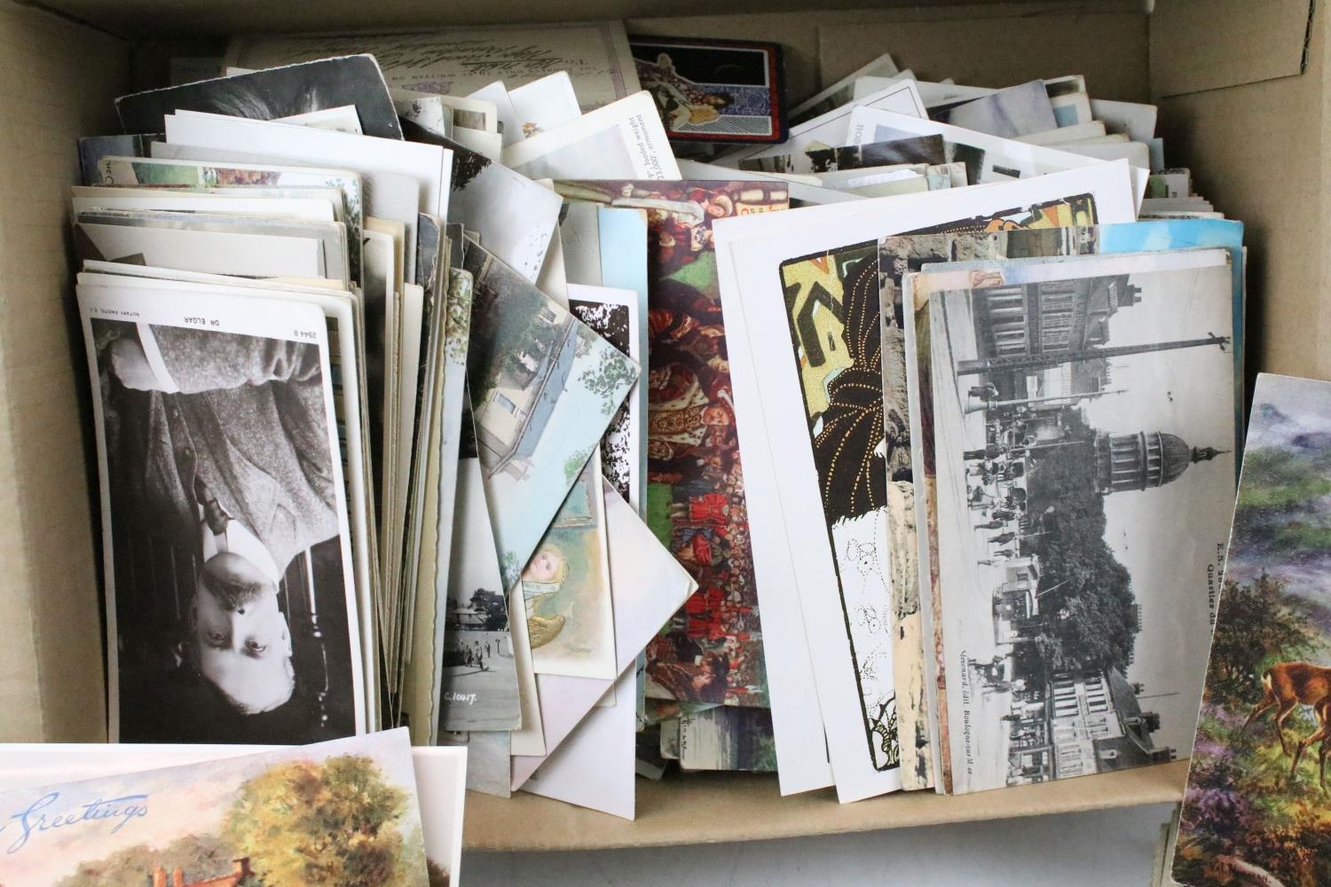 Large collection of pre-WW2 postcards to include British and international examples, the subjects featuring coastal scenes, photographic, maritime, animals, etc. (2 boxes)