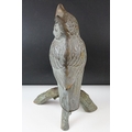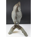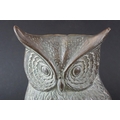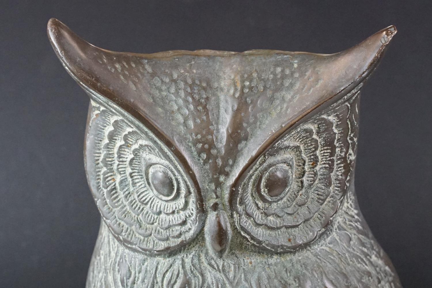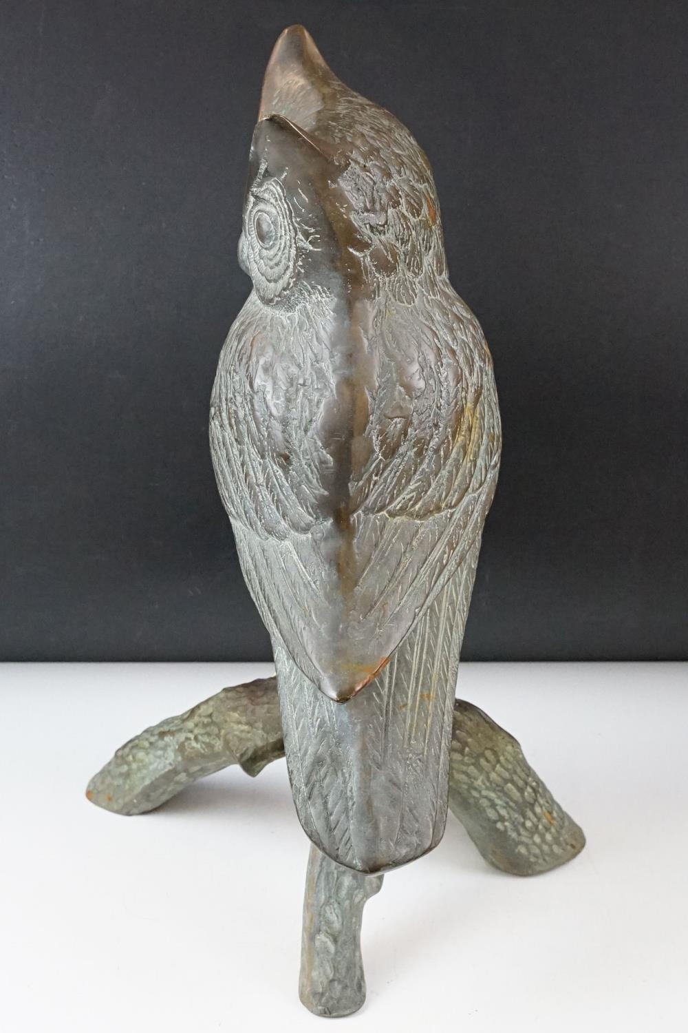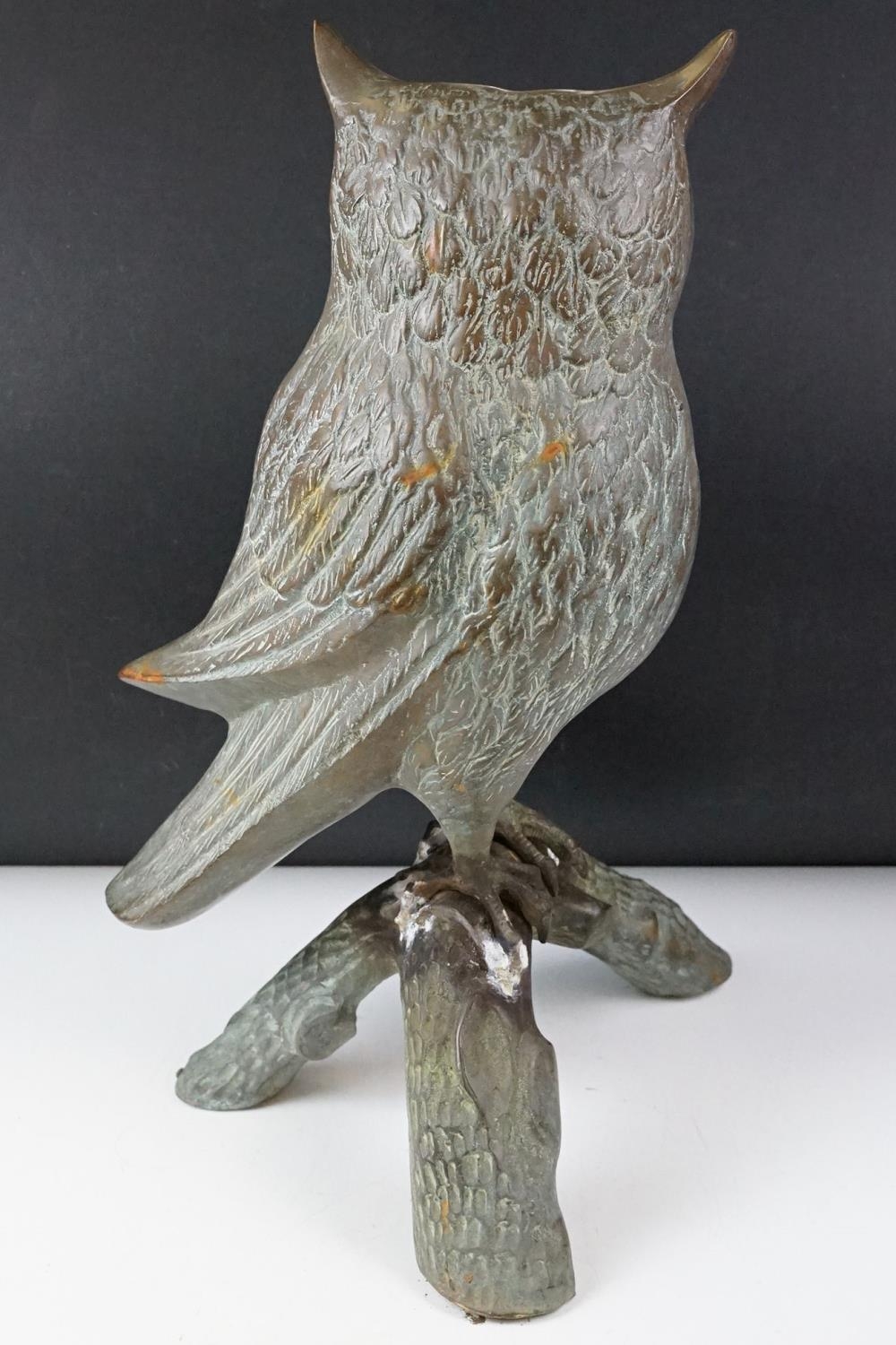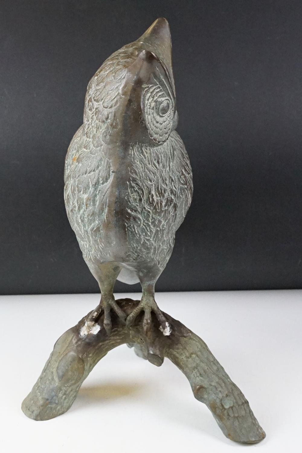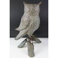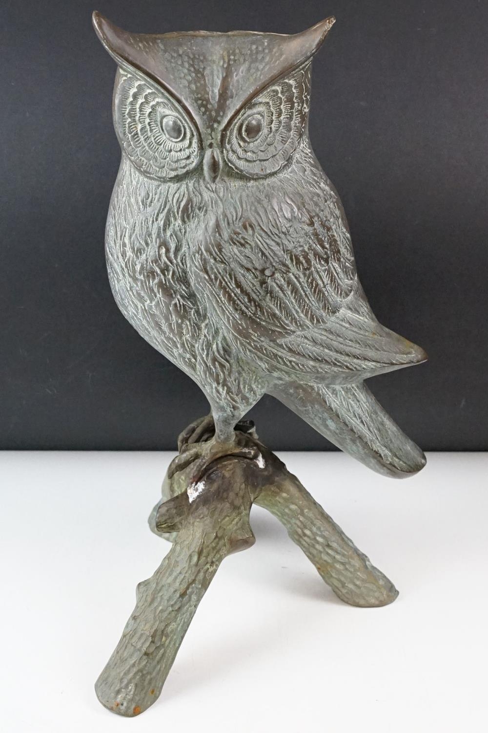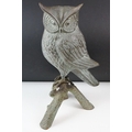 Large metal model of an owl perched on a branch, with verdigris effect finish, approx 48cm high