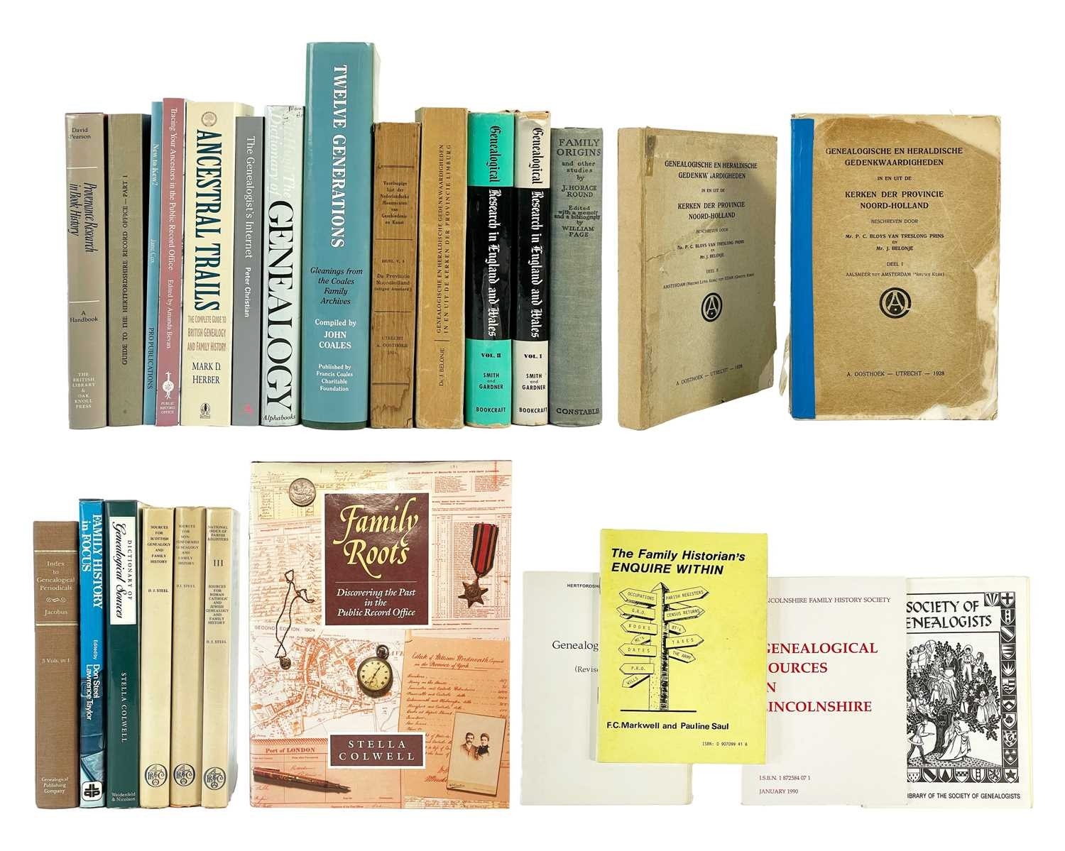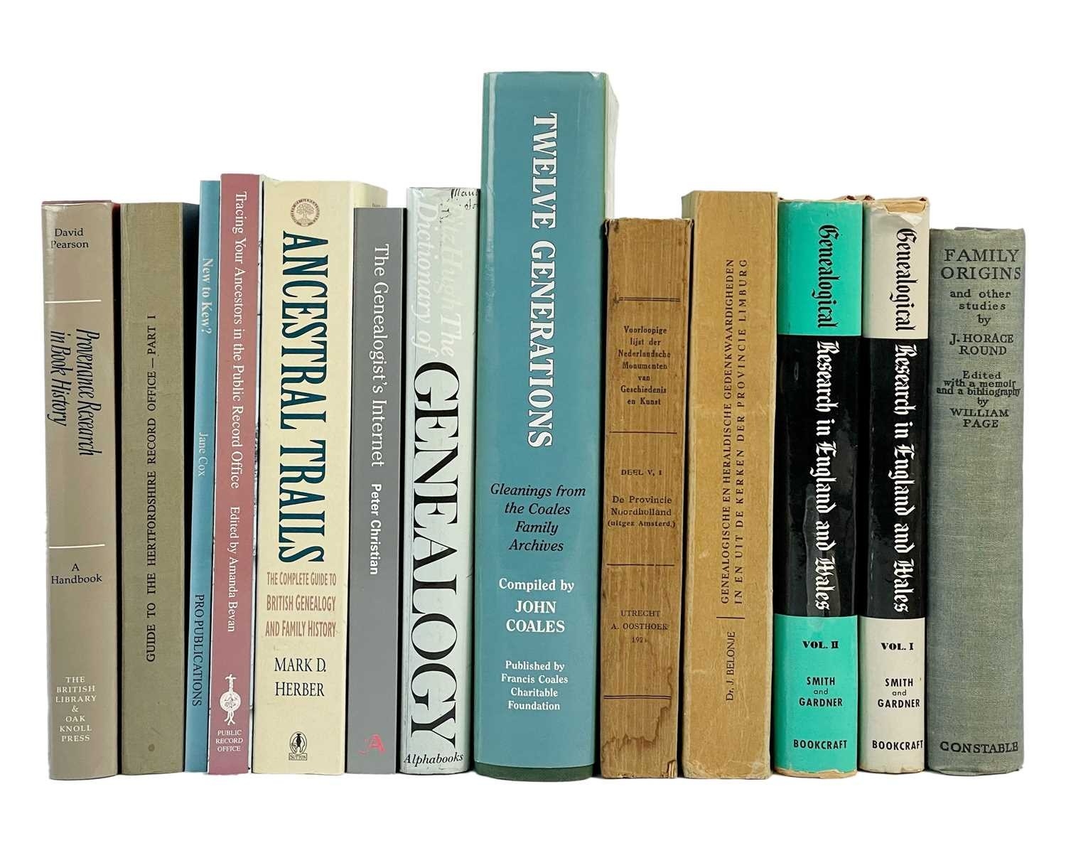 (Genealogy) Twenty-six works Includes William Page, 'Family Origins', Constable and Company Ltd, London 1930; two volumes of David Gardiner and Frank Smith, 'Genealogical Research in England and Wales', Bookcraft Publishers, Utah 1970; John Coales, 'Twelve Generations - Gleanings from the Coales Family Archives', Francis Coales Charitable Foundation, Somerset 2000; together with other works on western European heraldry, ancestry and provenance research, all vg. (26)