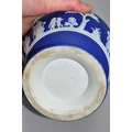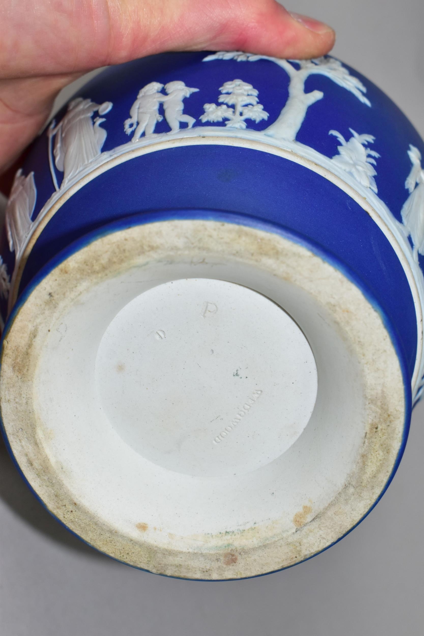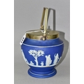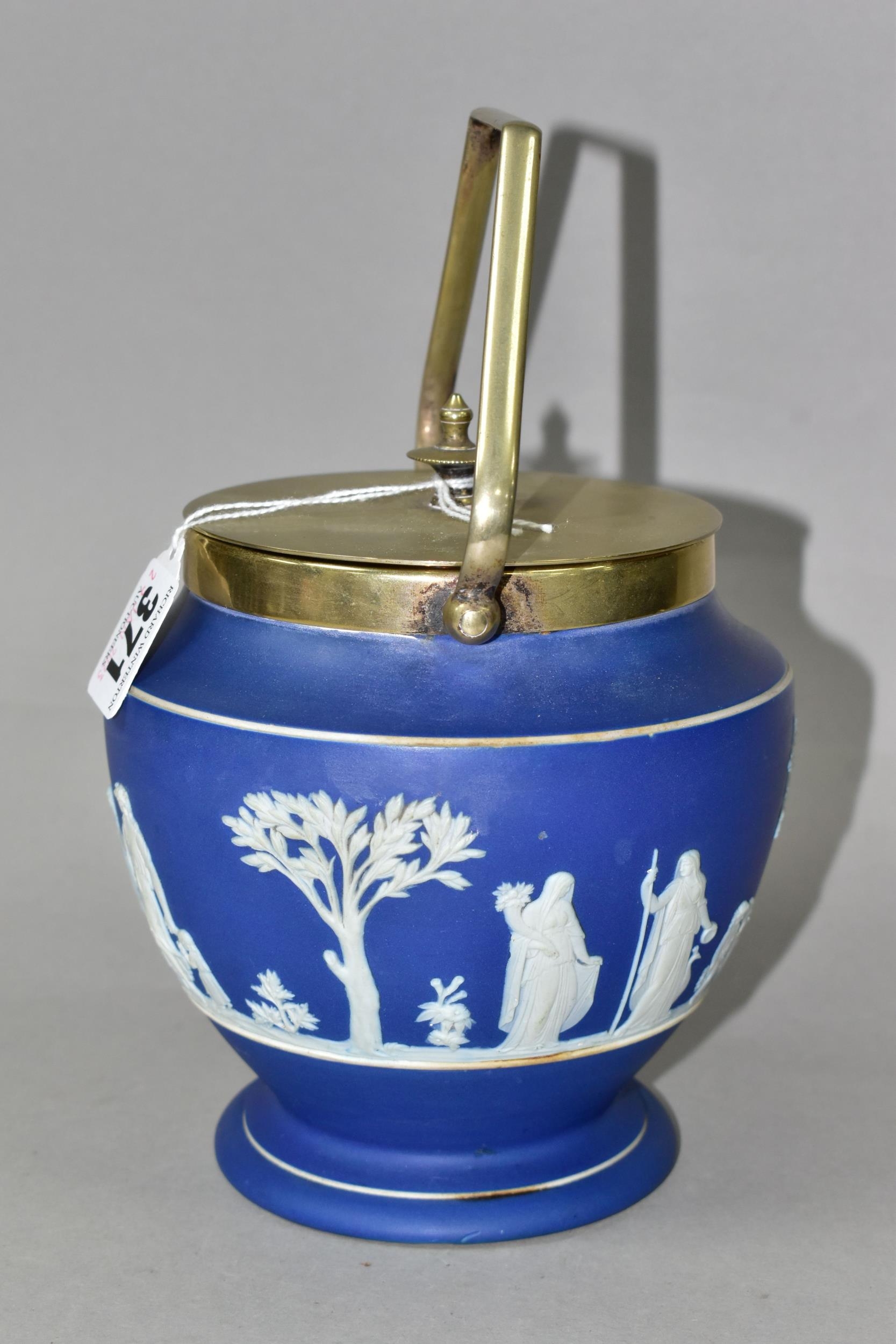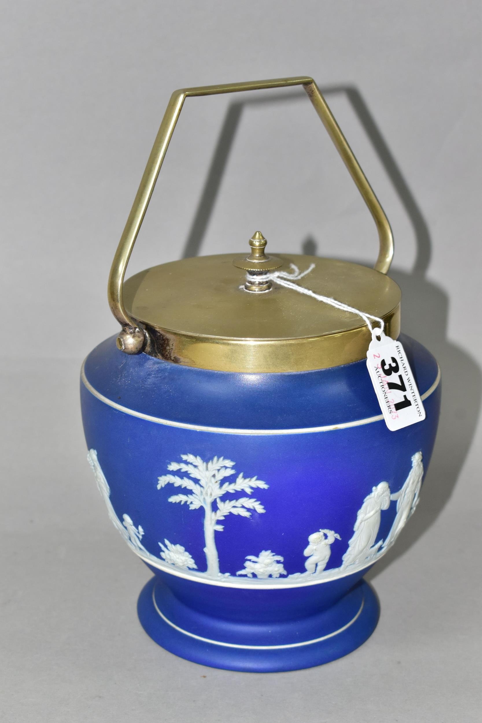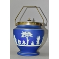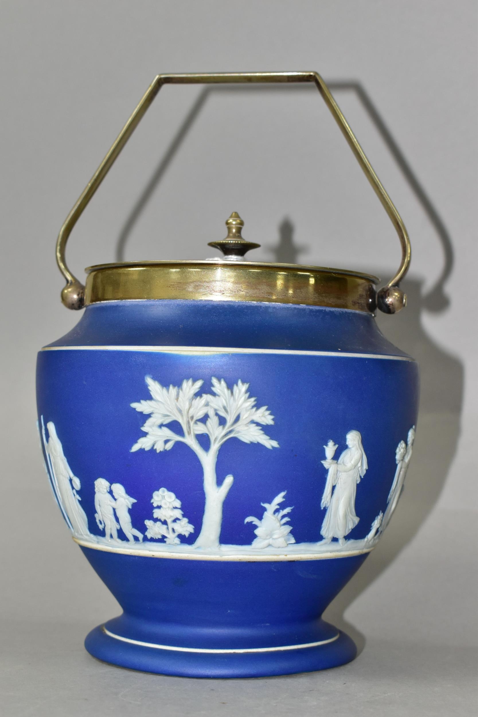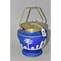 A WEDGWOOD BLUE DIPPED JASPERWARE BISCUIT BARREL, of shaped footed form, having a plated lid, handle and collar, impressed marks to base, height 17cm (1) (Condition Report: generally good condition, a few tiny nibbles to top of frieze, some factory cracks to applied decoration, some staining to interior)