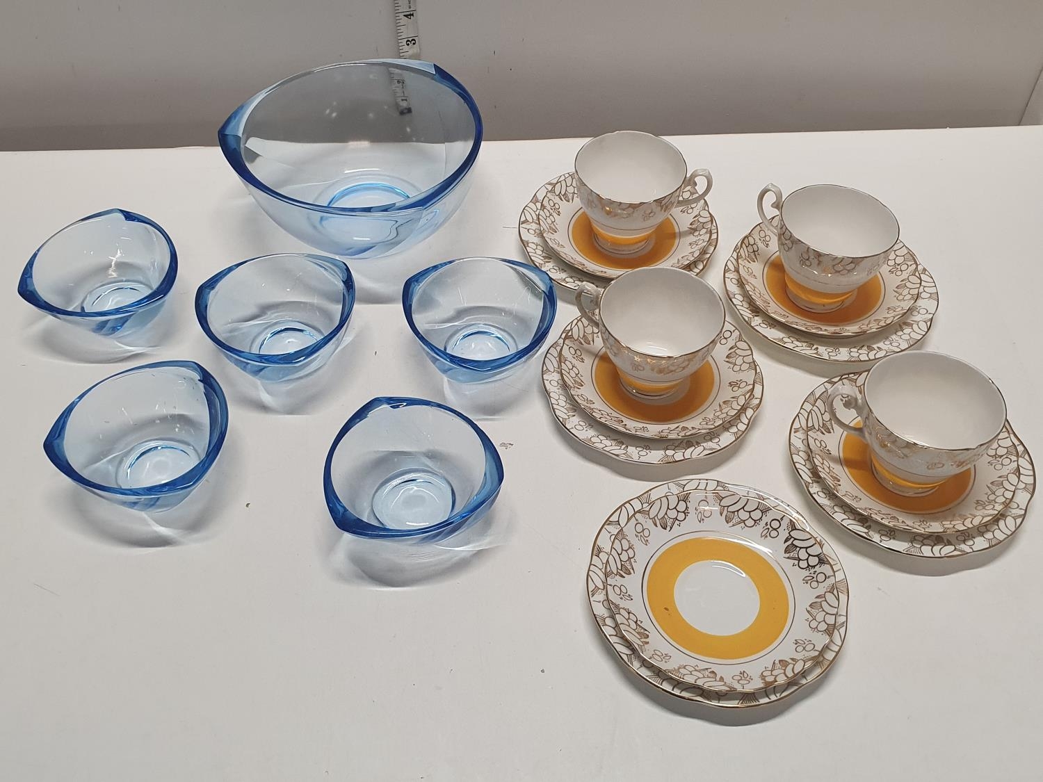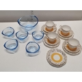 A Hamilton fine bone china tea service with some mid century blue glass bowls, shipping unavailable