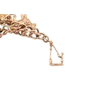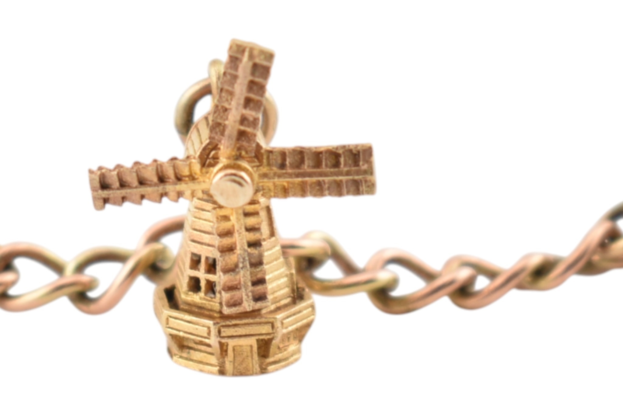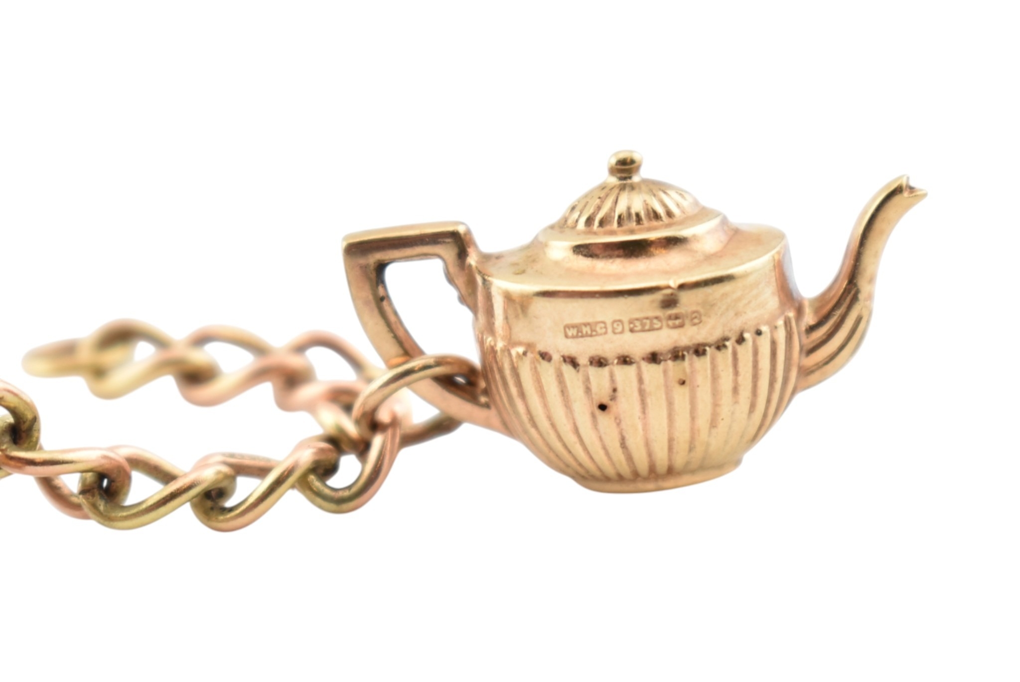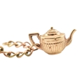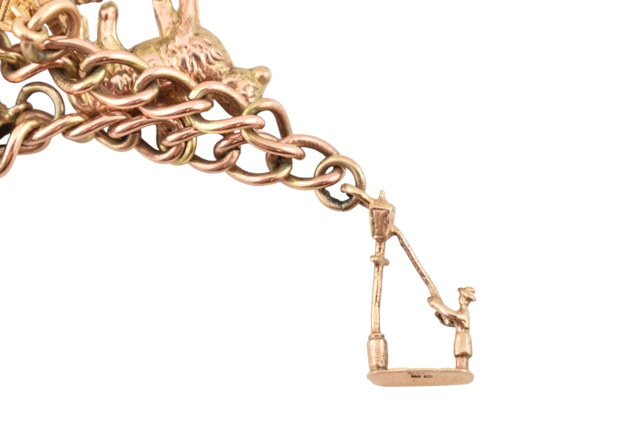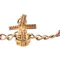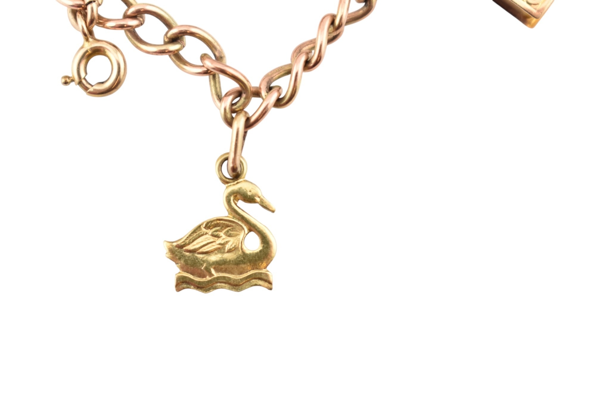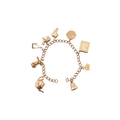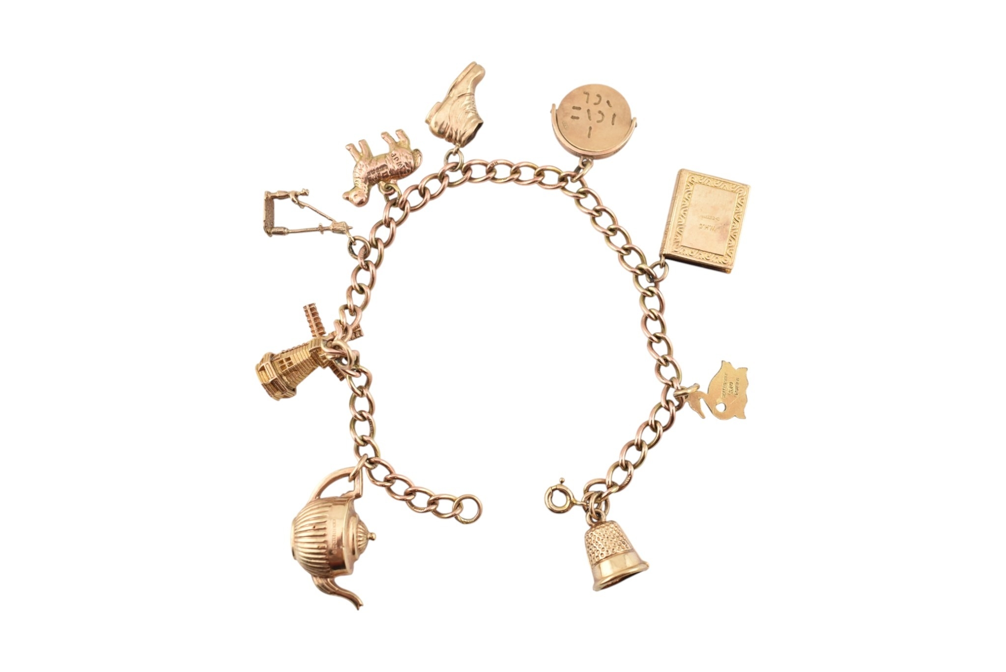 A 9ct gold charm bracelet. The bracelet strung with multiple charms to include a hallmarked bell, a Bible, I love you spinner charm, boot, sheep, lamp lighter, windmill, teapot. Rolled gold swan. Total weight 13.6g. Measures 17cm.