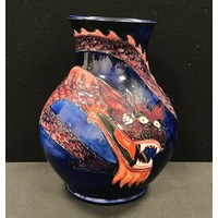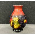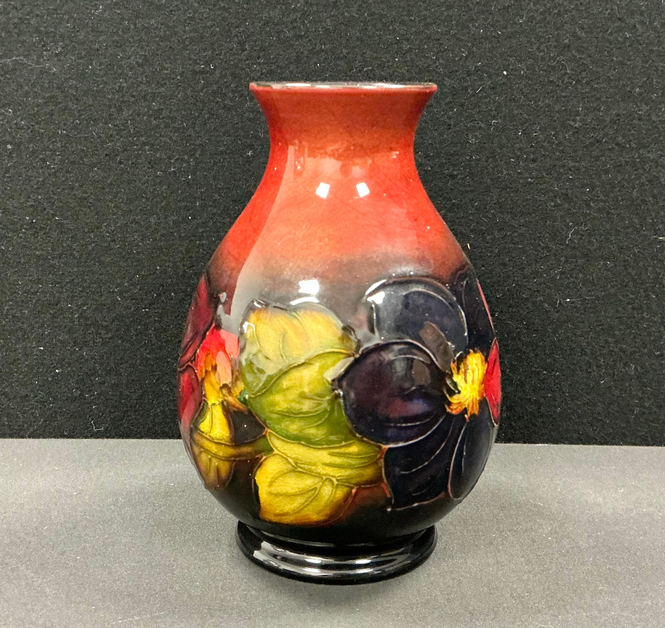 A Moorcroft flambe Clematis pattern ovoid vase, tube lined with leafy flowerheads in tones of red and green, 16cm high, impressed and painted marks