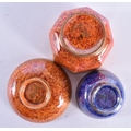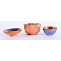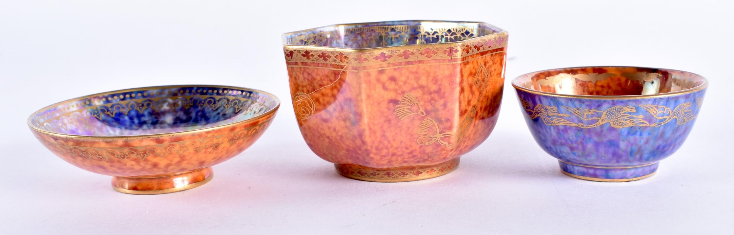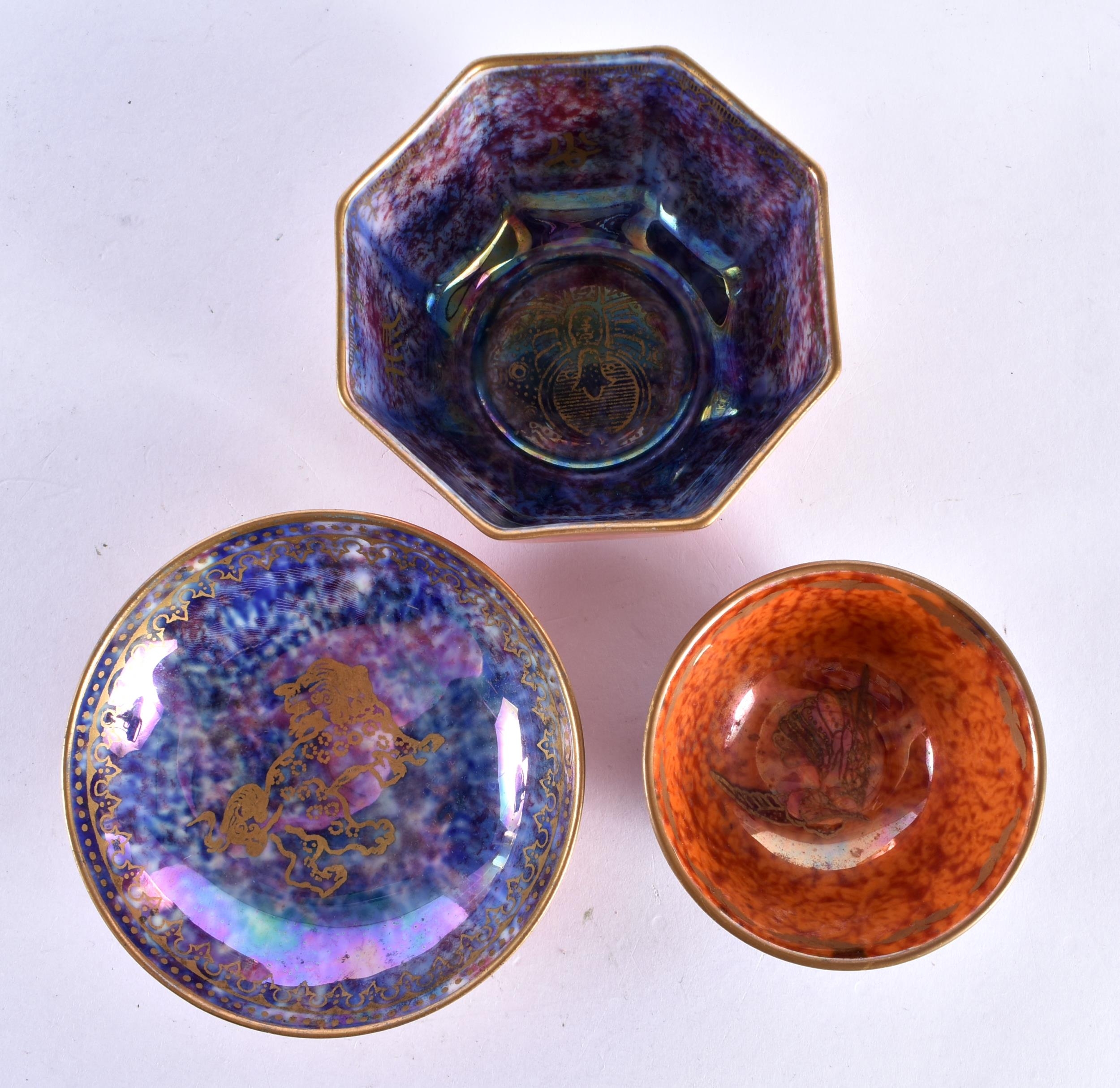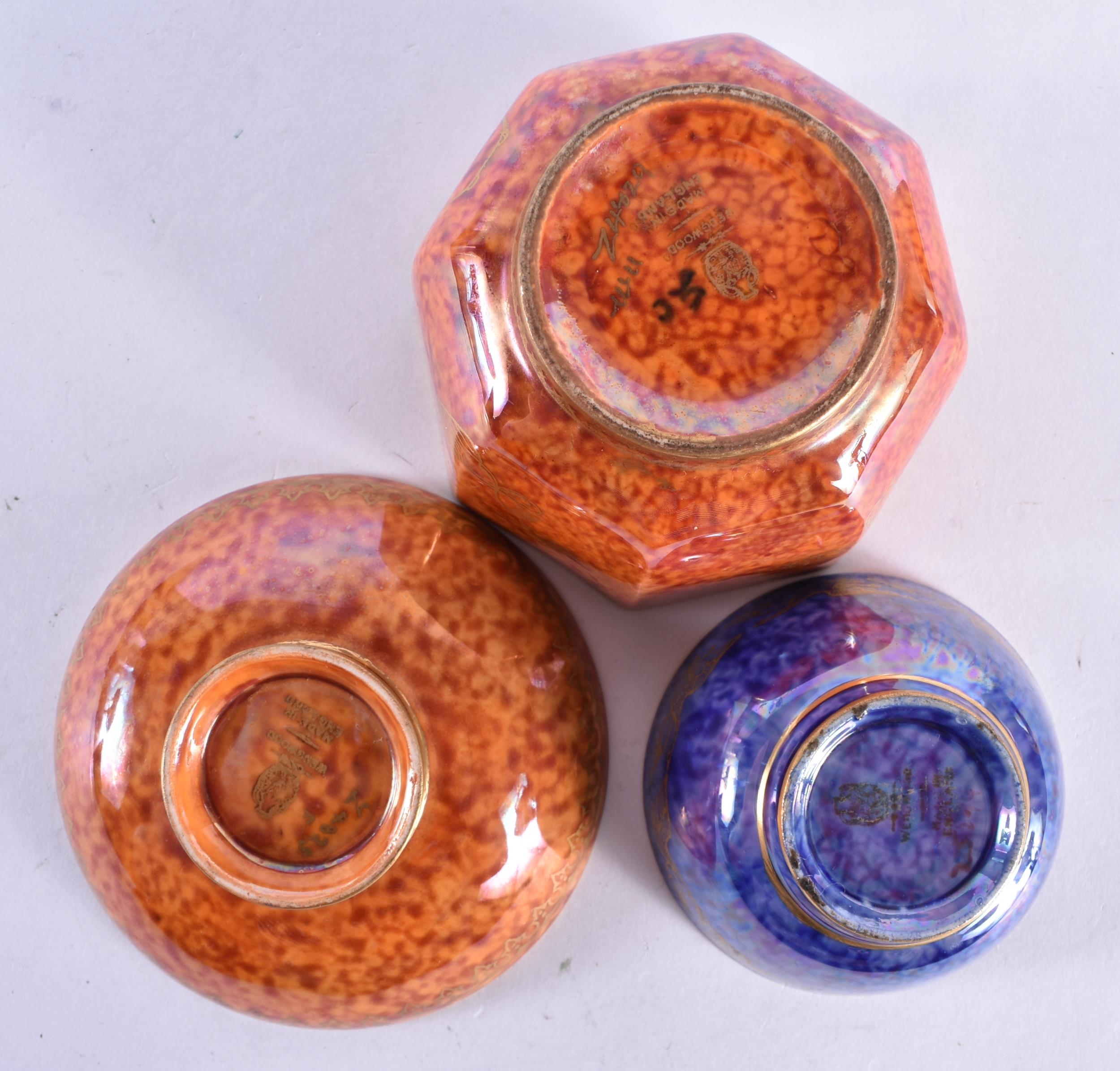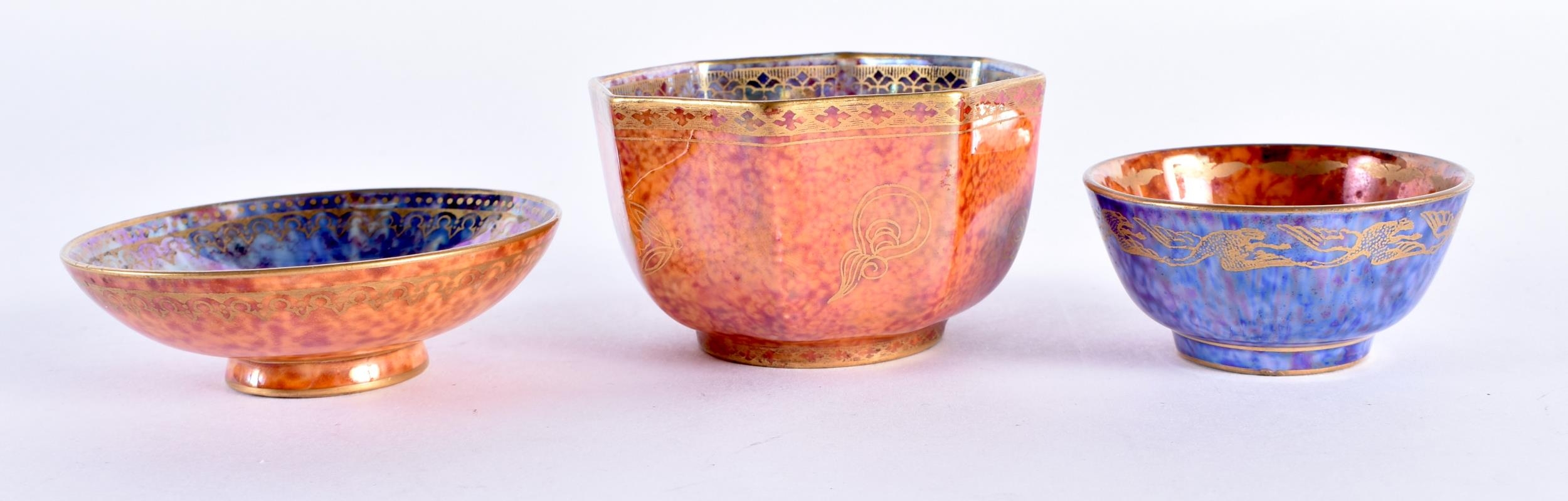 A WEDGWOOD ORANGE LUSTRE OCTAGONAL TEABOWL together with a similar teabowl and smaller dish. Largest 6.75 cm wide. (3)