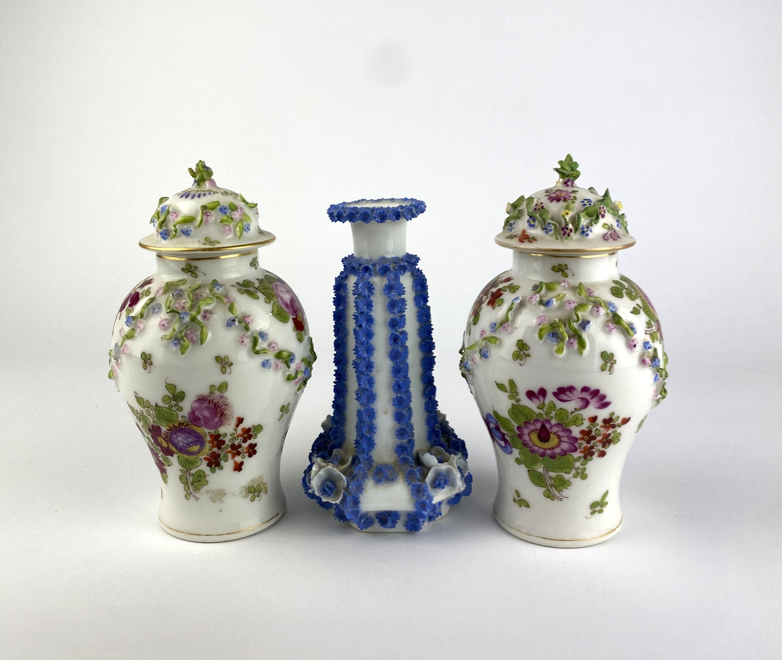A pair of continental porcelain vases and covers, possibly German, late 19th/ early 20th century, of baluster form, in the Meissen style, bearing cross swords mark to base, floral encrusted and decorated with floral sprays, height 15cm, together with a continental floral encrusted porcelain vase / candle holder, with impressed X to base, height 13cm (3)