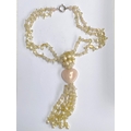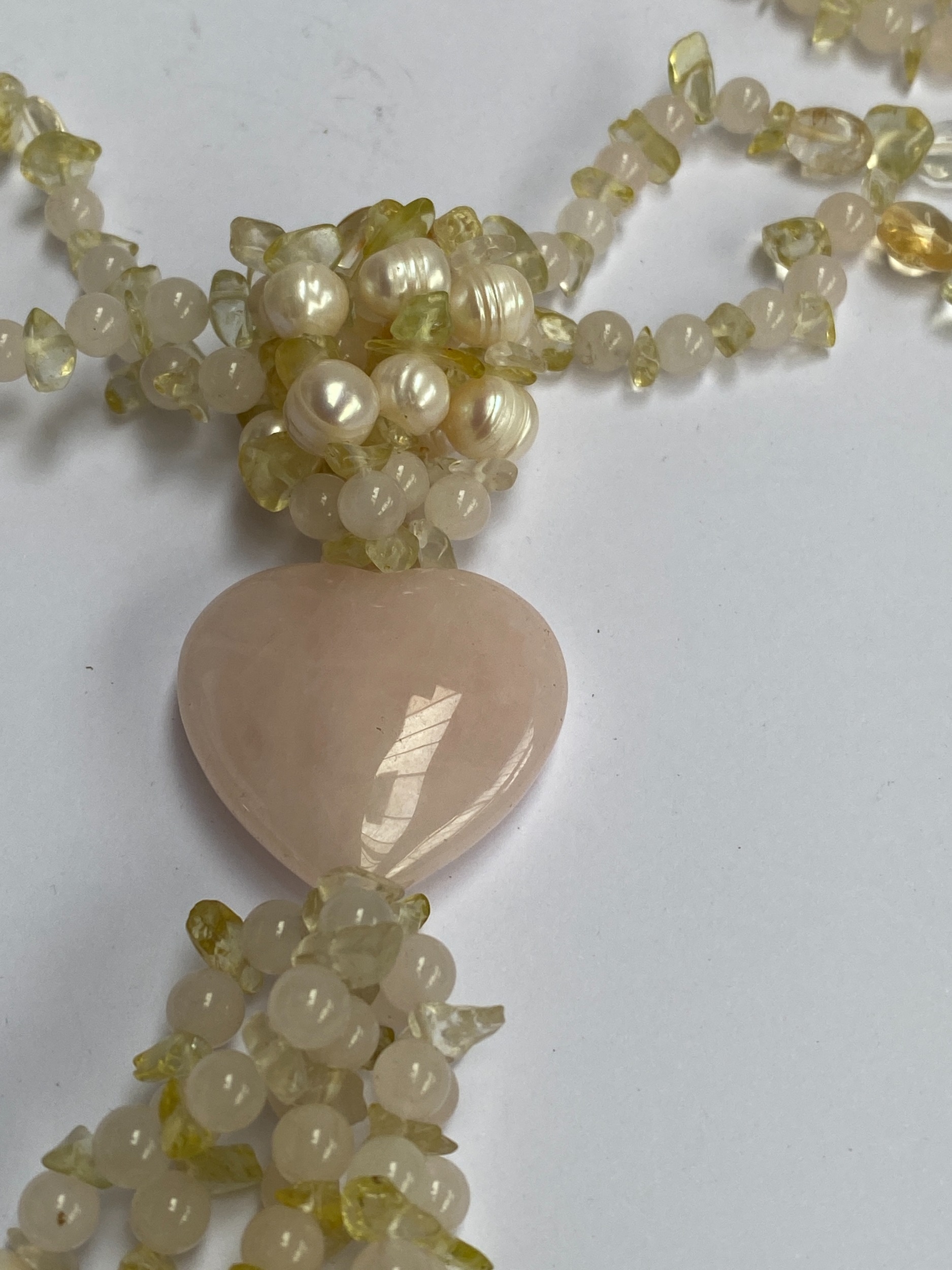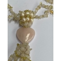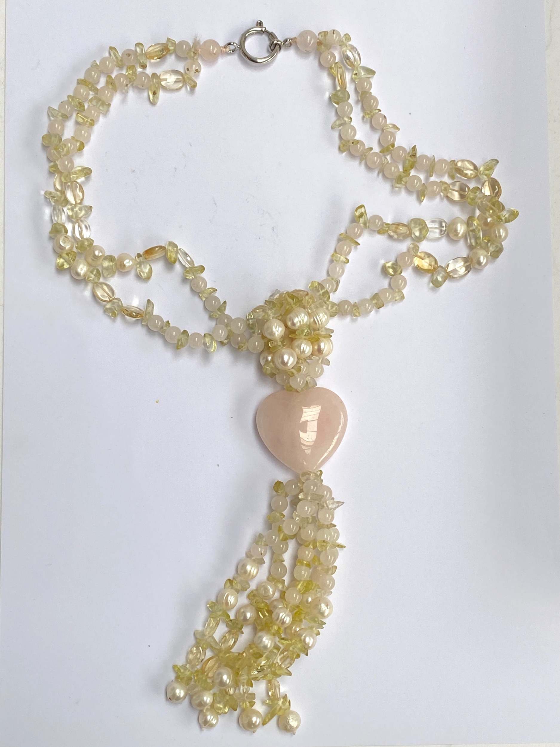 A rose quartz, citrine and cultured pearl necklace, with central rose quartz heart pendant suspending tassels, fastening with a white metal bolt clasp, 45cmL unclasped