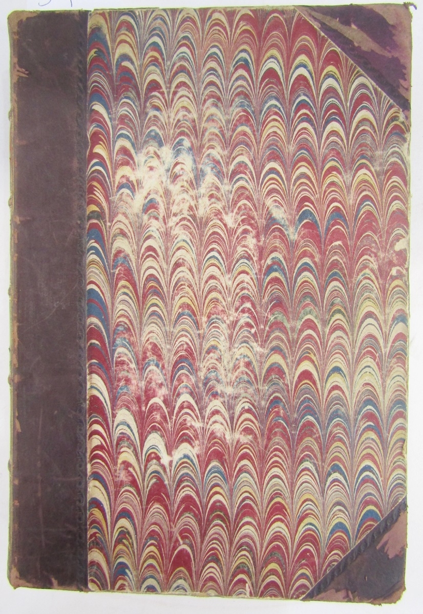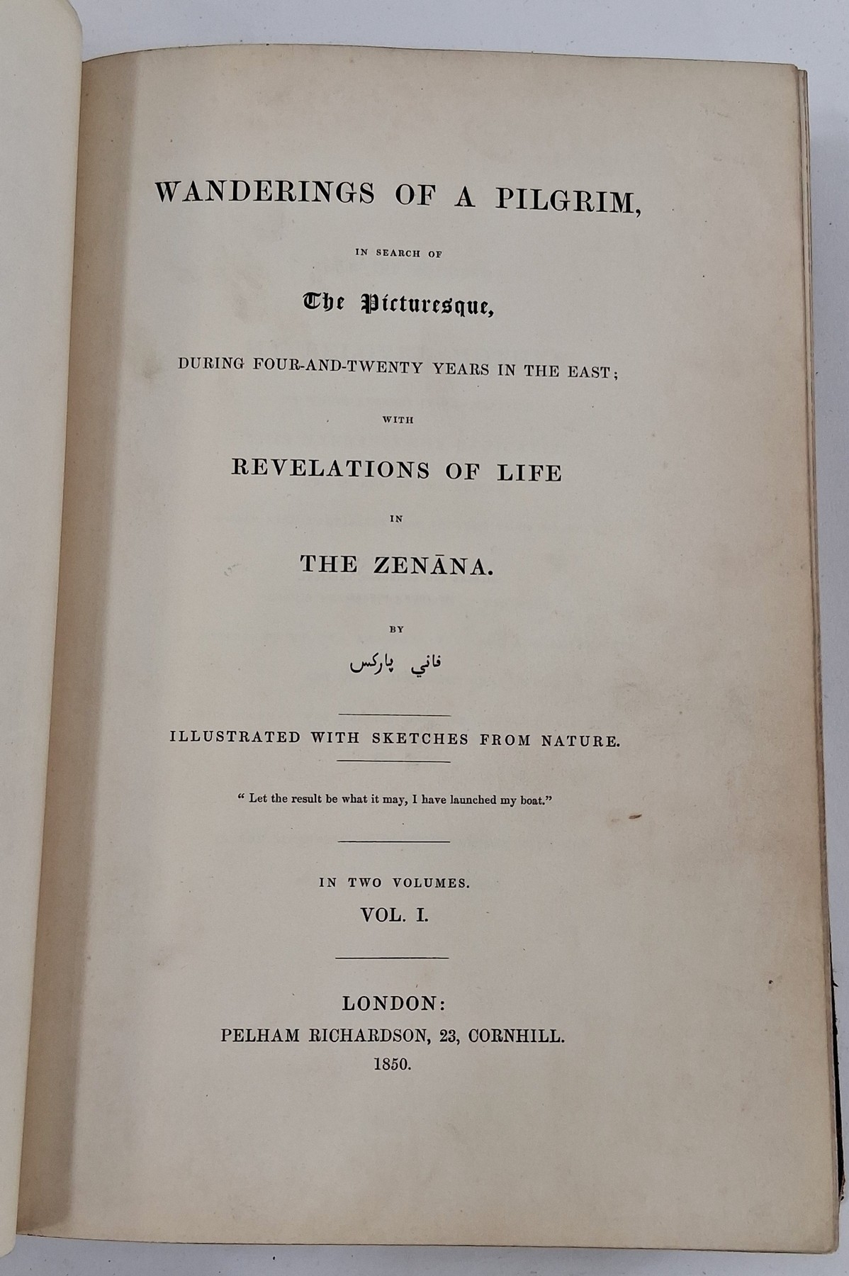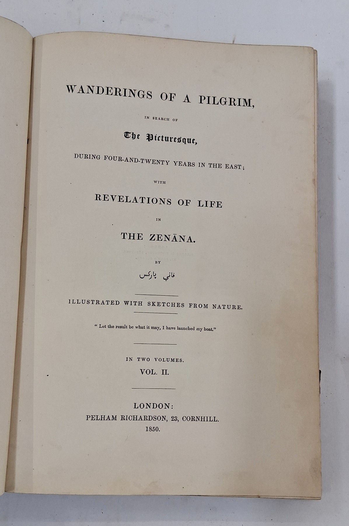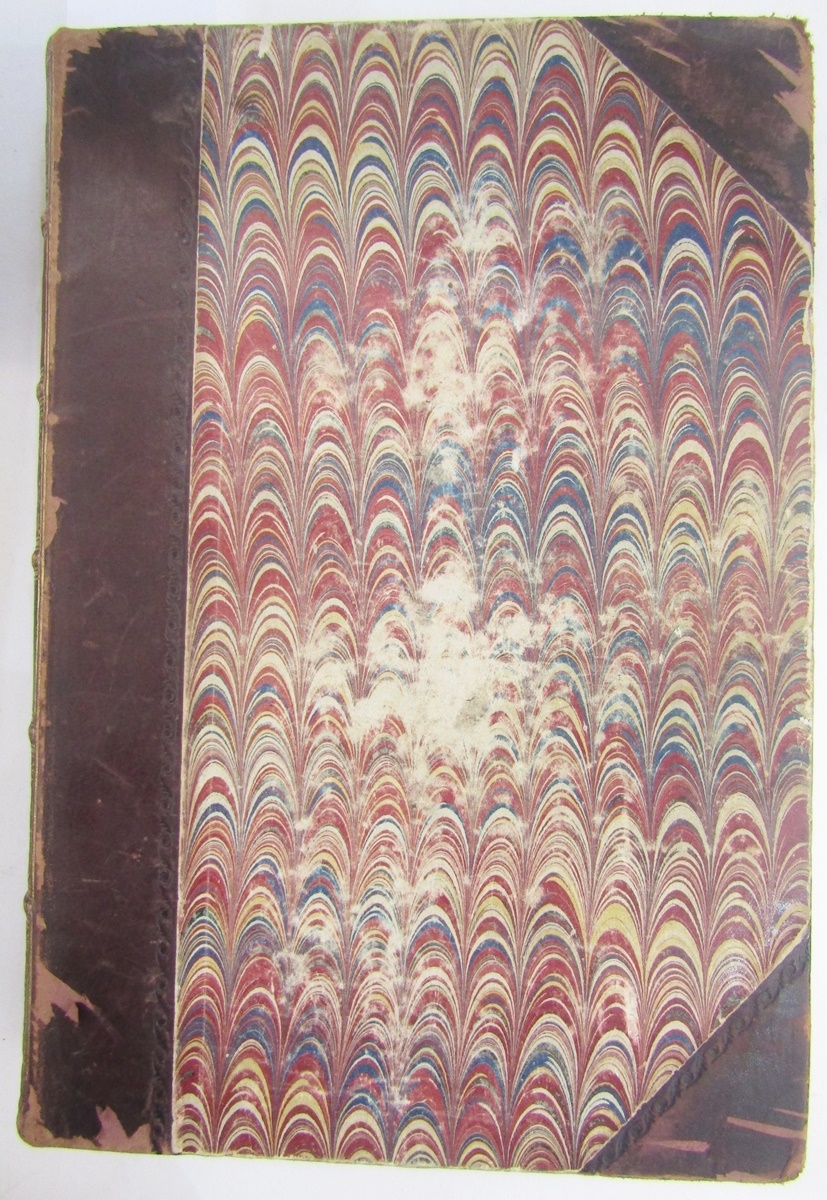 Parks, Fanny (Frances Susanna Archer 1794-1875) 'Wanderings of a Pilgrim in Search of the Picturesque during four and twenty years in the East; with revelations of life in the Zenana', two volumes, Pelham Richardson 1850, colour frontis to both volumes with tissue guard, colour plates and plates with tissue guards, half leather over marbled boards, gilt decorations and raised bands to back strips, paste down titles in green and red leather, marbled edges, marbled end papers, book plates inside front boards, the boards and corners rubbed, the text and plates are clean (2). Now collated - 'The Elevation of the Himalaya' is not present in vol II, all other plates are present as listed in both volumes