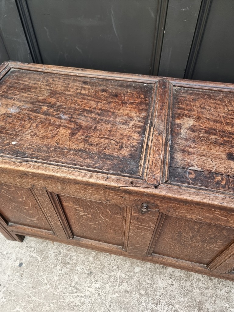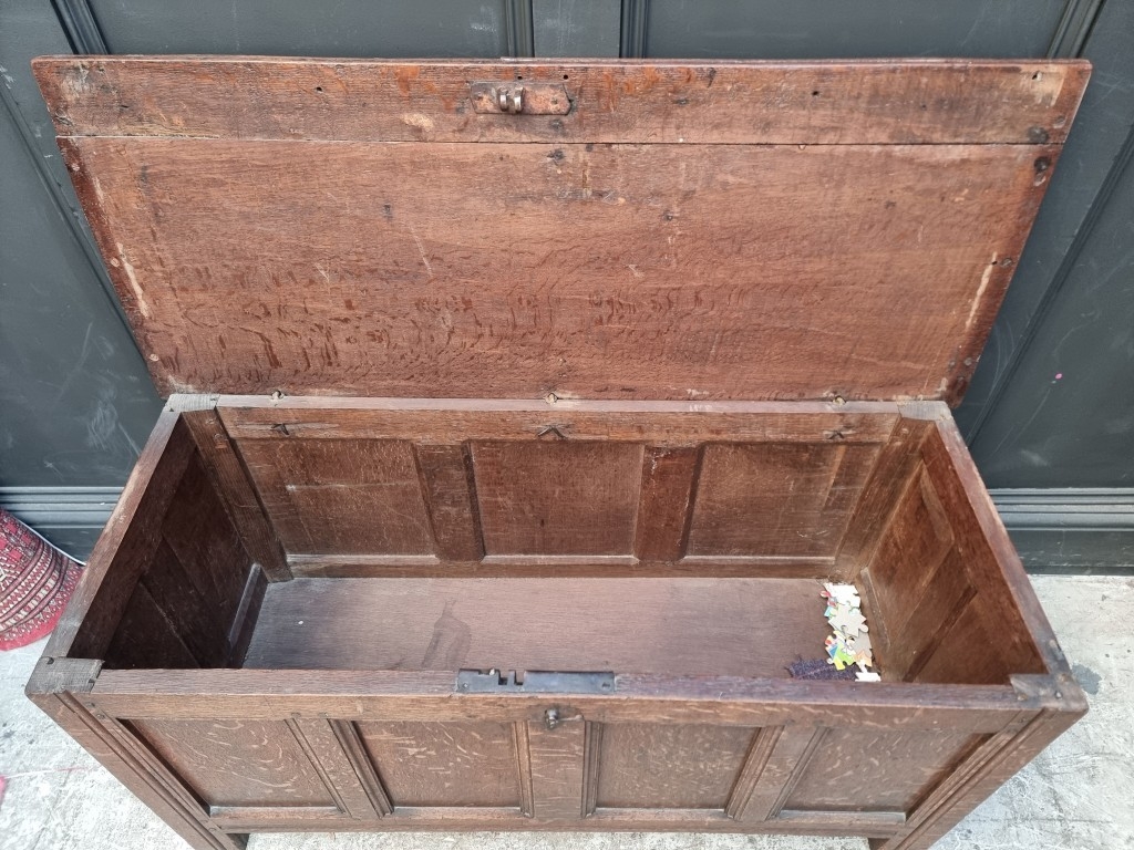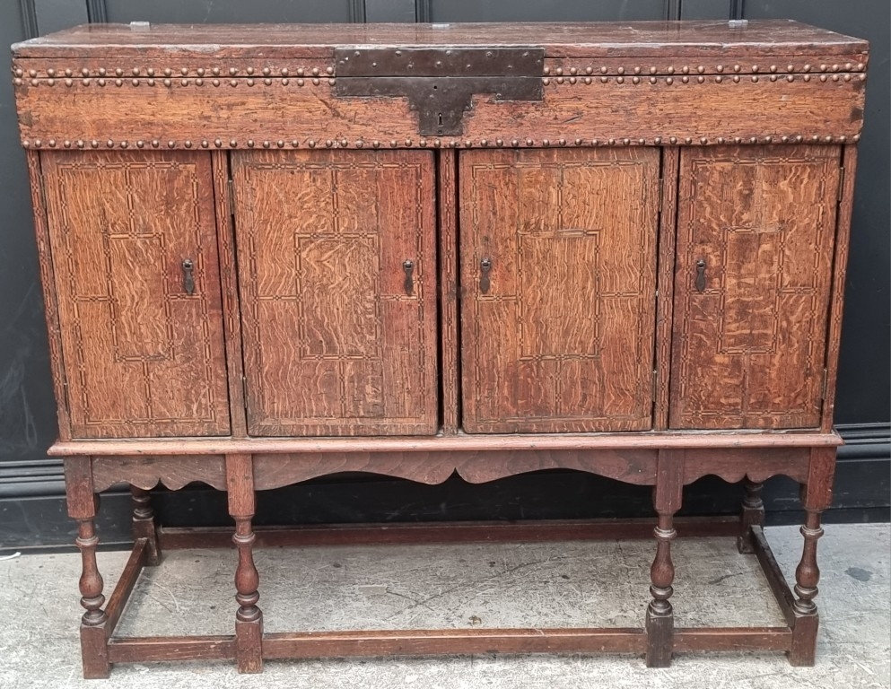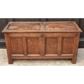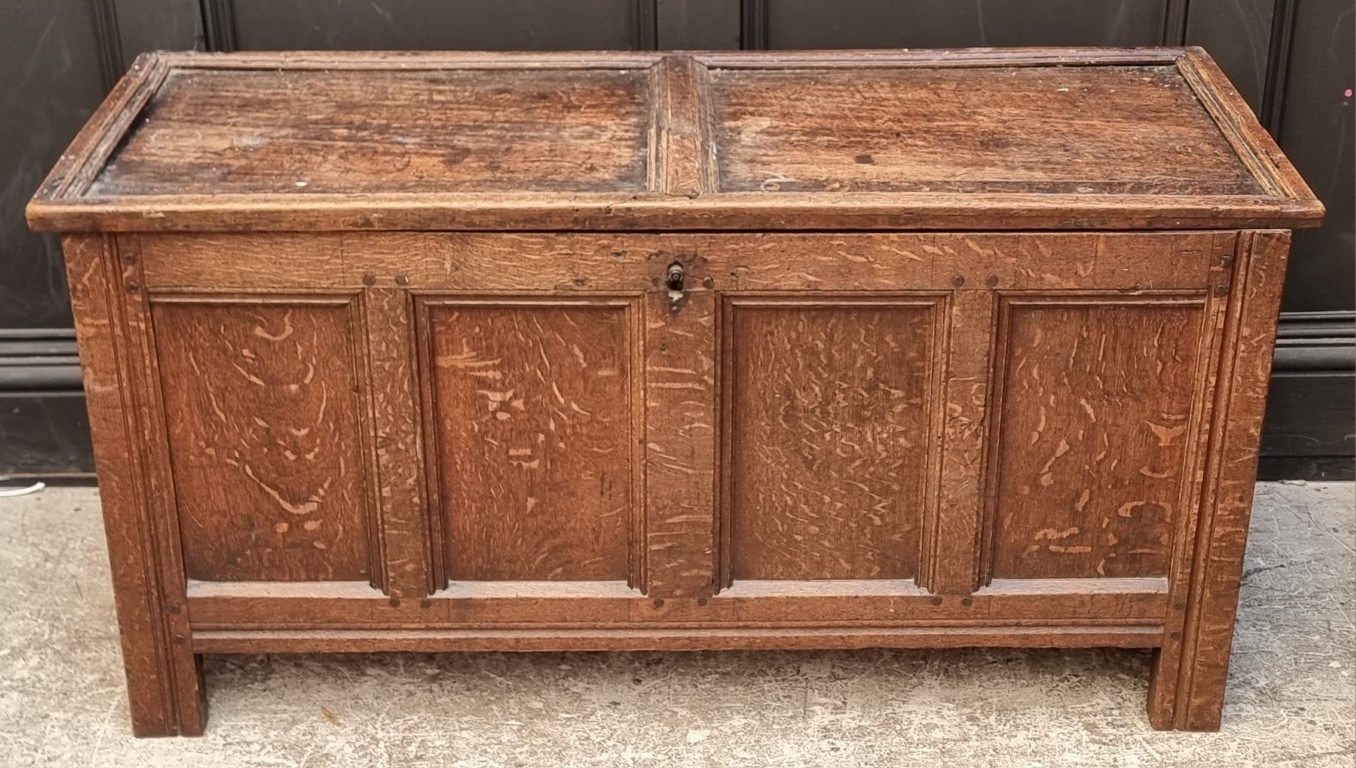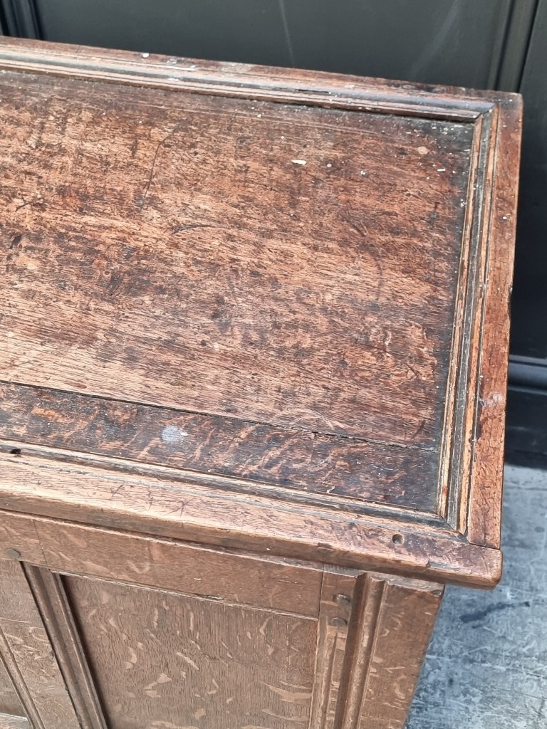 A late 17th century oak panelled coffer, 114cm wide, (wormed); together with another oak side cabinet, 128.5cm wide. (2)