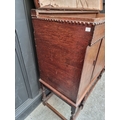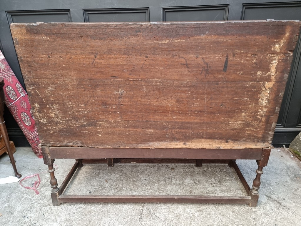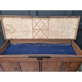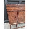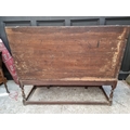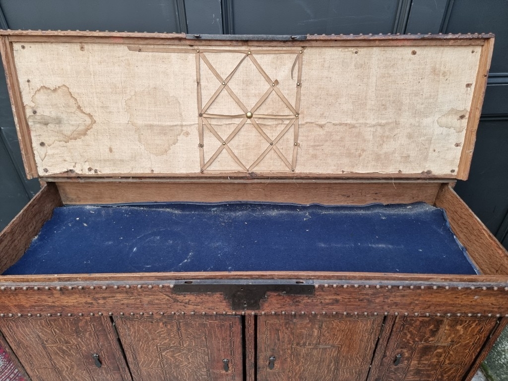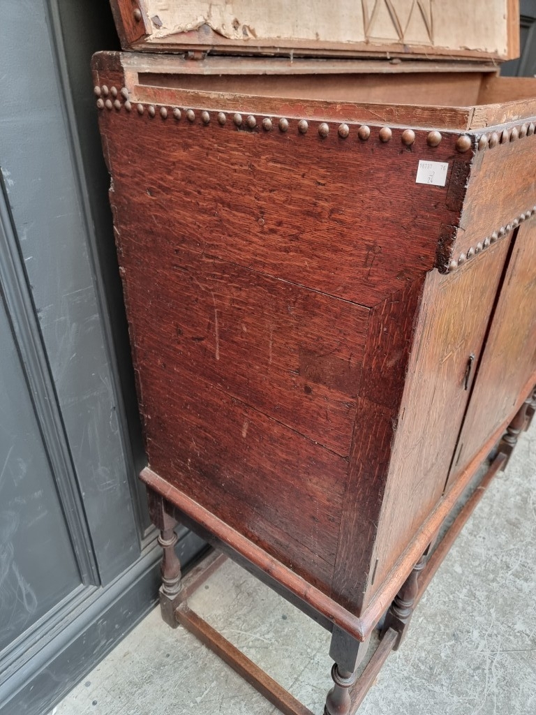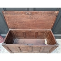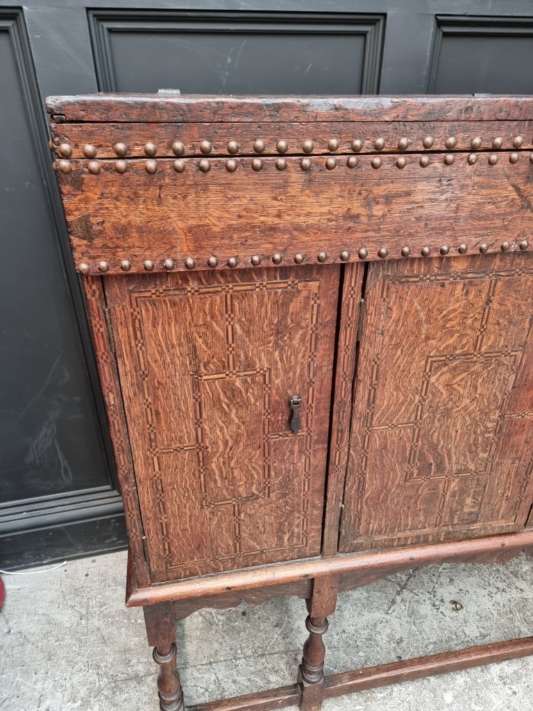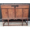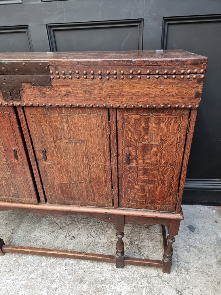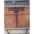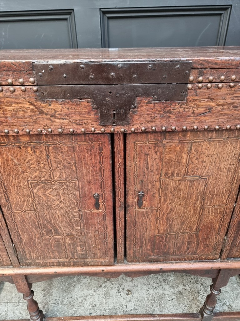 A late 17th century oak panelled coffer, 114cm wide, (wormed); together with another oak side cabinet, 128.5cm wide. (2)