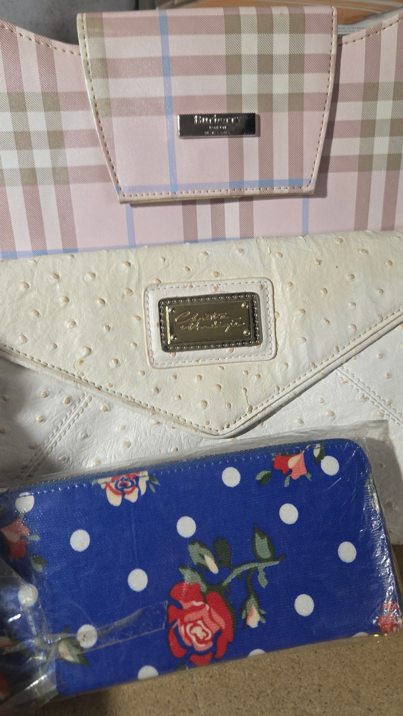A Trio of Fashion Handbags and a Patterned Wallet